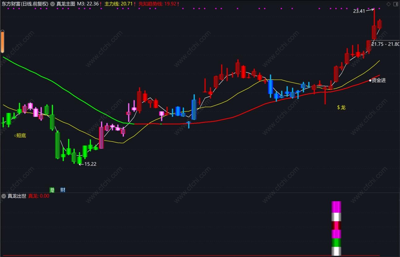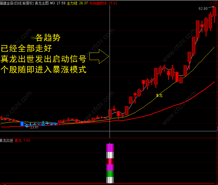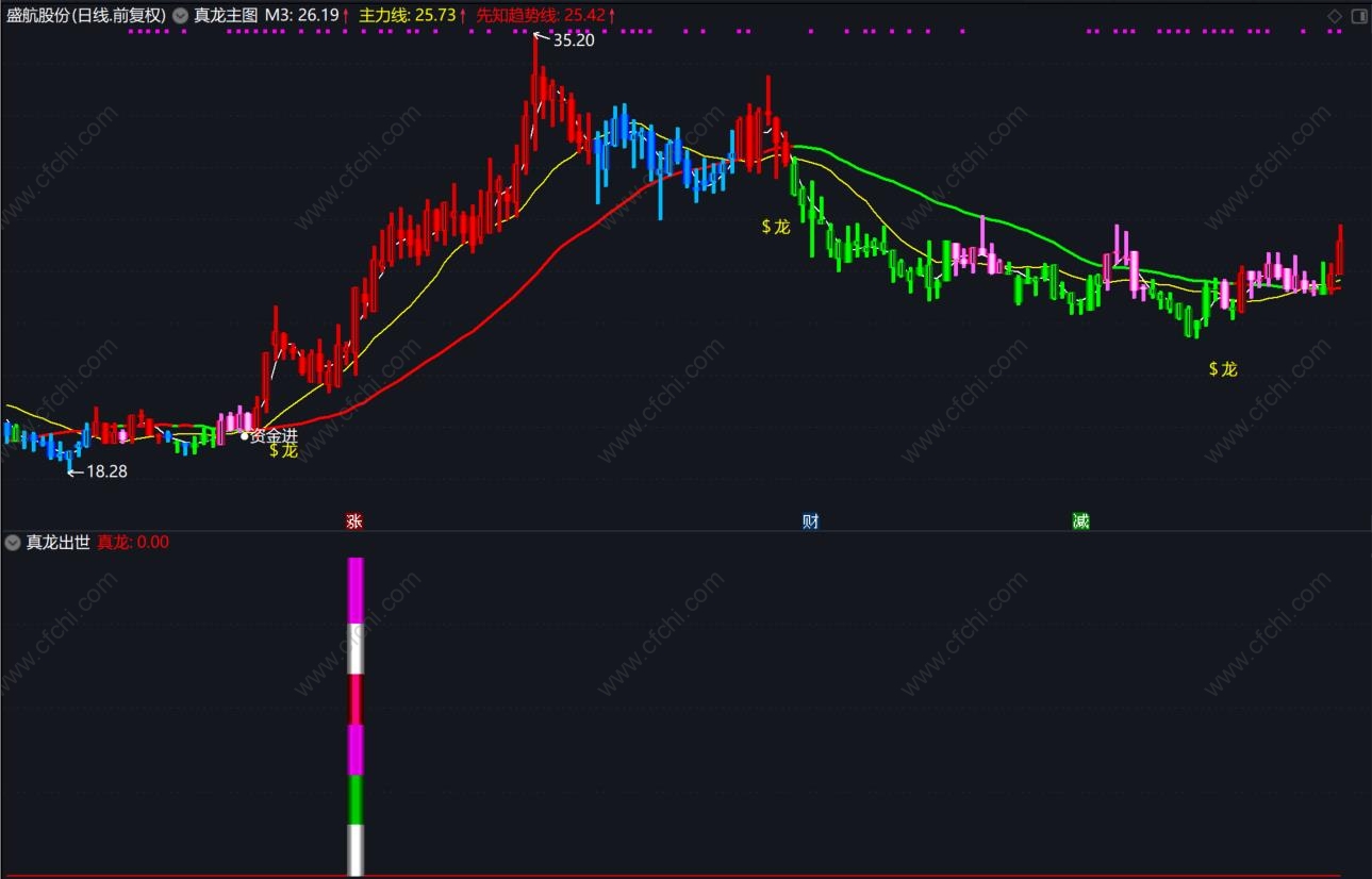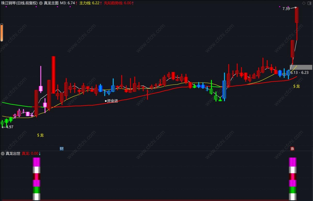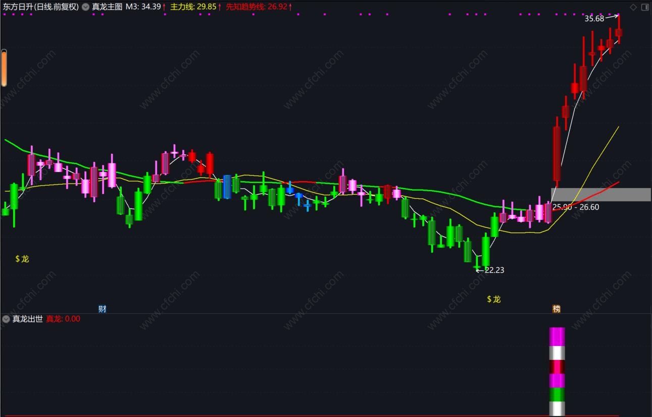 真龙主图由短中长三条指标线,也即趋势线,和几组彩色K线组成,短线趋势攻击性强,长线趋势线变红,趋势转强,变绿则趋势走弱,K线色彩分明,粉色短线走强,红色中线走强,蓝色短线走弱,绿色中线走弱。。。通俗易懂。