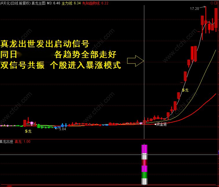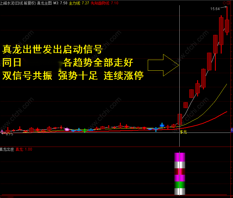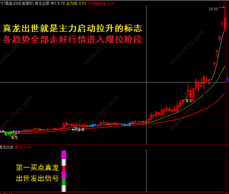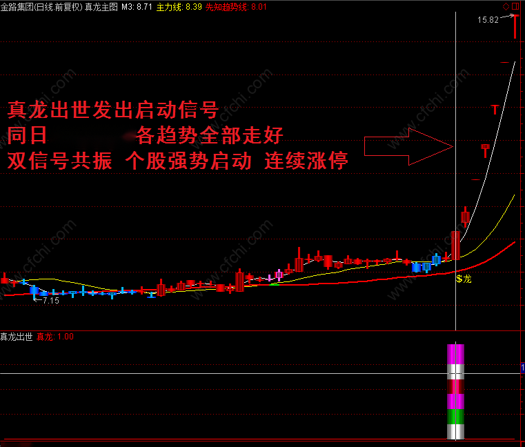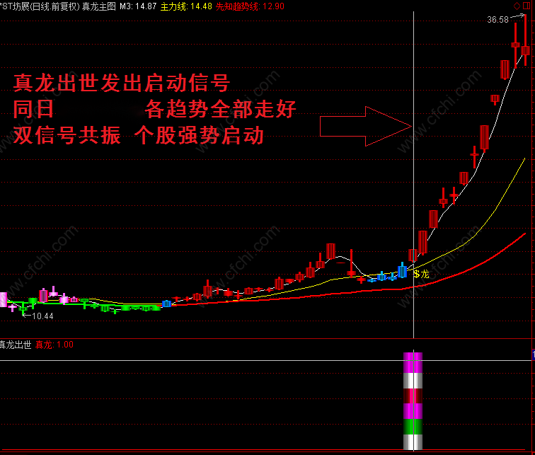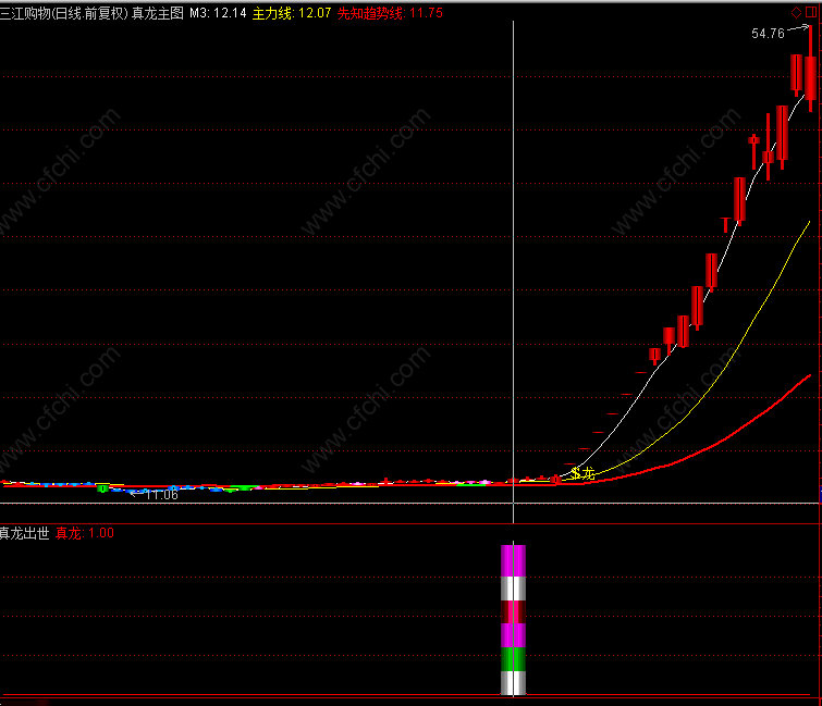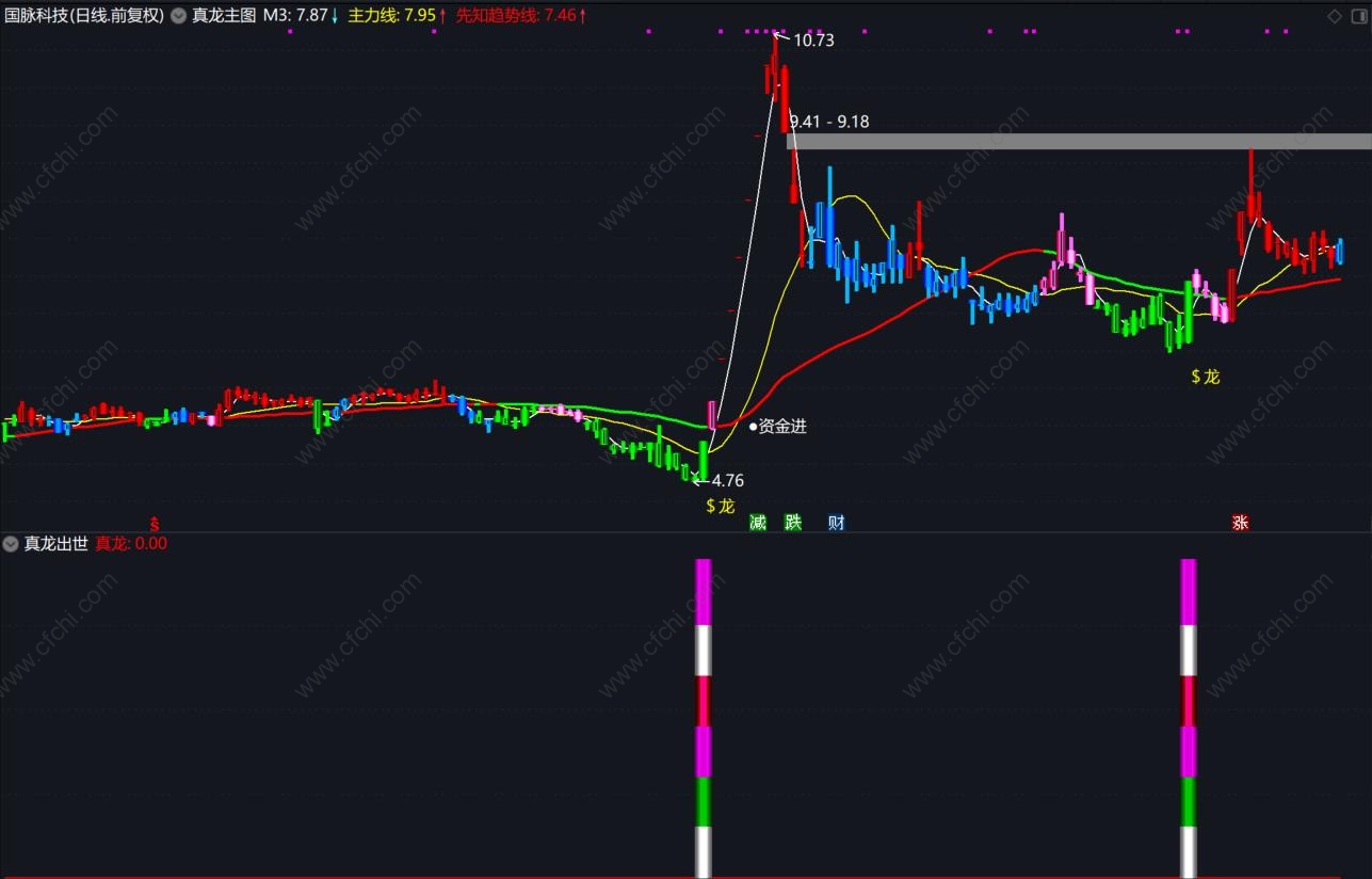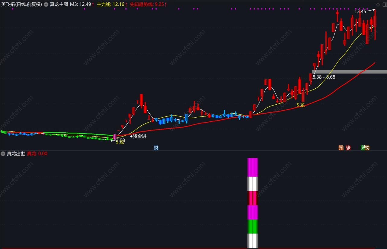 真龙主图由短中长三条指标线,也即趋势线,和几组彩色K线组成,短线趋势攻击性强,长线趋势线变红,趋势转强,变绿则趋势走弱,K线色彩分明,粉色短线走强,红色中线走强,蓝色短线走弱,绿色中线走弱。。。通俗易懂。