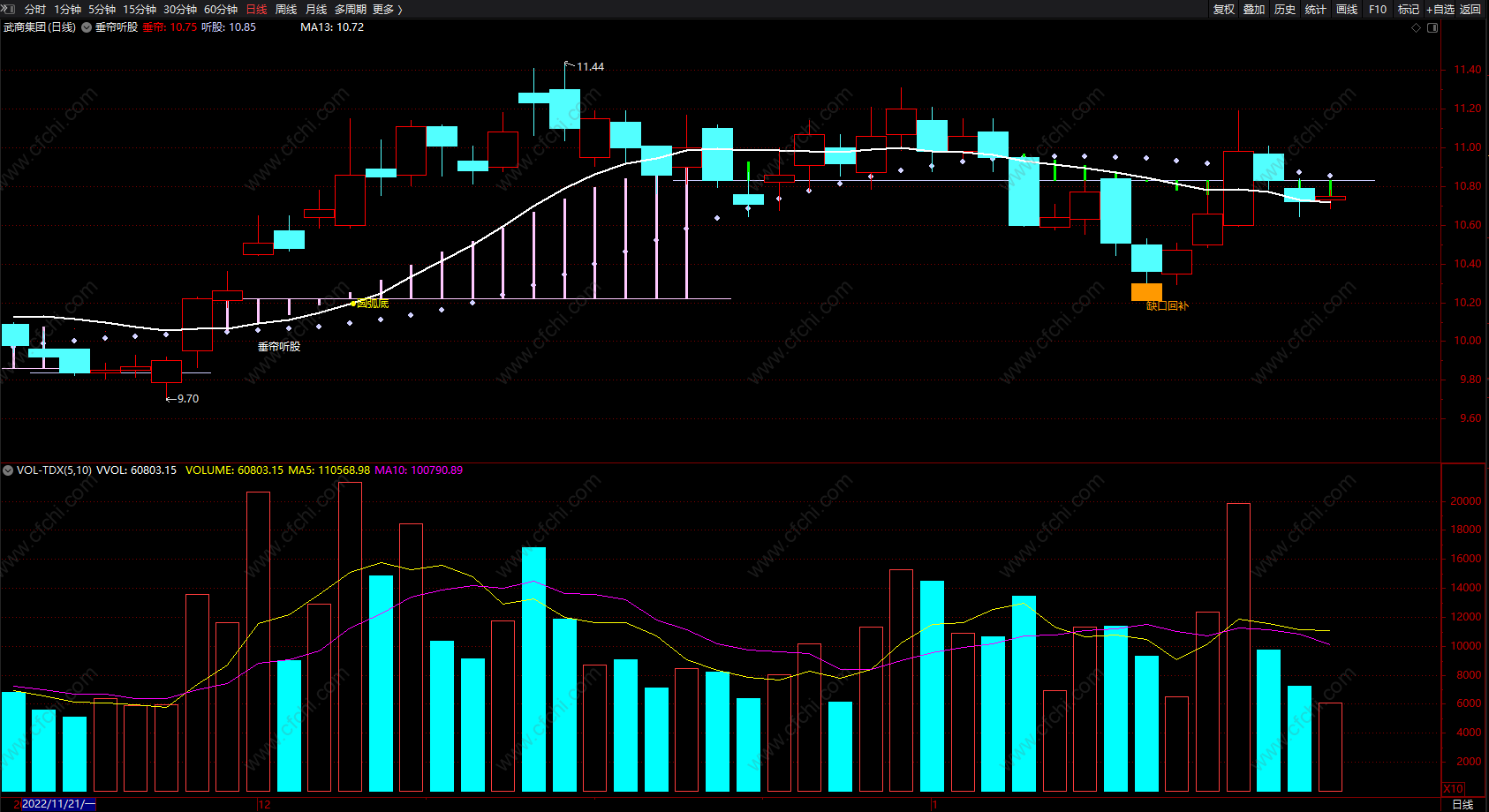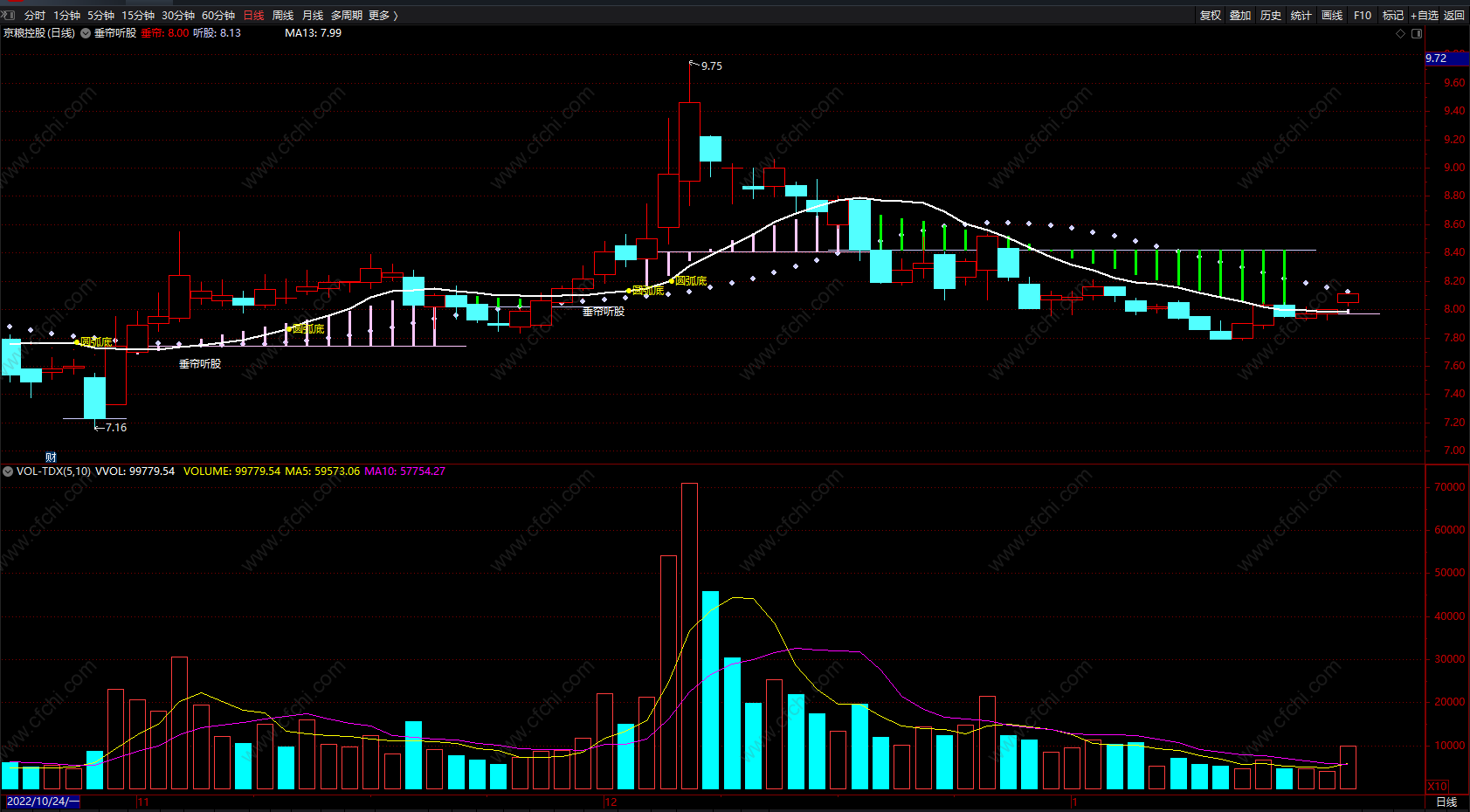 DRAWTEXT(CROSS(MA5,听股) AND MA5>听股 AND C>O,MA13-0.12,'垂帘听股'),COLORWHITE;