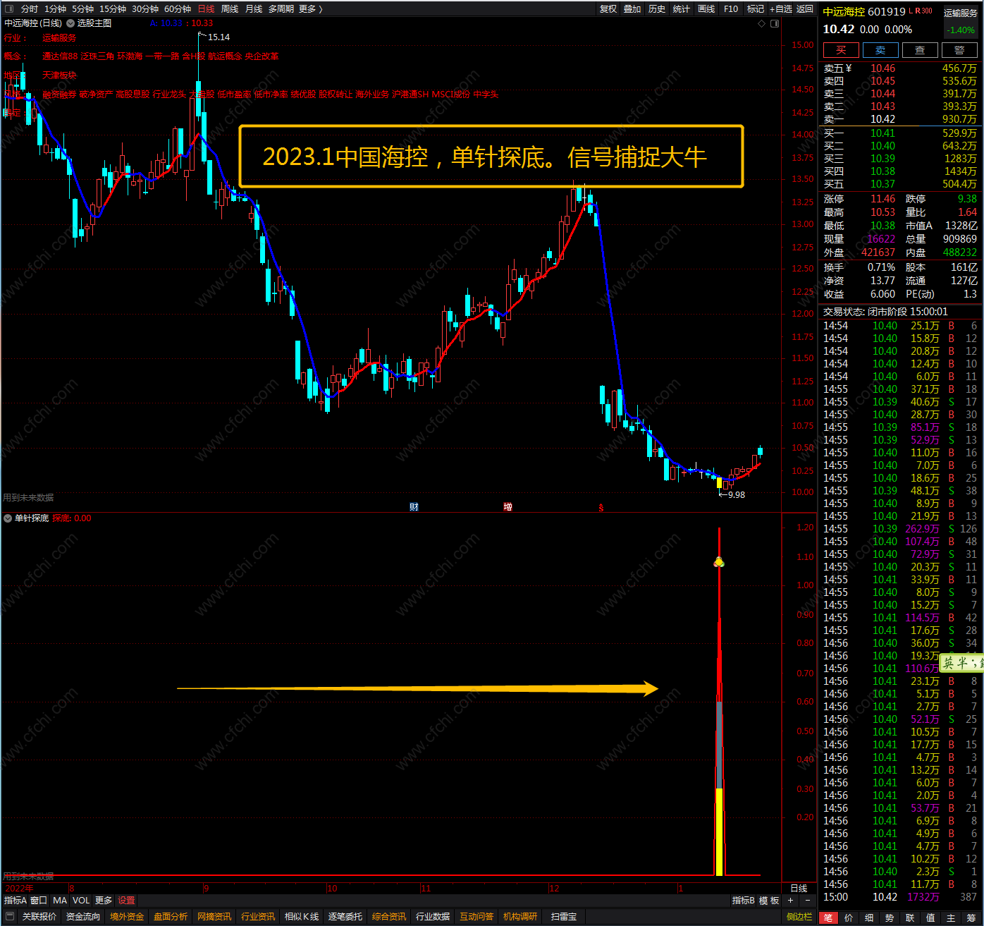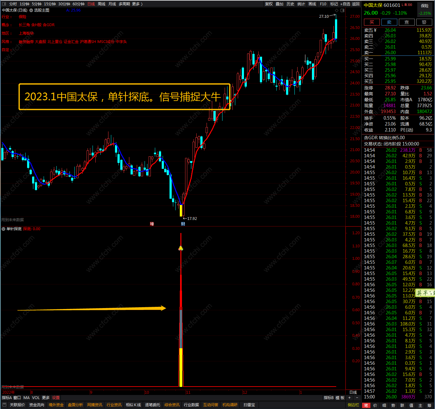 这种K线一般出现在市场极度低迷时期,投资者处于迷糊阶段,而主力利用了投资者的盲点悄然进货。所以,单针探底是主力建仓的特征之一。主力一旦建仓完毕。就是“单针探底”起爆,反弹一触即发,黎明前的黑暗!