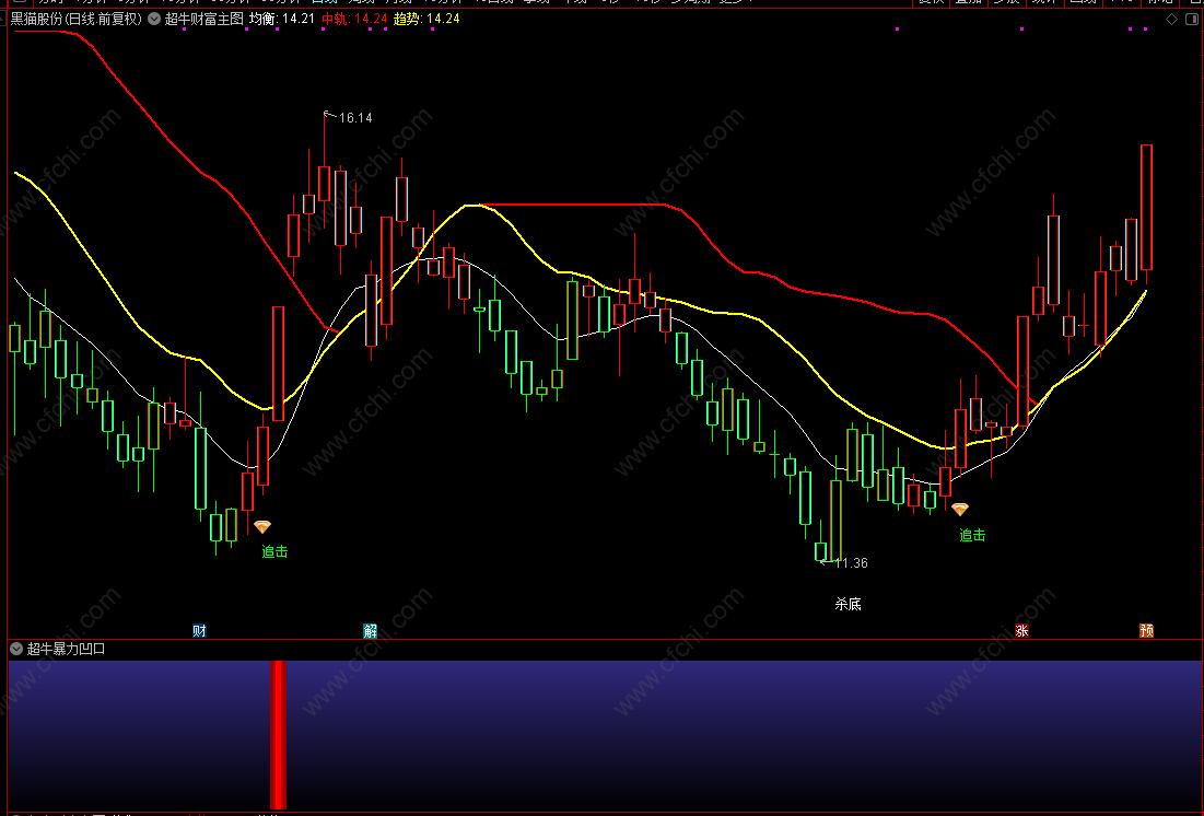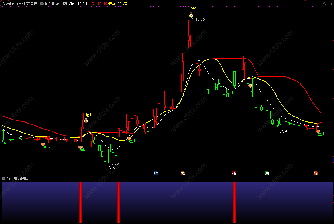 (通达信超牛财富主图+超牛暴利凹口副图指标,探寻阶段起势票源码分享)