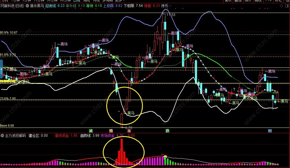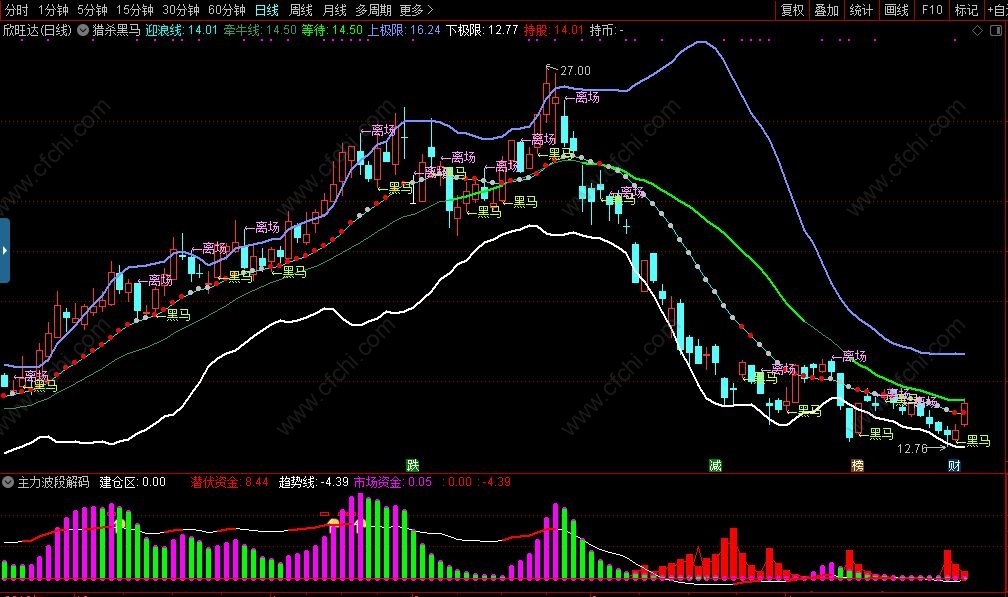 此指标是布林袋优化而来 ,趋势线上穿中线代表企稳的大行情出现,同时下方会提示黑马字样;
