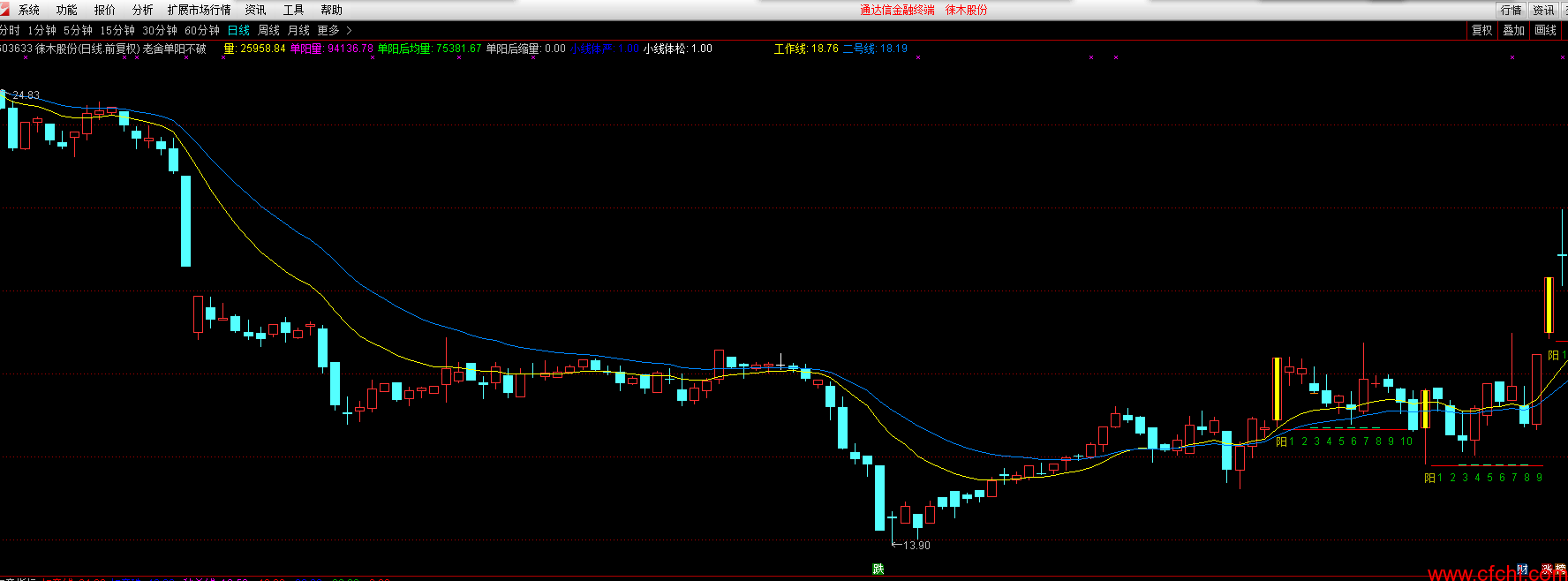工作线:EMA(C,14),COLOR00FFFF,LINETHICK1;