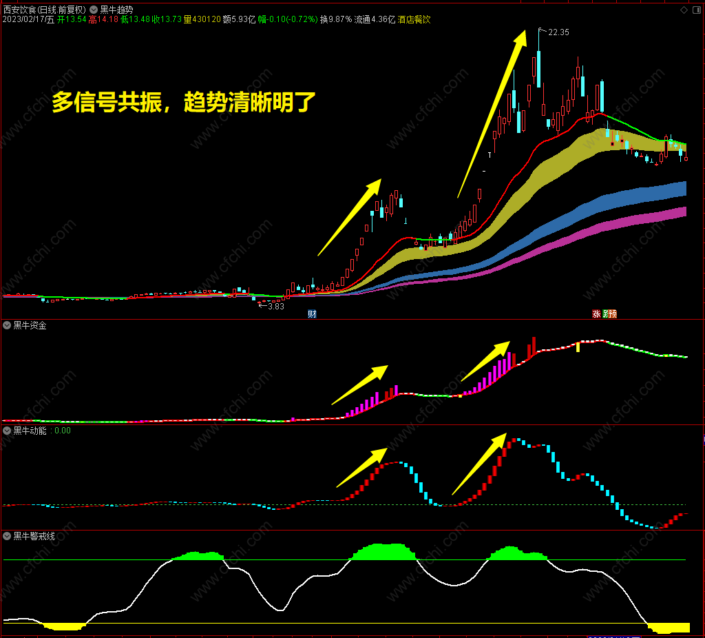 1、通过金牛经典战法主图黑牛趋势功能来判断个股的趋势、压力支撑、强弱度,只有上升趋势的个股才有赚钱的机会;