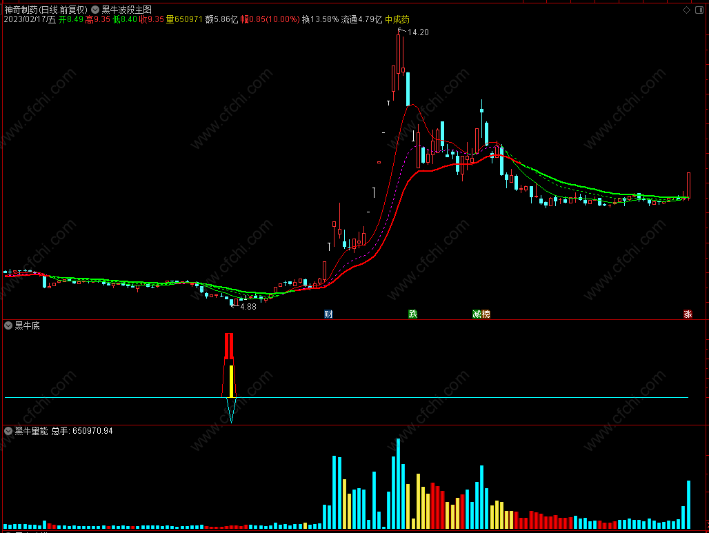 指标包含:黑牛波段主图指标、黑牛底副图指标、黑牛量能副图指标组合而成的战法。