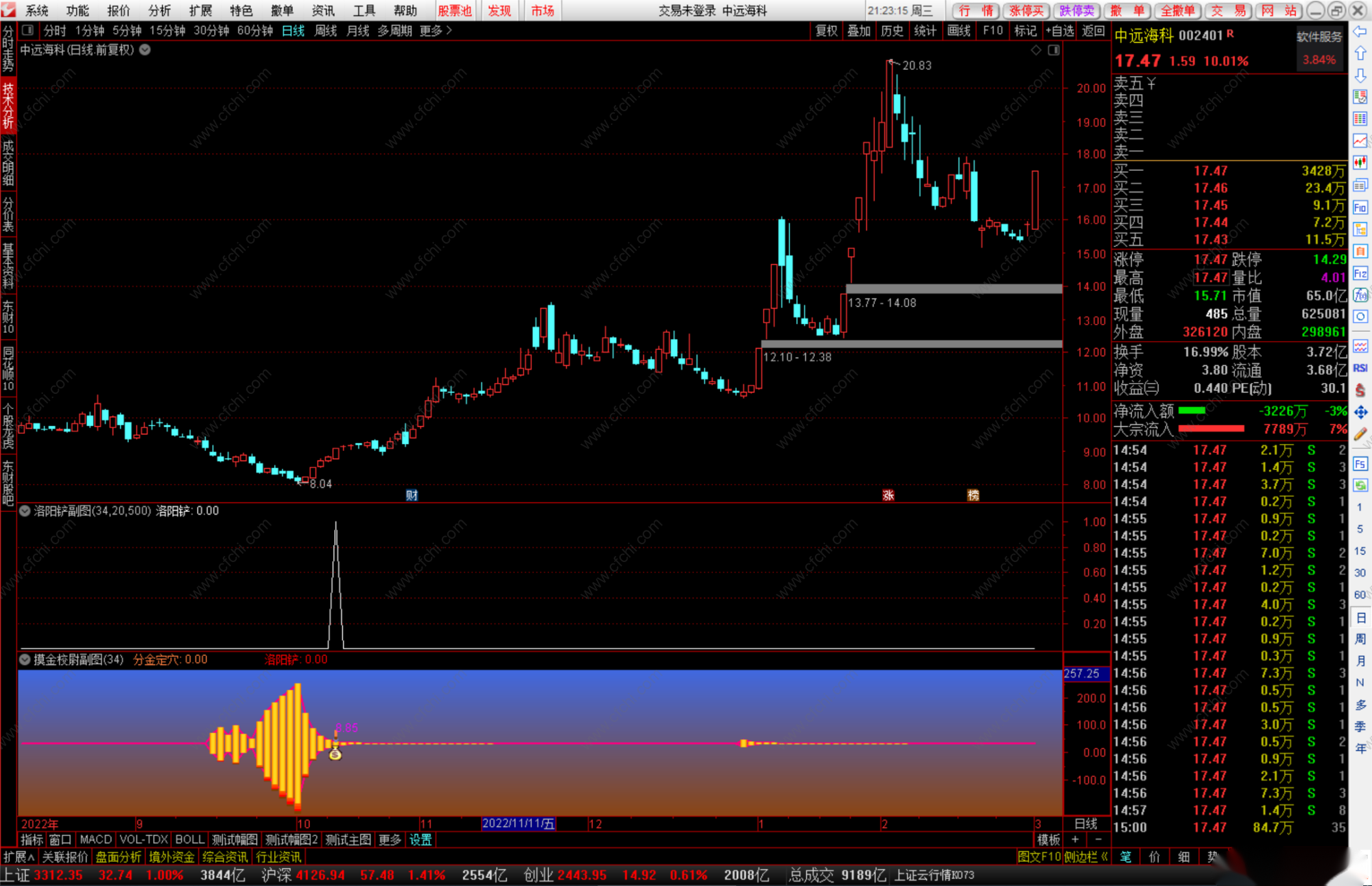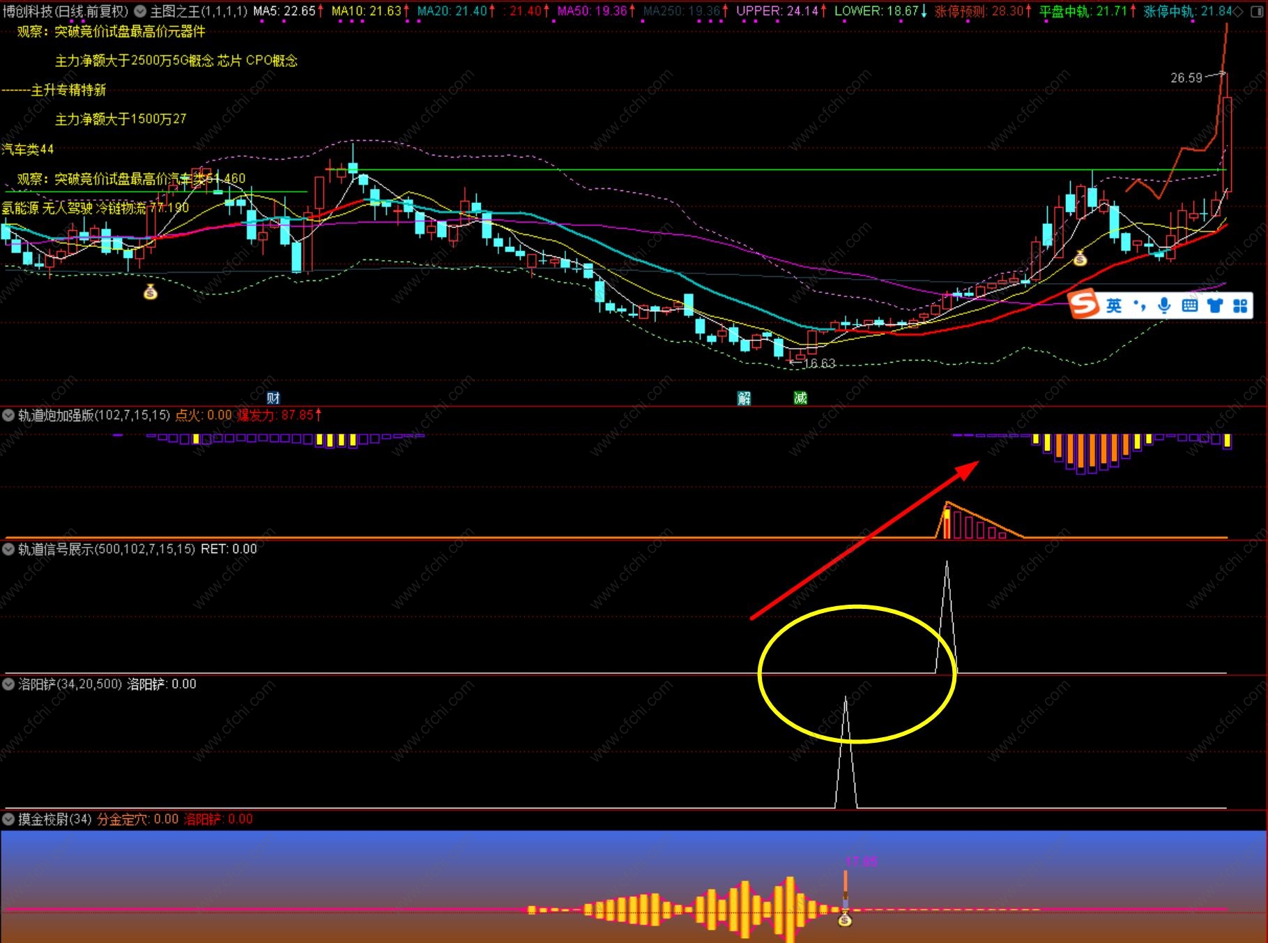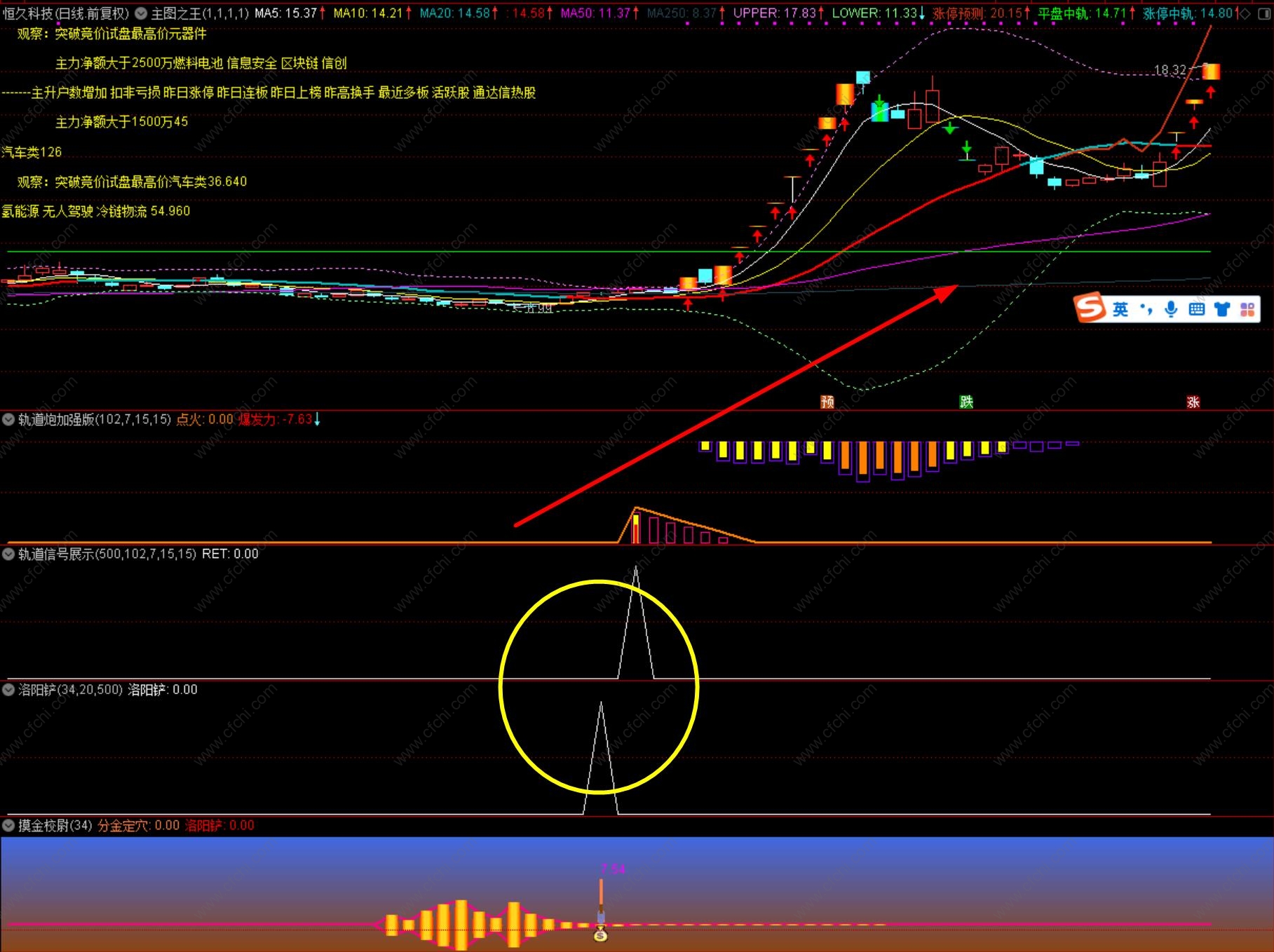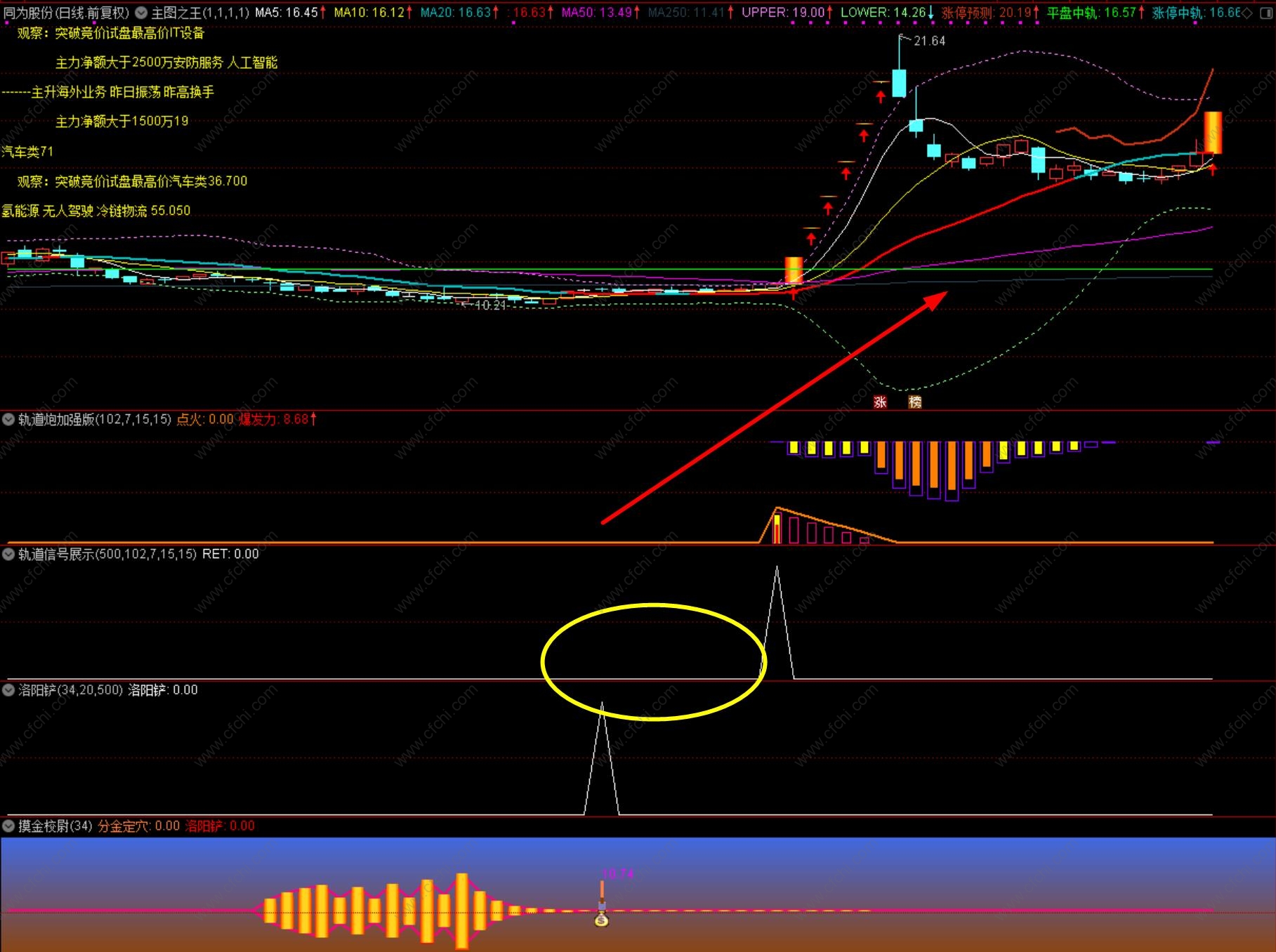 其中,通过发现点火信号时,副图上方爆发力的柱体颜色可以大致判断后续股价被推升的力度,