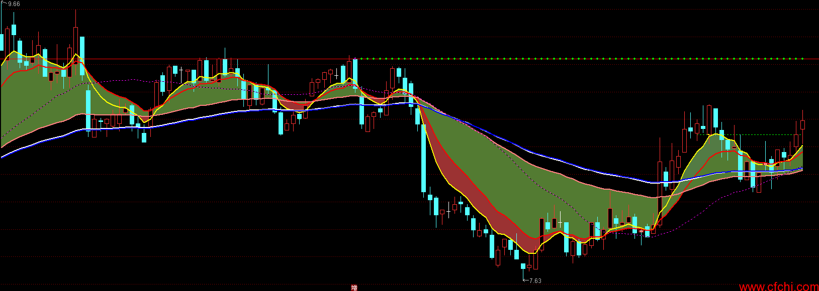 DRAWBAND(EMA(CLOSE,7),RGB(83,123,68),EMA(CLOSE,13),RGB(155,50,50));