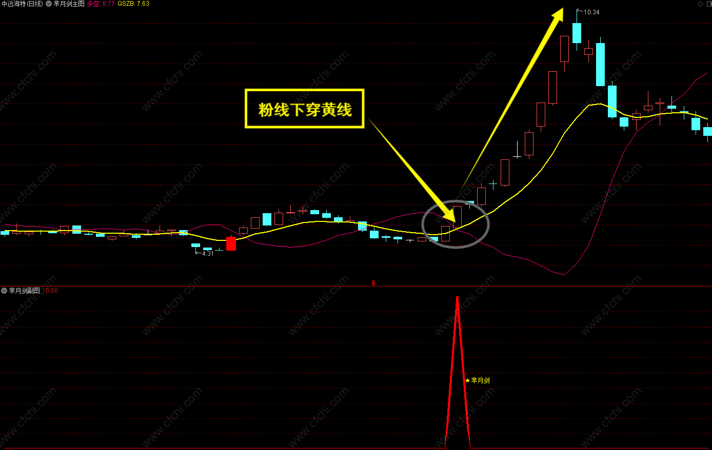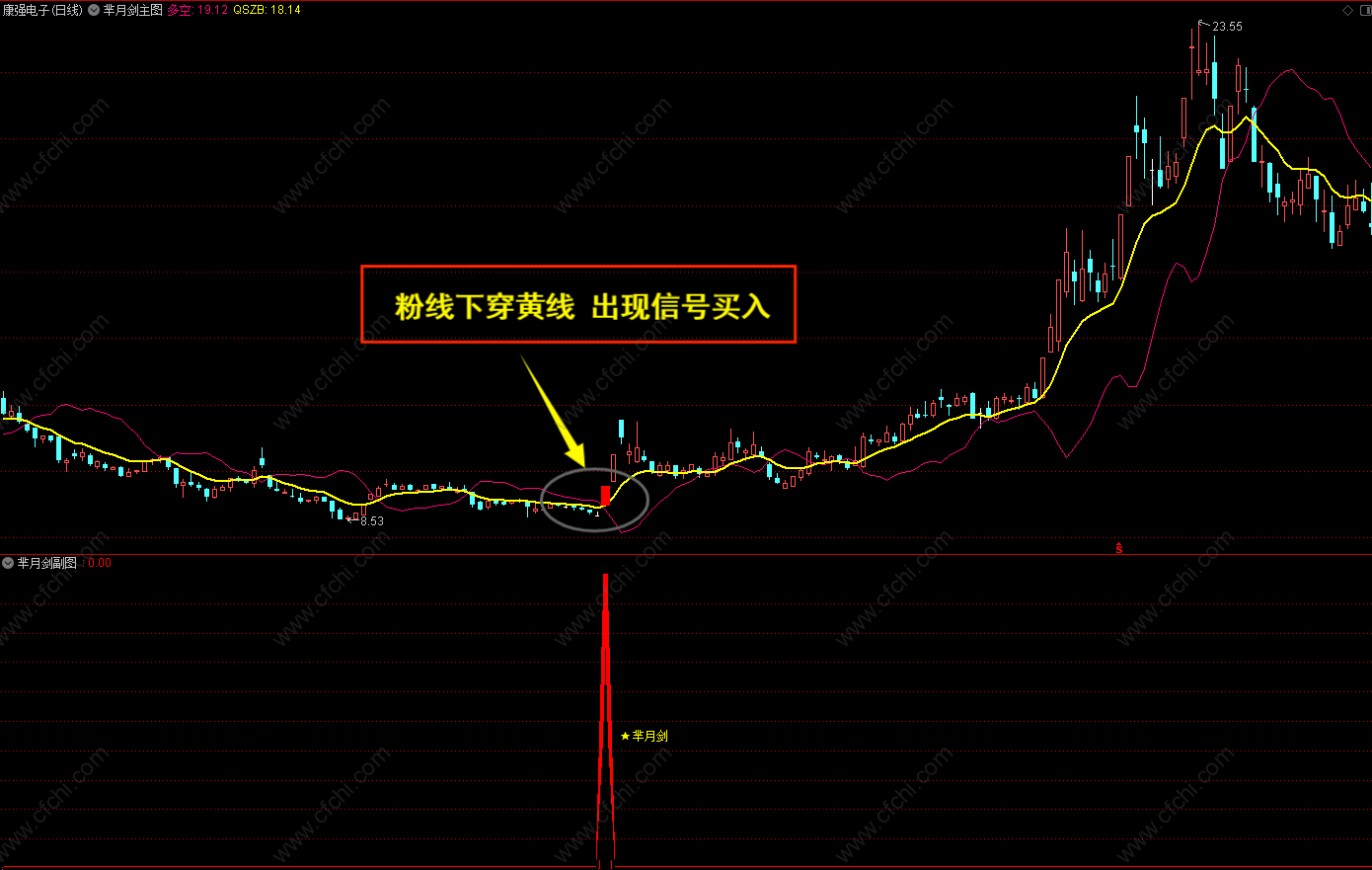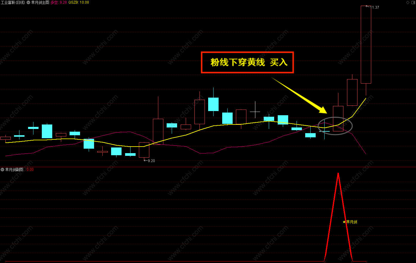 2、当副图出现信号提示,主图粉线下穿黄线,短线买入。