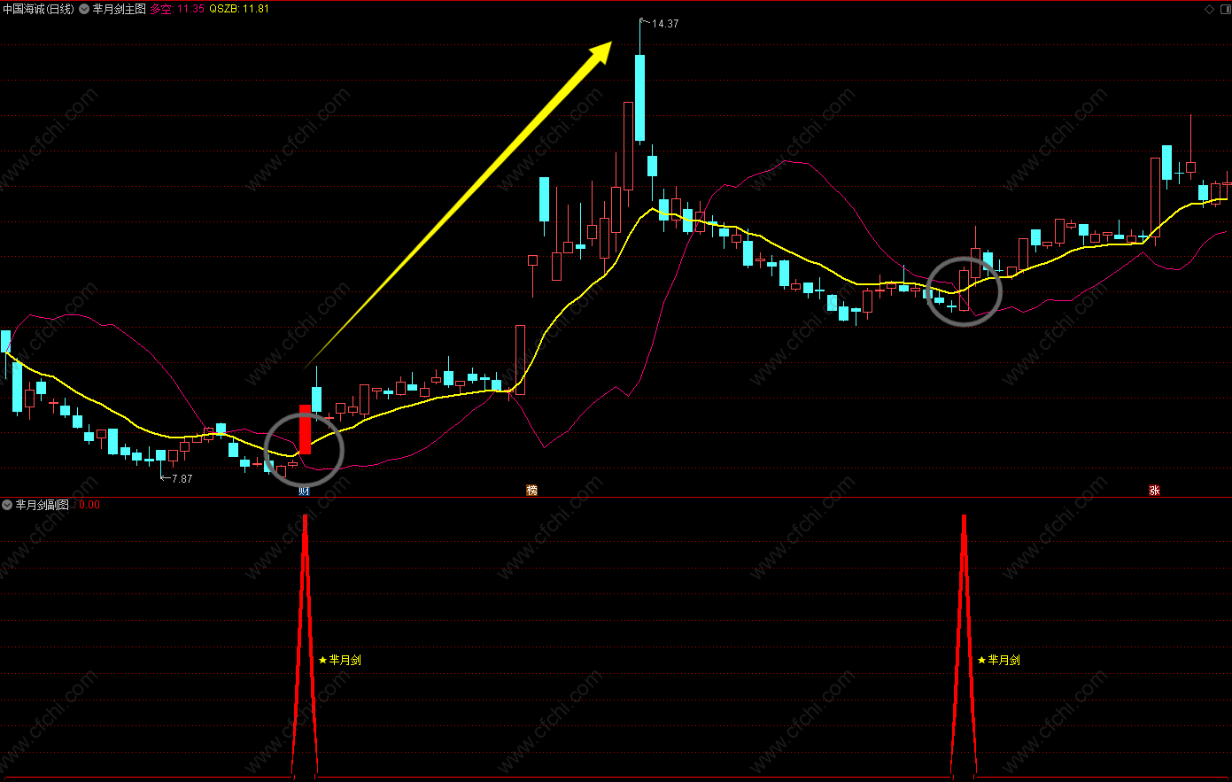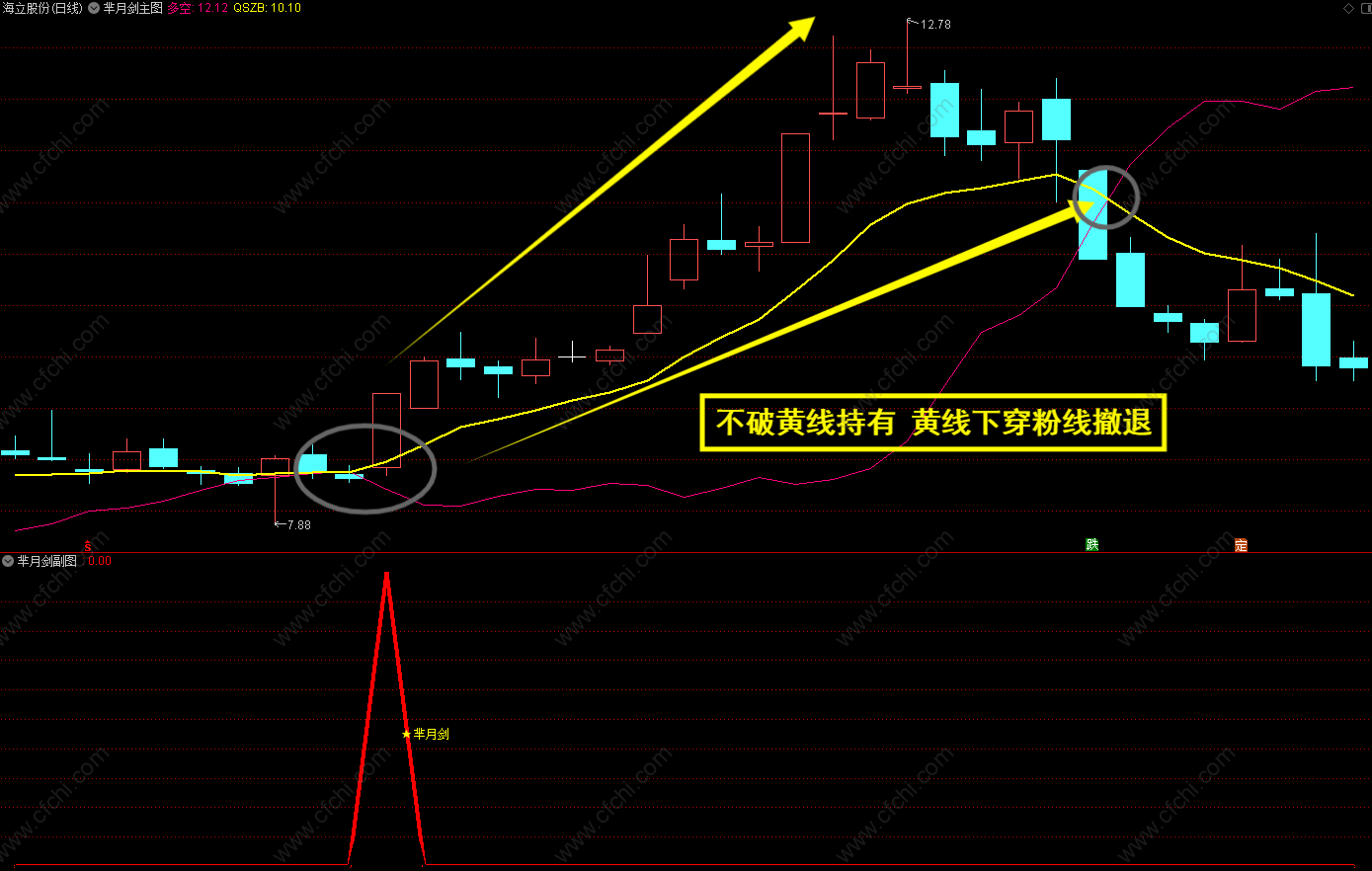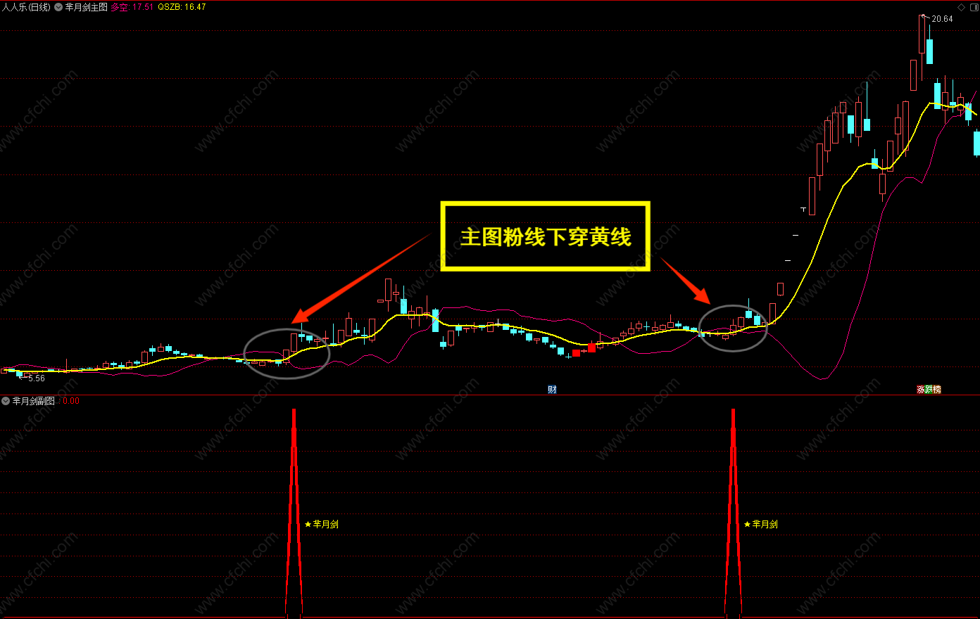 2、当副图出现信号提示,主图粉线下穿黄线,短线买入。
