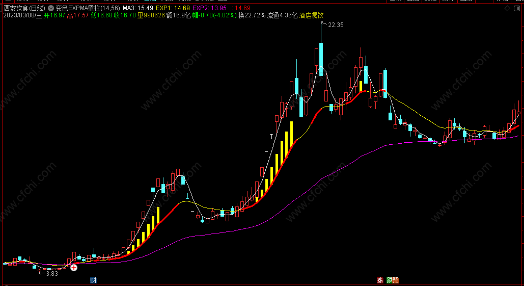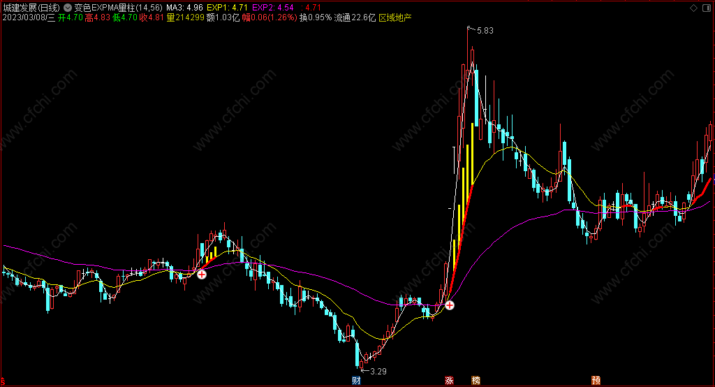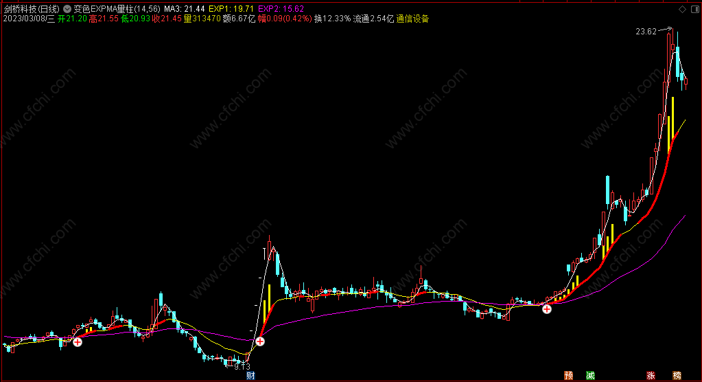 (通达信变色EXPMA量柱主图指标,exp1线变红做多,源码分享)