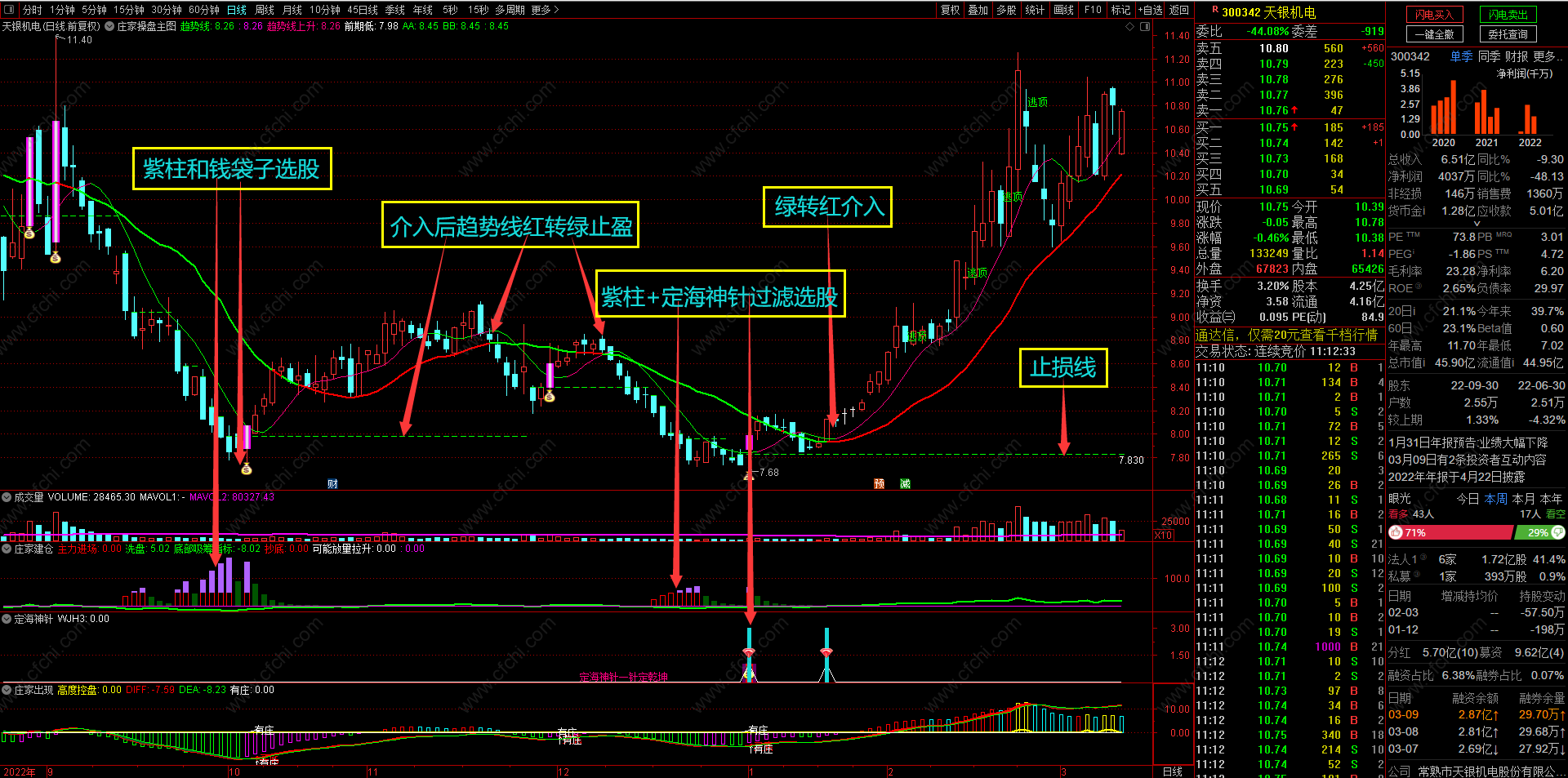 介入注意事项:定海神针+庄家精选选出来的票和庄家建仓精选紫柱+钱袋子共振选股选出来的票,建议介入点在主图由绿变红且成交量大于120,为最佳,介入后严格按照趋势线持股,跌破低点止损位一定要及时止损。