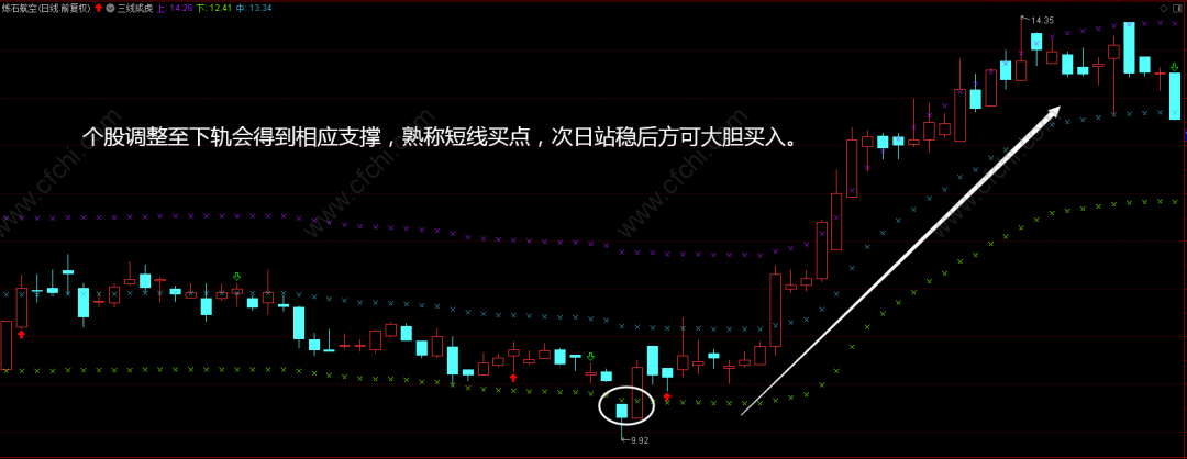 2、首先个股调整至下轨会得到相应支撑,俗称短线买点,次日站稳后方可大胆买入。