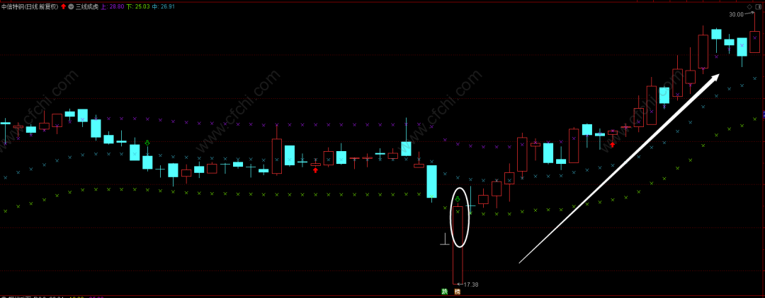 3、下轨至中轨上攻,中轨为压力,不能突破则回调至下轨,如突破中轨,需次日回踩确认后入场。