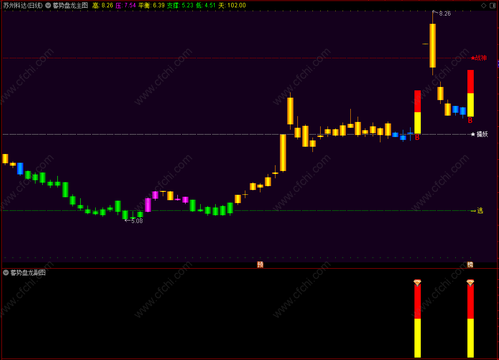 主图五线四区,平衡线、压力位、支撑位都都有了,彩色K线,金色做多,绿色做空,粉色由空转强的过渡,蓝色由强转弱的过渡;红黄K选股提示信号。