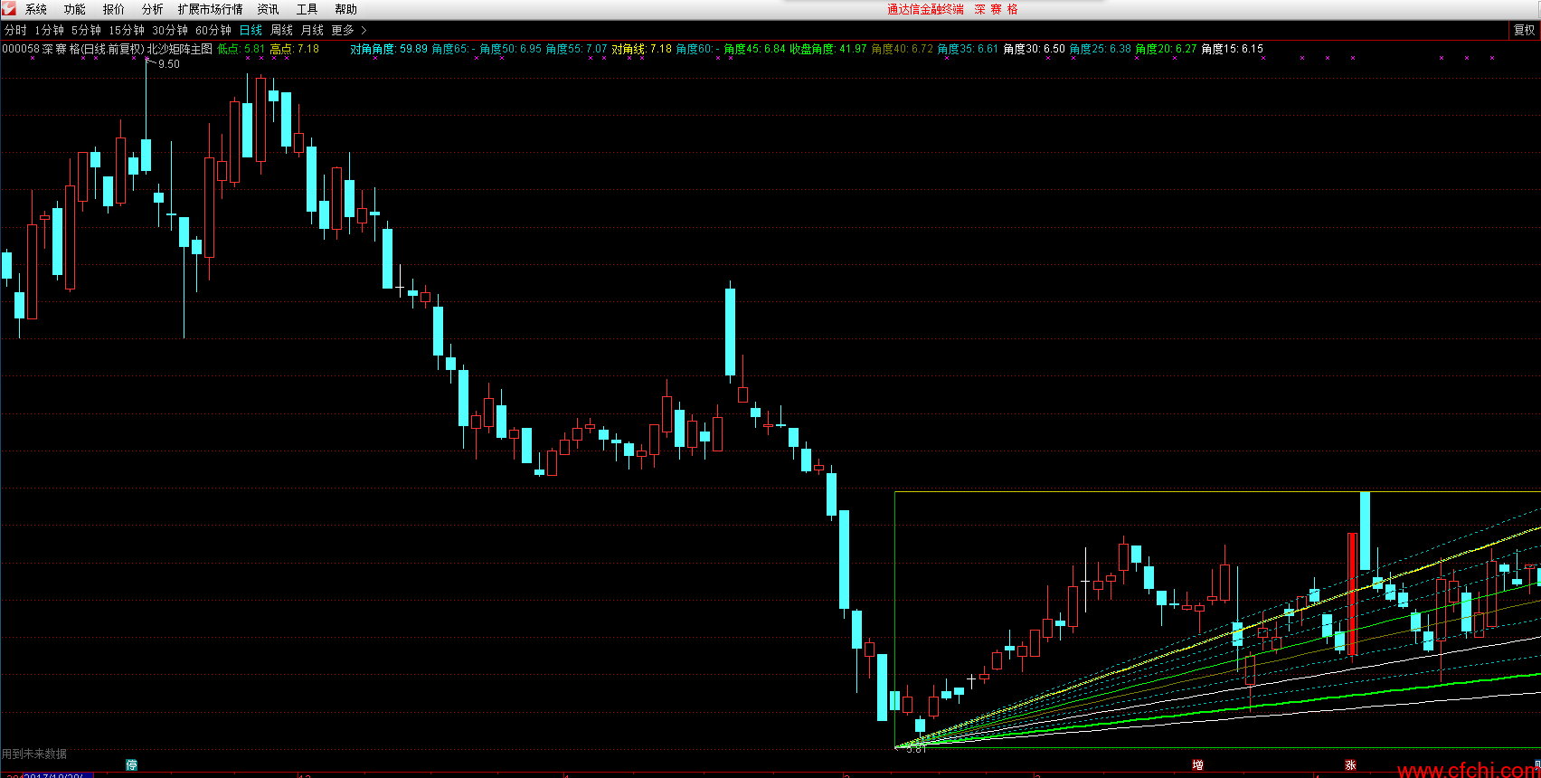 角度15:IF(TS>=0 AND 低点+(差15度/天数横线)*TS<=高点,低点+(差15度/天数横线)*TS,DRAWNULL),COLORWHITE,LINETHICK1;