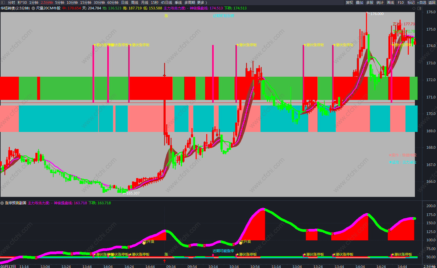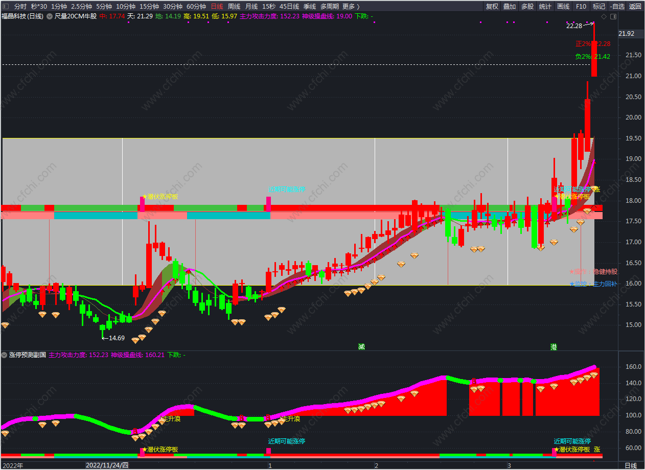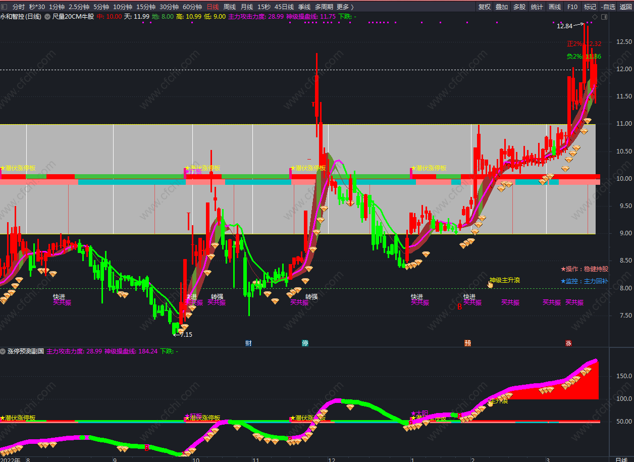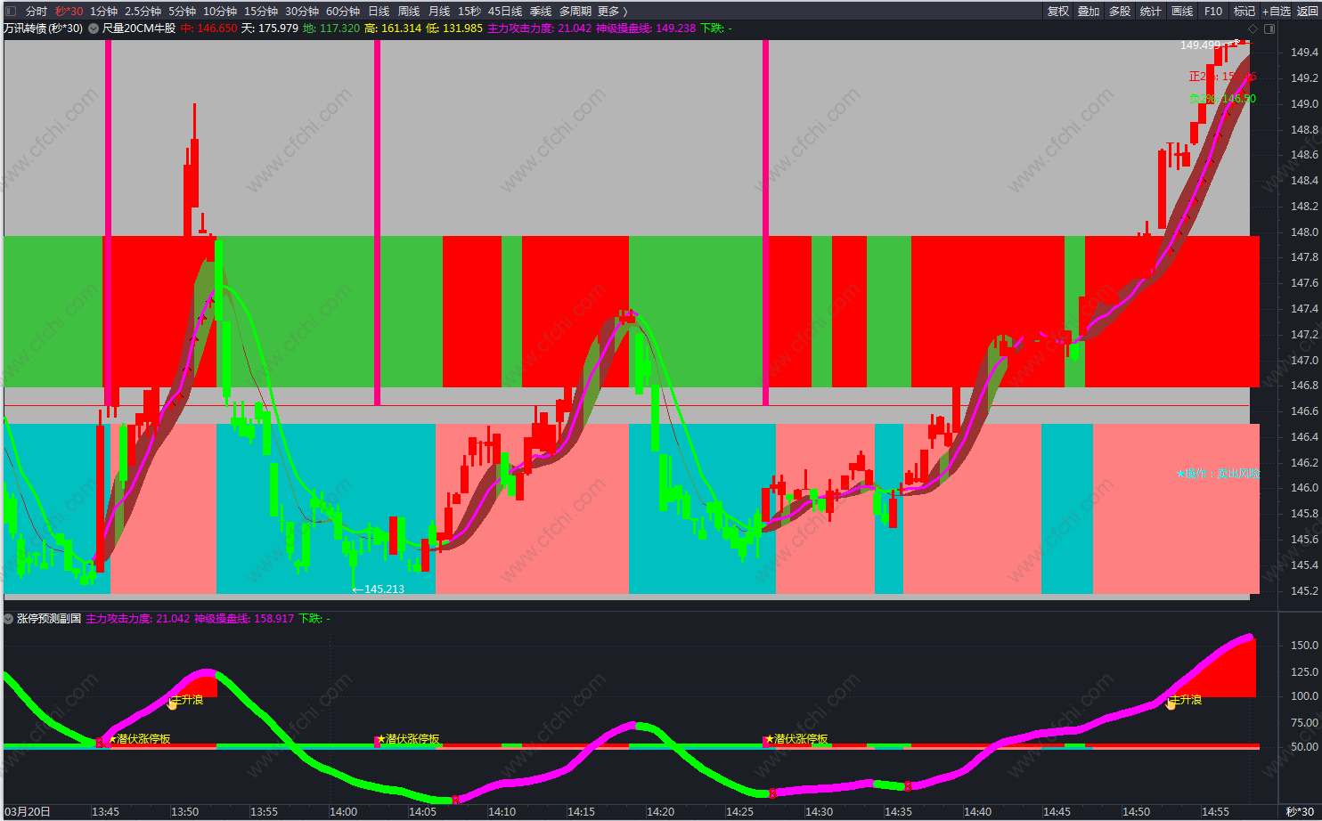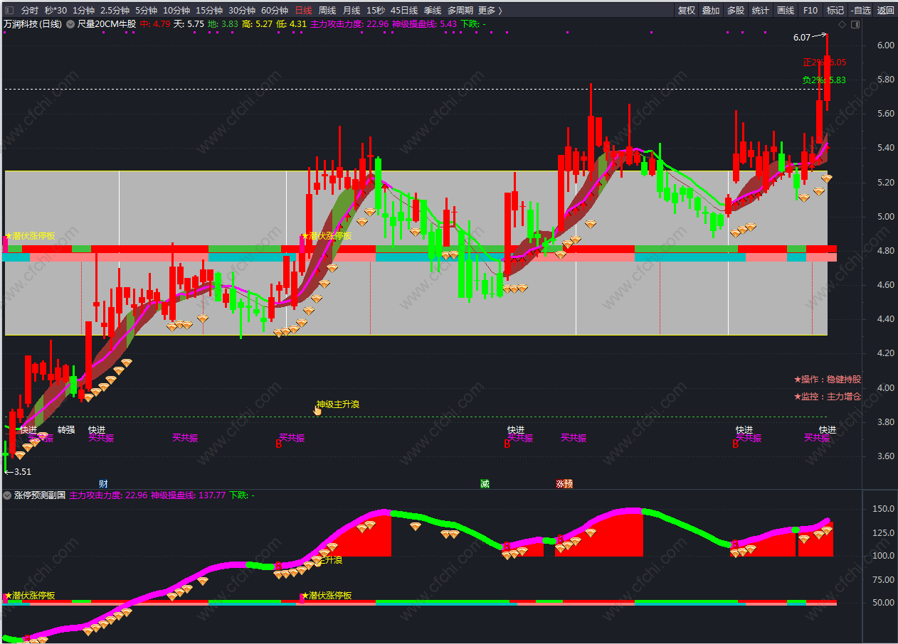 (尺量20CM牛股主图指标公式,有潜伏涨停板和操盘提示。无未来函数,不漂移。适合上班簇和散户用。)
