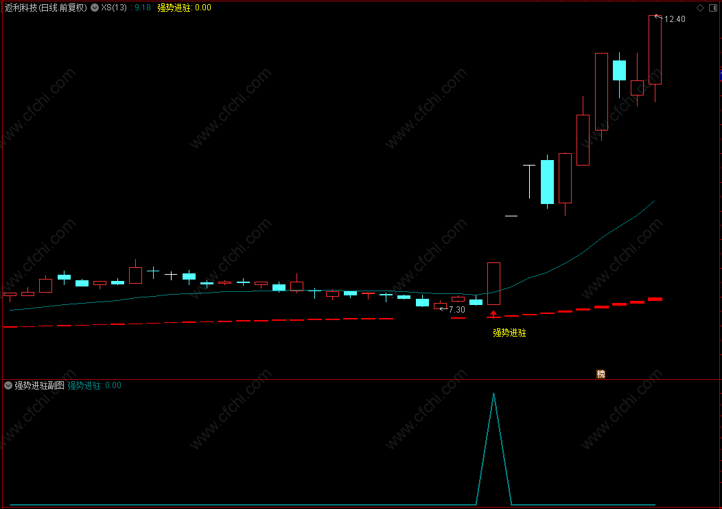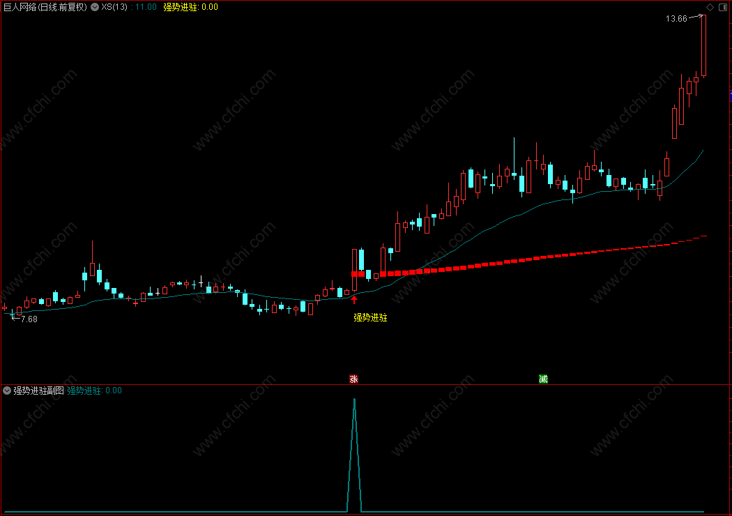 主图指标中我们有1条青色均线,青色均线向上更安全,实战中请多考虑青色均线下有红块来显示信号出现后的相对安全。