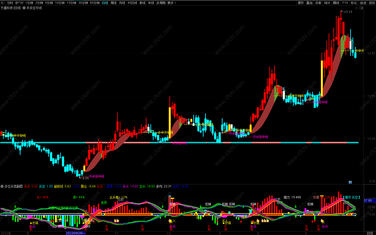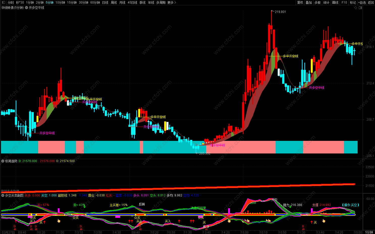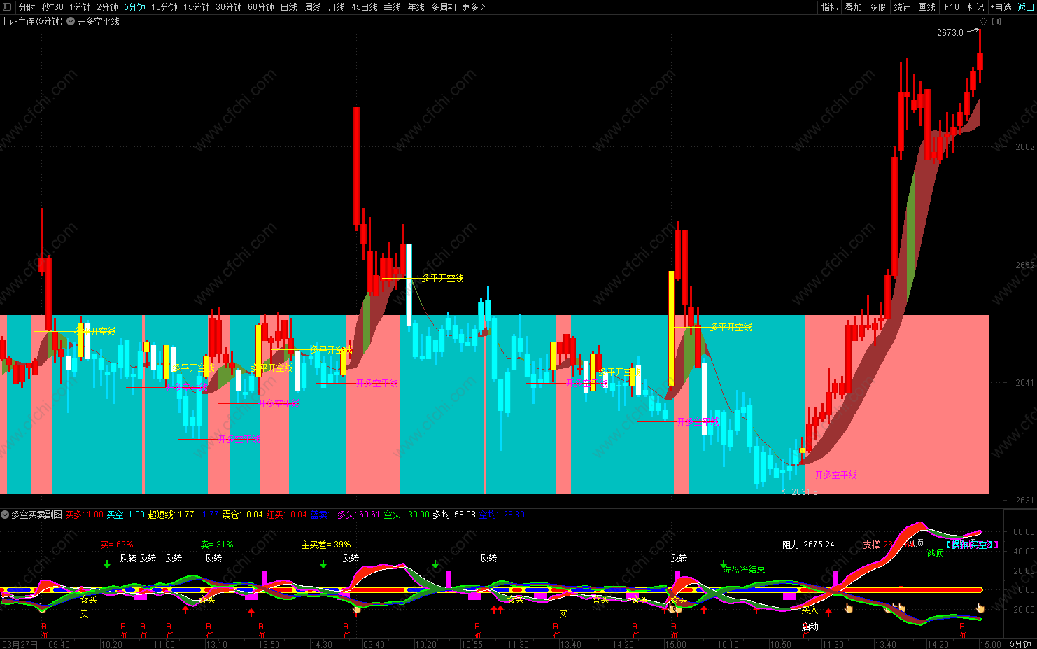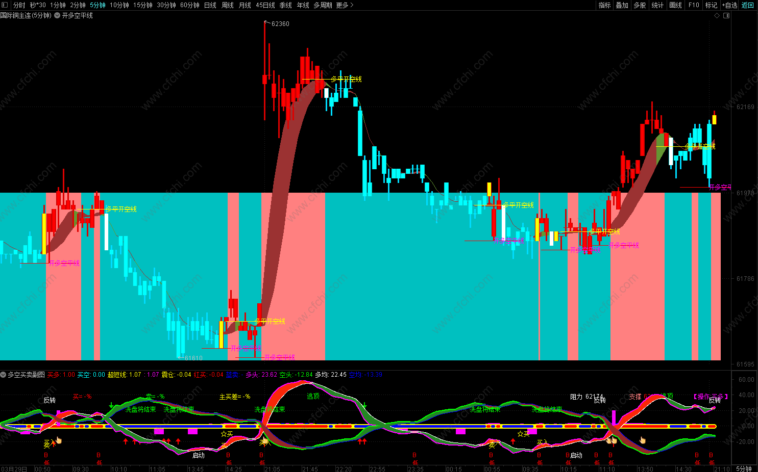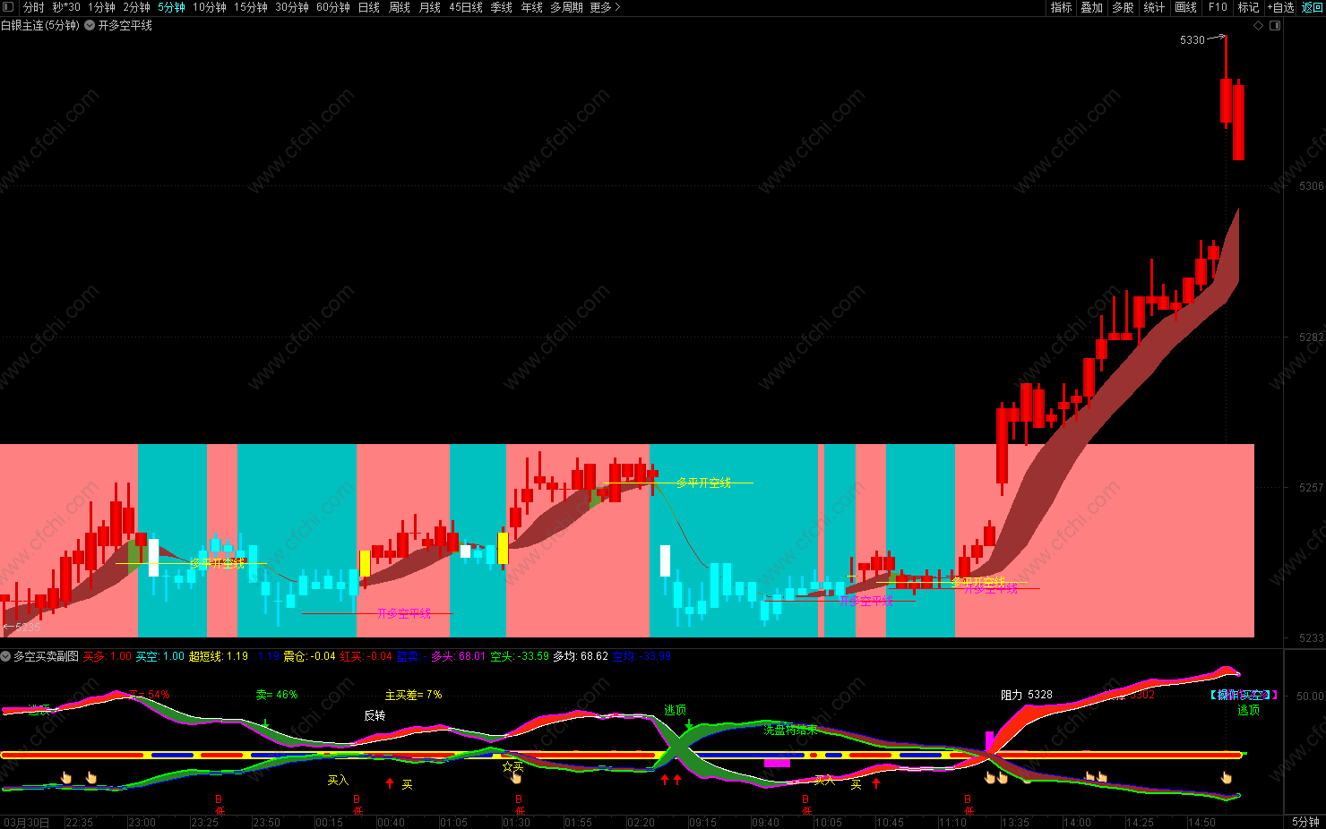 (开多空平线主图+多空买卖副图。主要用在期货交易和可转债、股票等T+0.无未来函数,不漂移。)