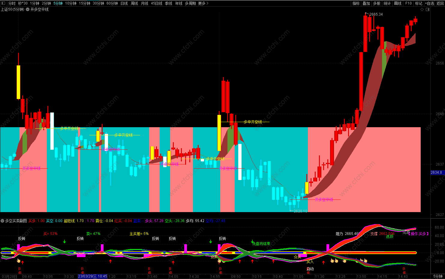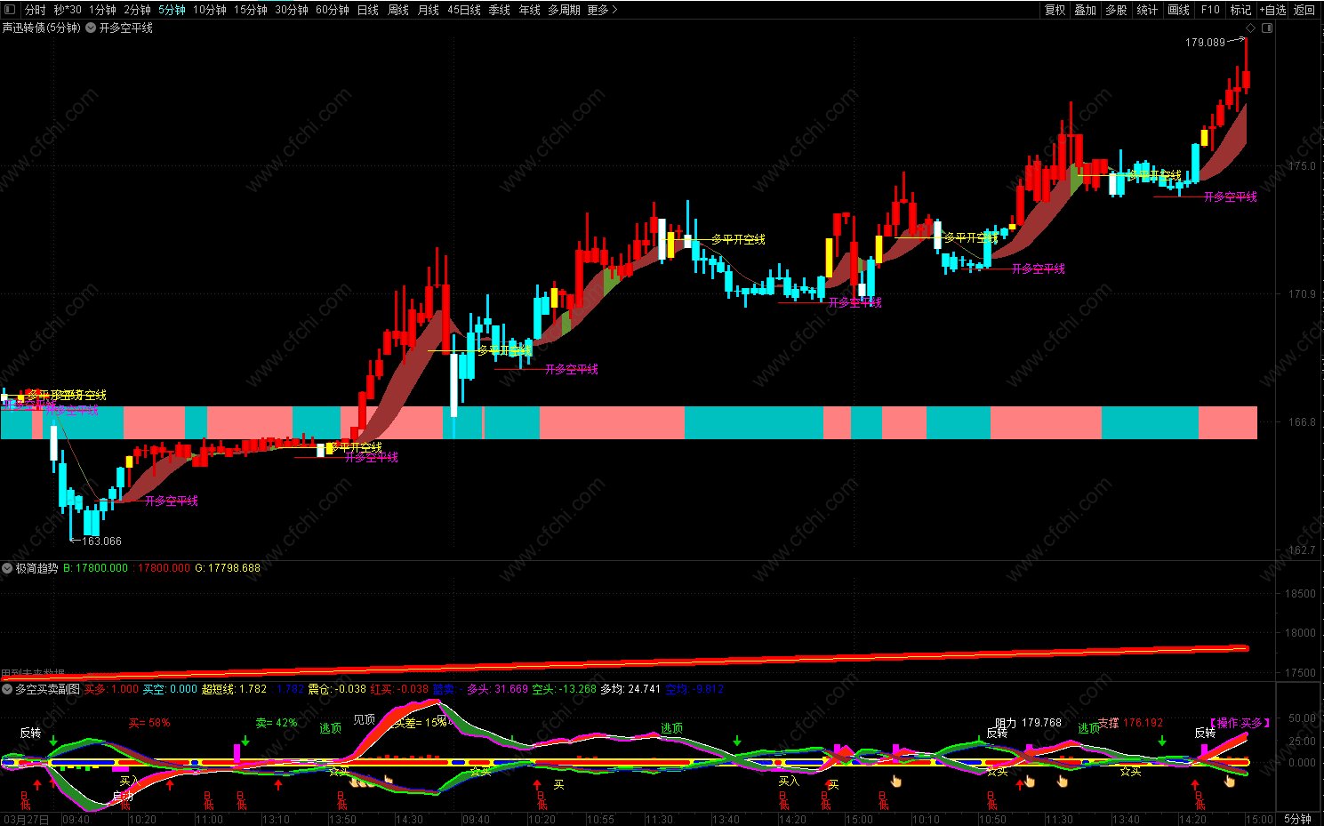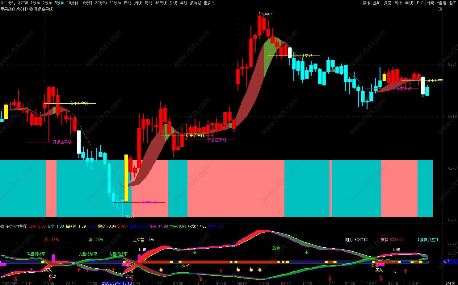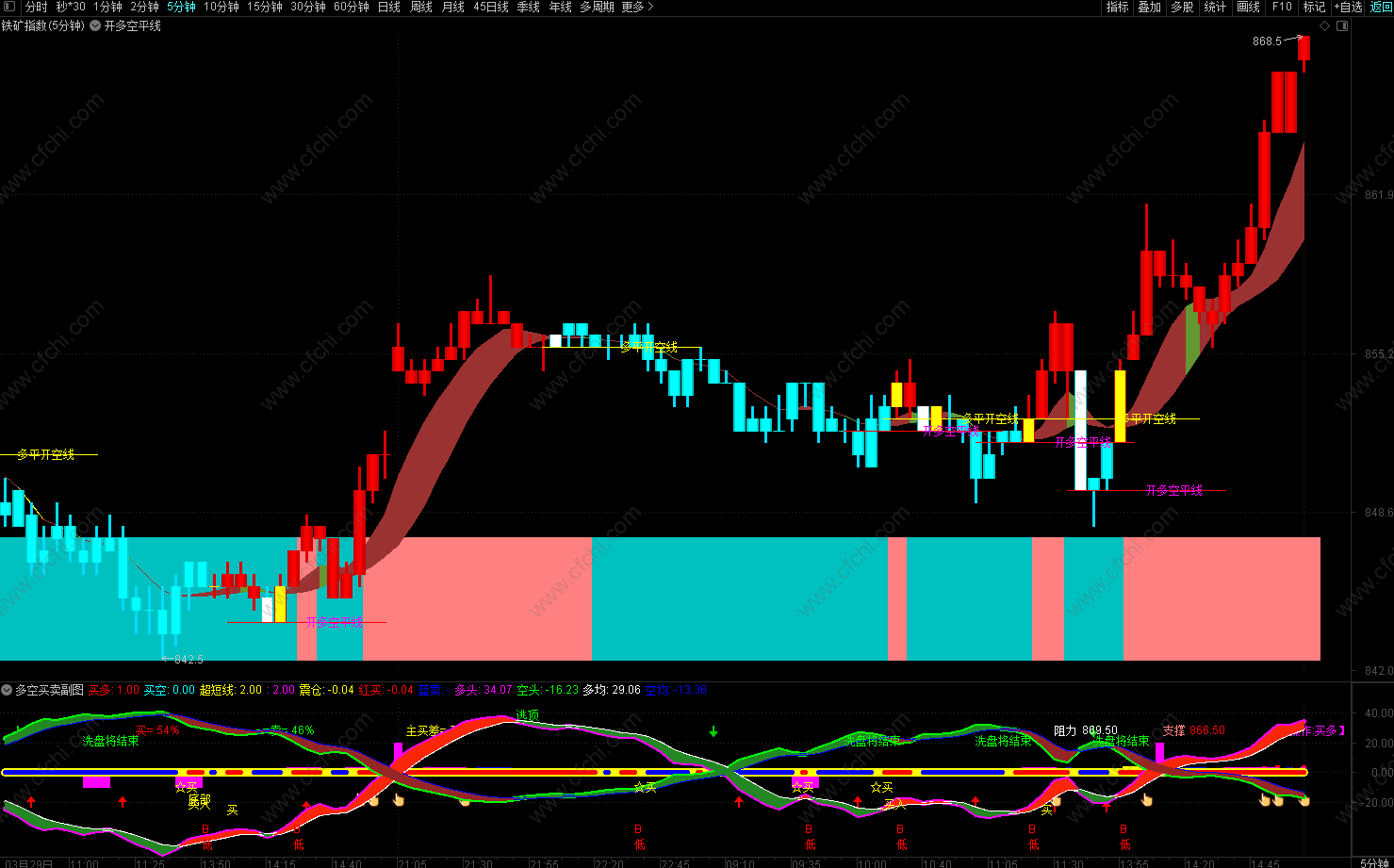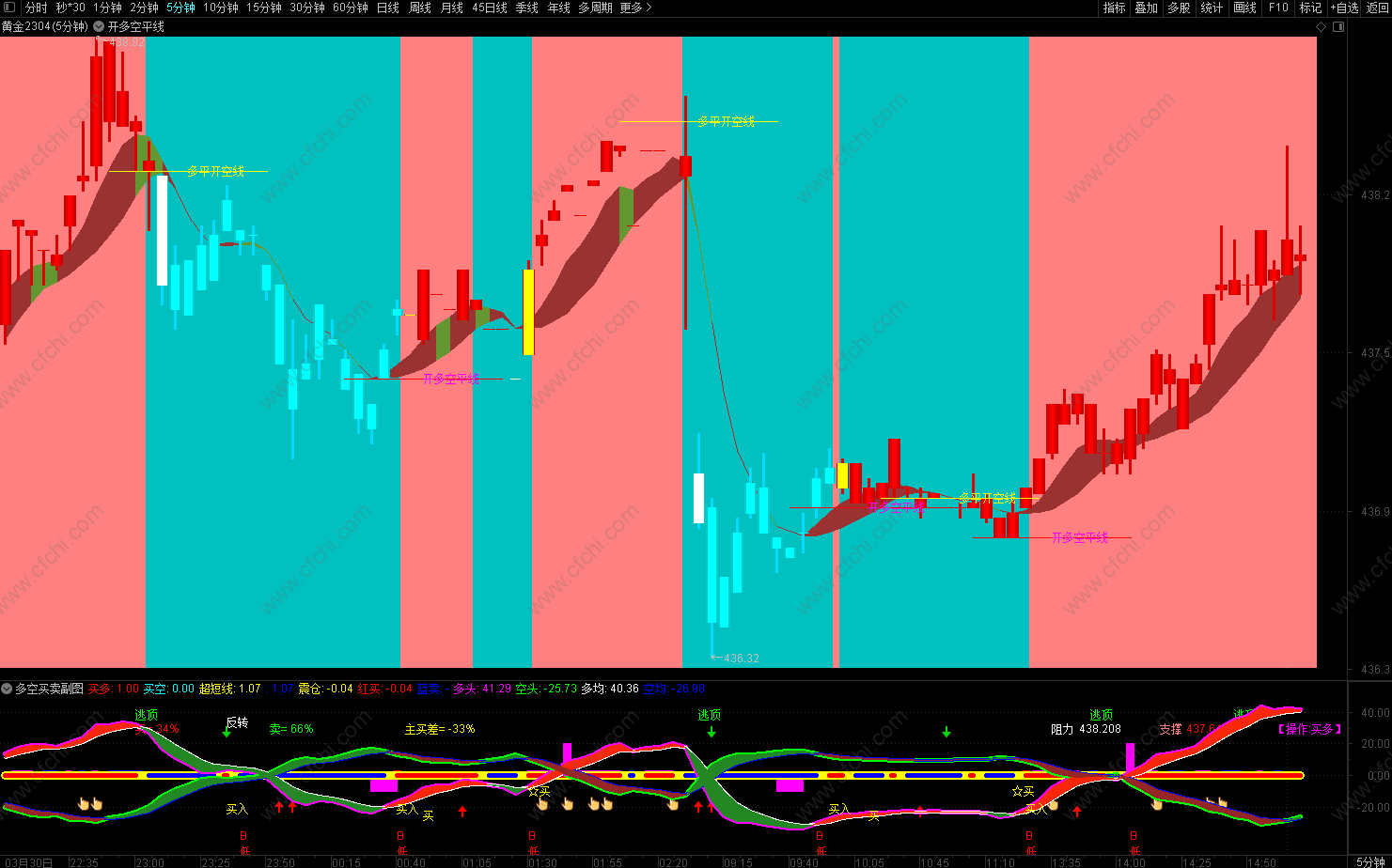 (开多空平线主图+多空买卖副图。主要用在期货交易和可转债、股票等T+0.无未来函数,不漂移。)