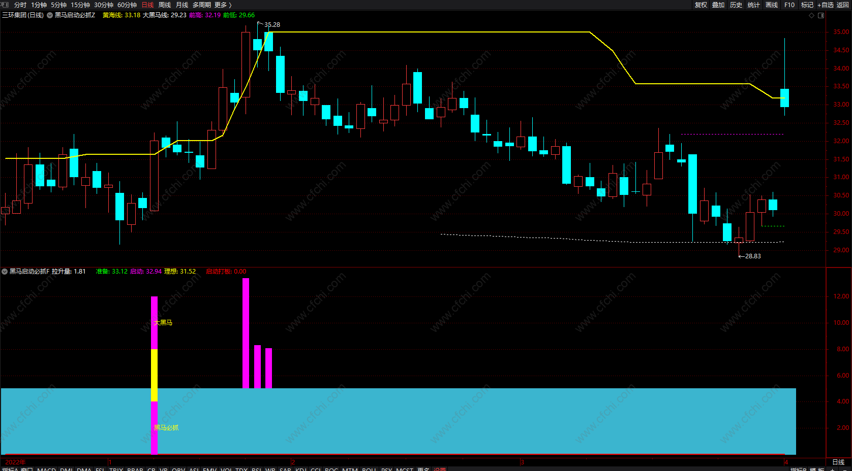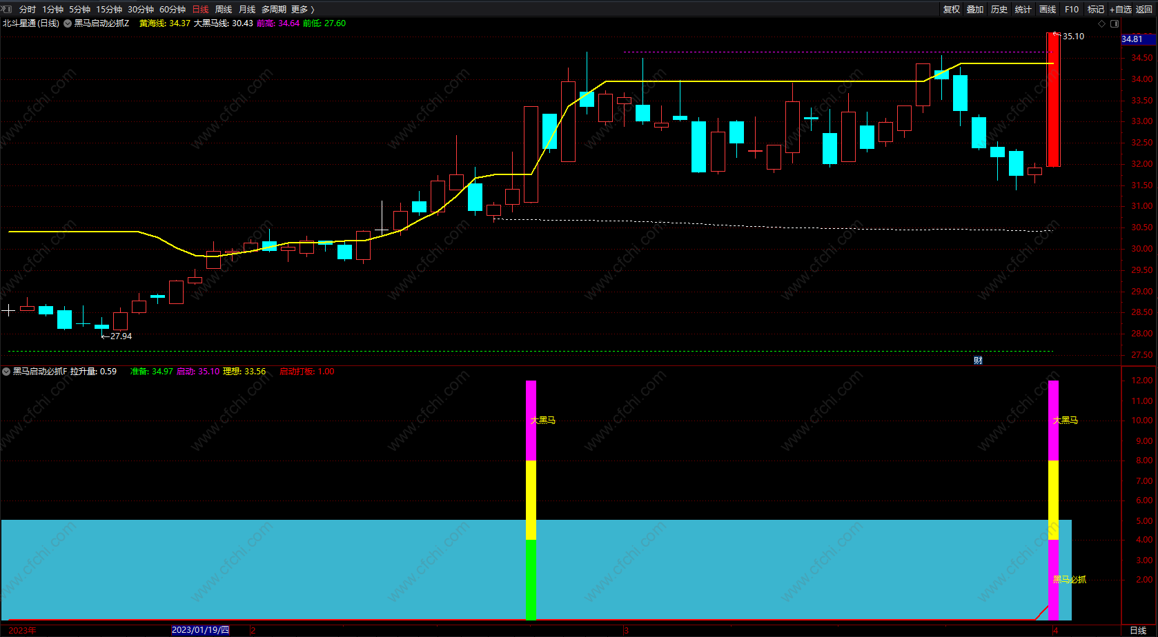 黑马必抓指标公式,副图粉色柱代表拉升量,主力行为,一般牛股初现后面就会带动拉升量,量价齐升股票大涨,拉升量降低时,说明主力筹码在松动,注意风险规避!