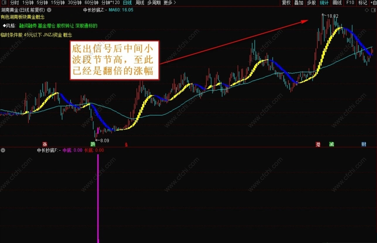 1.【超级中长抄底】主图由黄蓝柱波段色带和一条60日均线组成,实战中股价在黄色柱上表示个股进入上升趋势实持股待涨,反之,股价在蓝柱下方表示为下跌趋势应空仓观望;