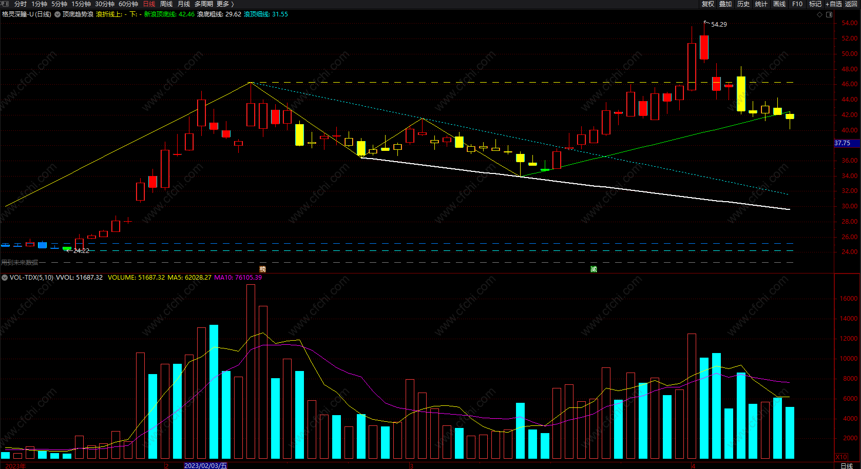 浪顶细线:DRAWLINE(XX2,H,VV2,H,1),COLORFFFF00,LINETHICK1,DOTLINE;