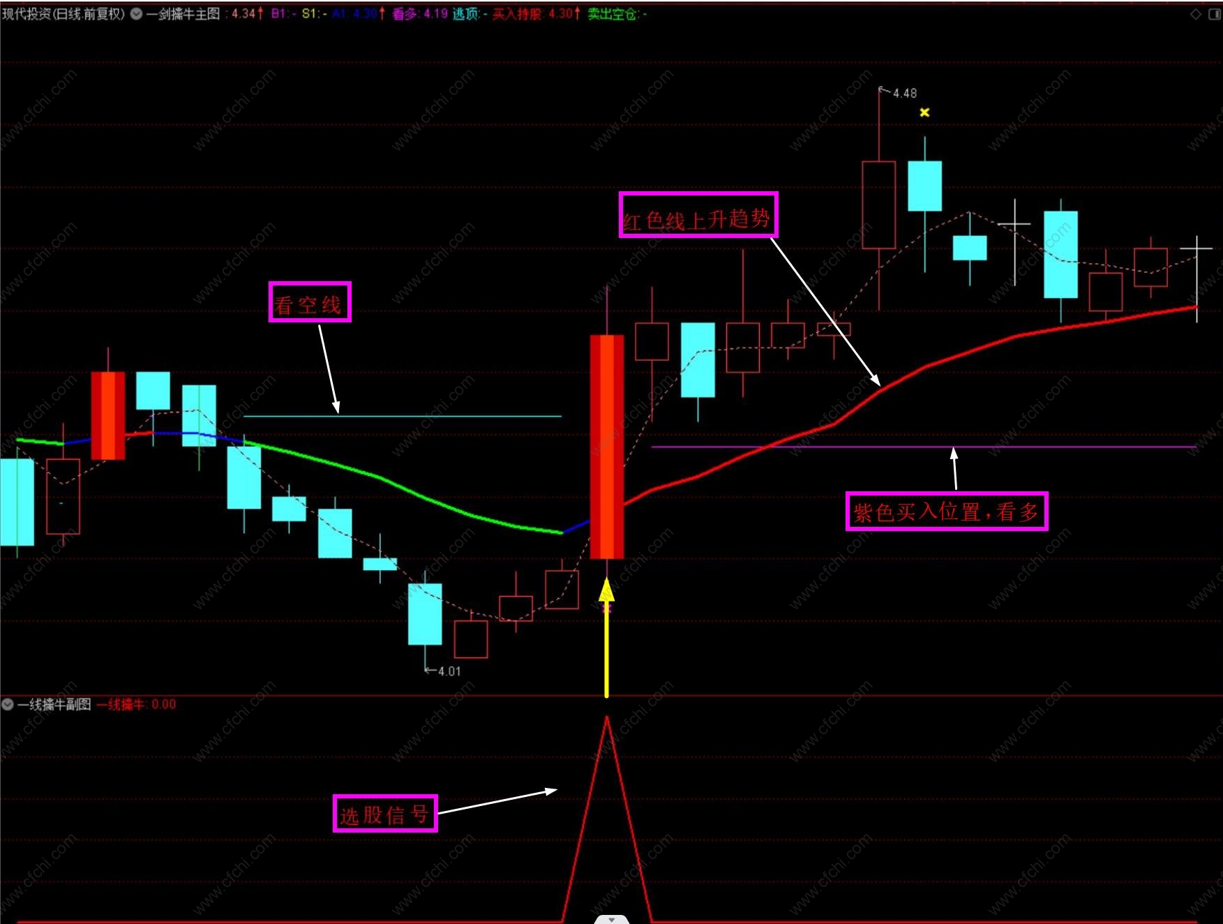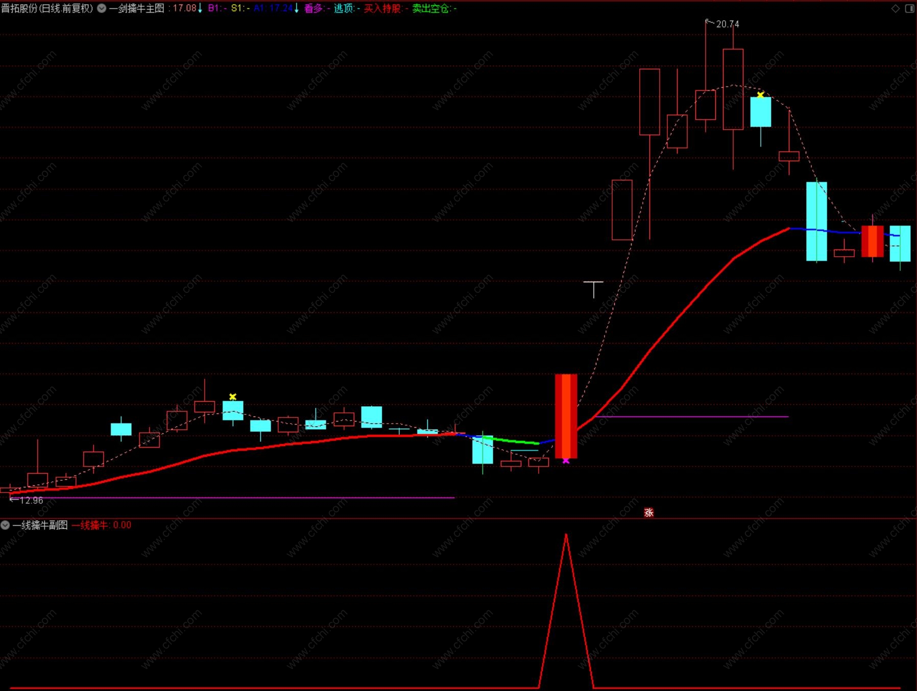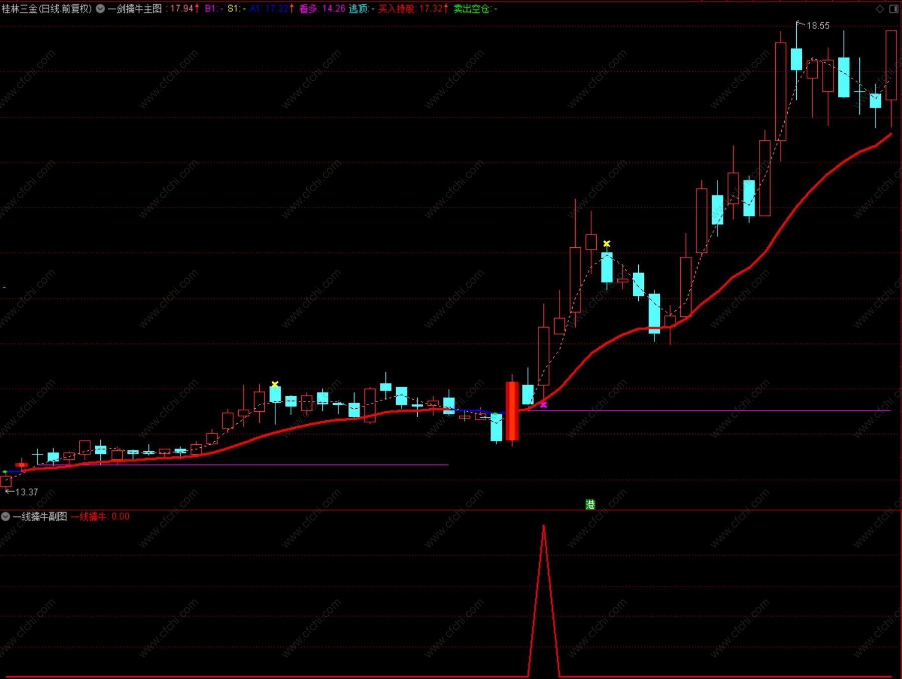 4、选股出信号后,在紫色线附近,逢低介入;趋势提示:该指标在日线、周线、月线均有较好的参考意义。