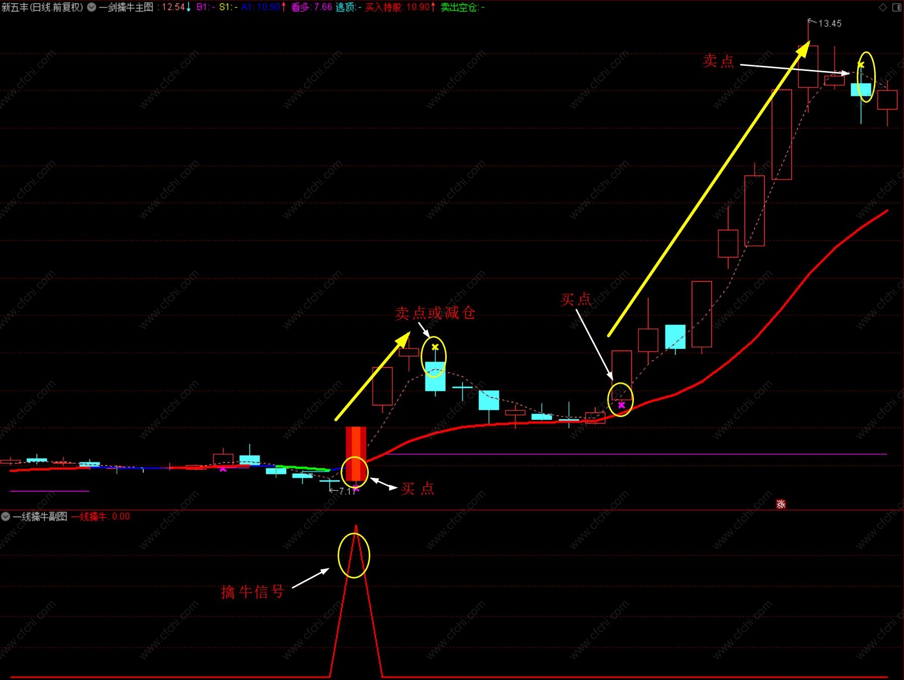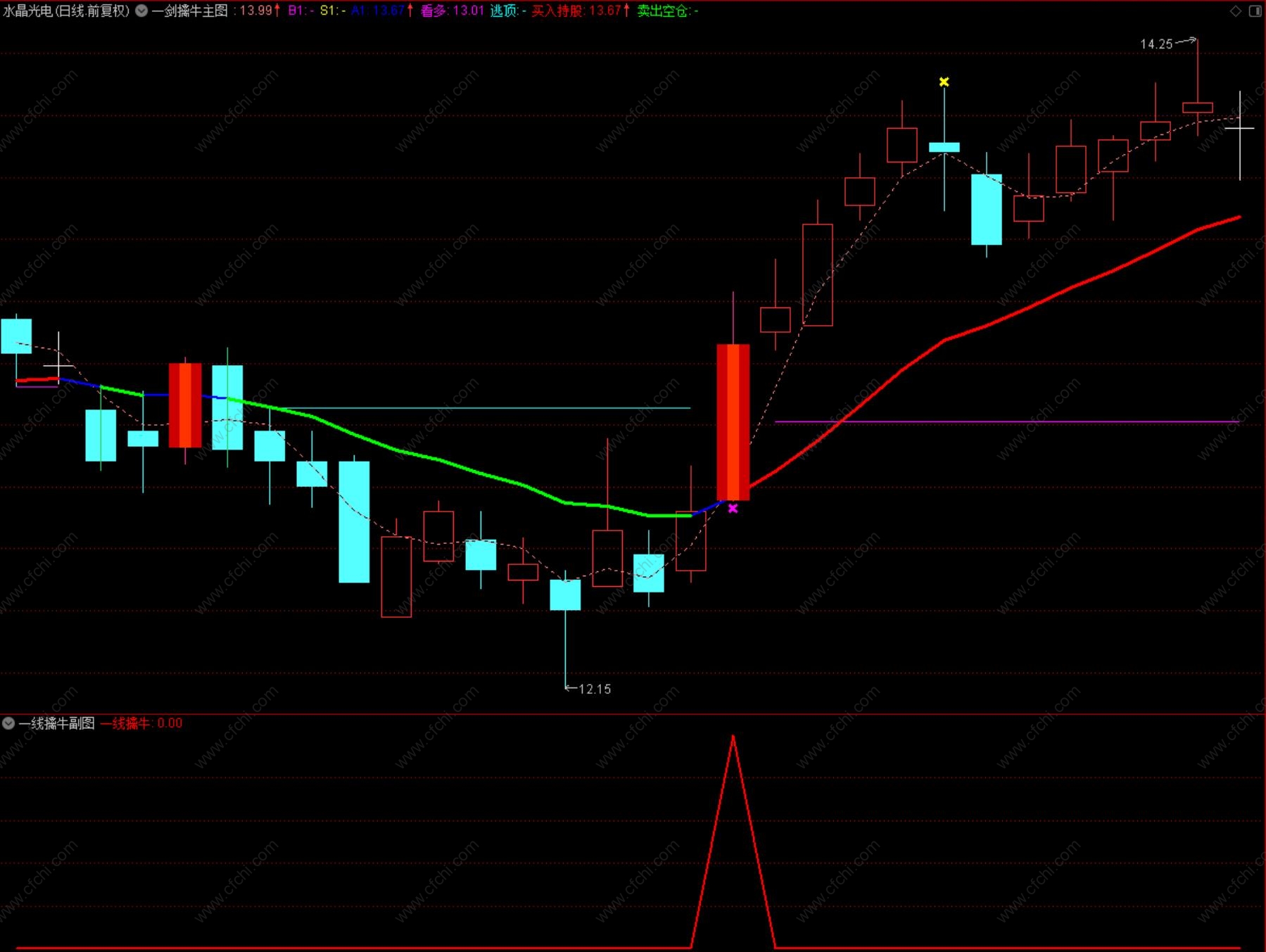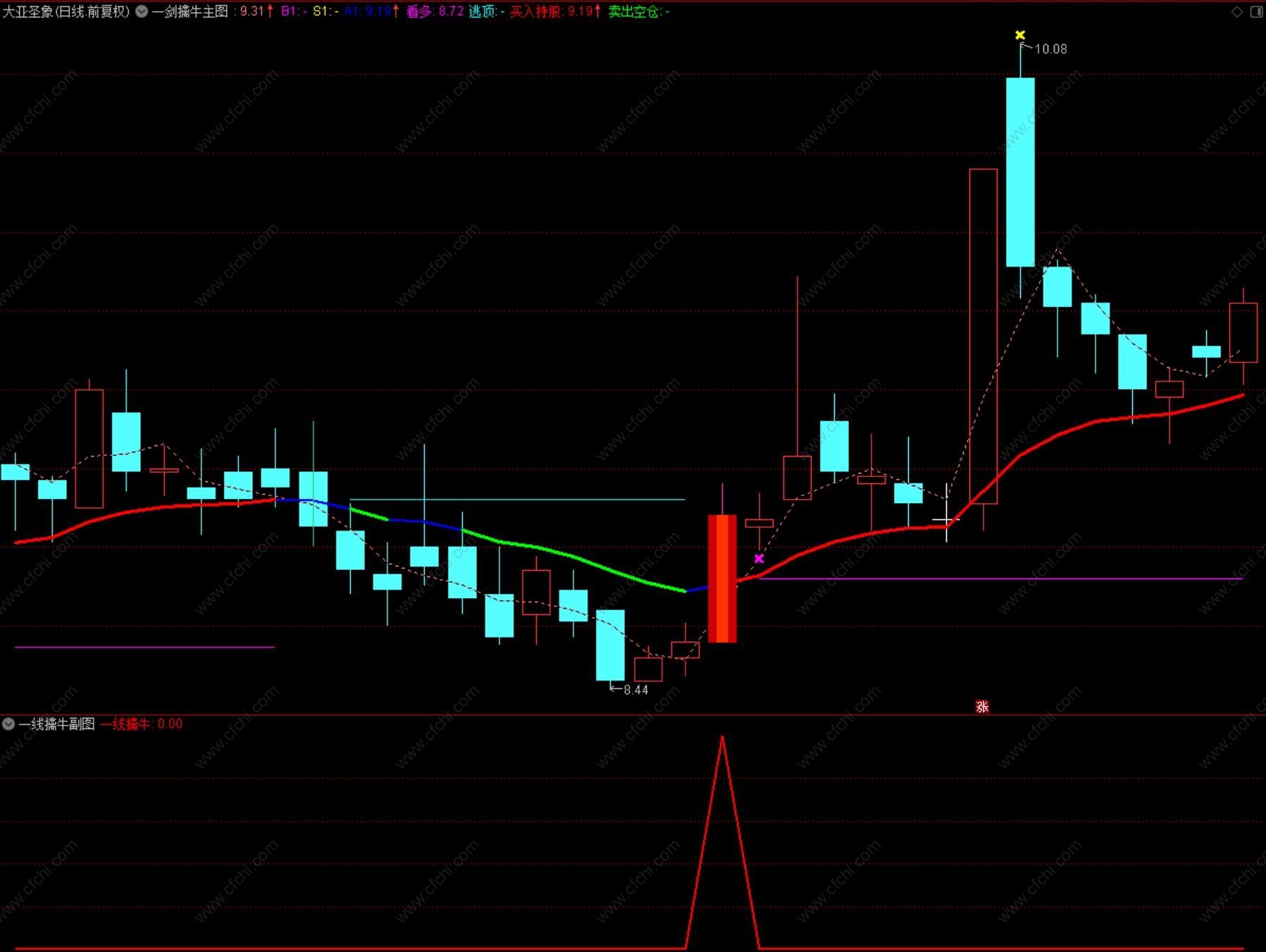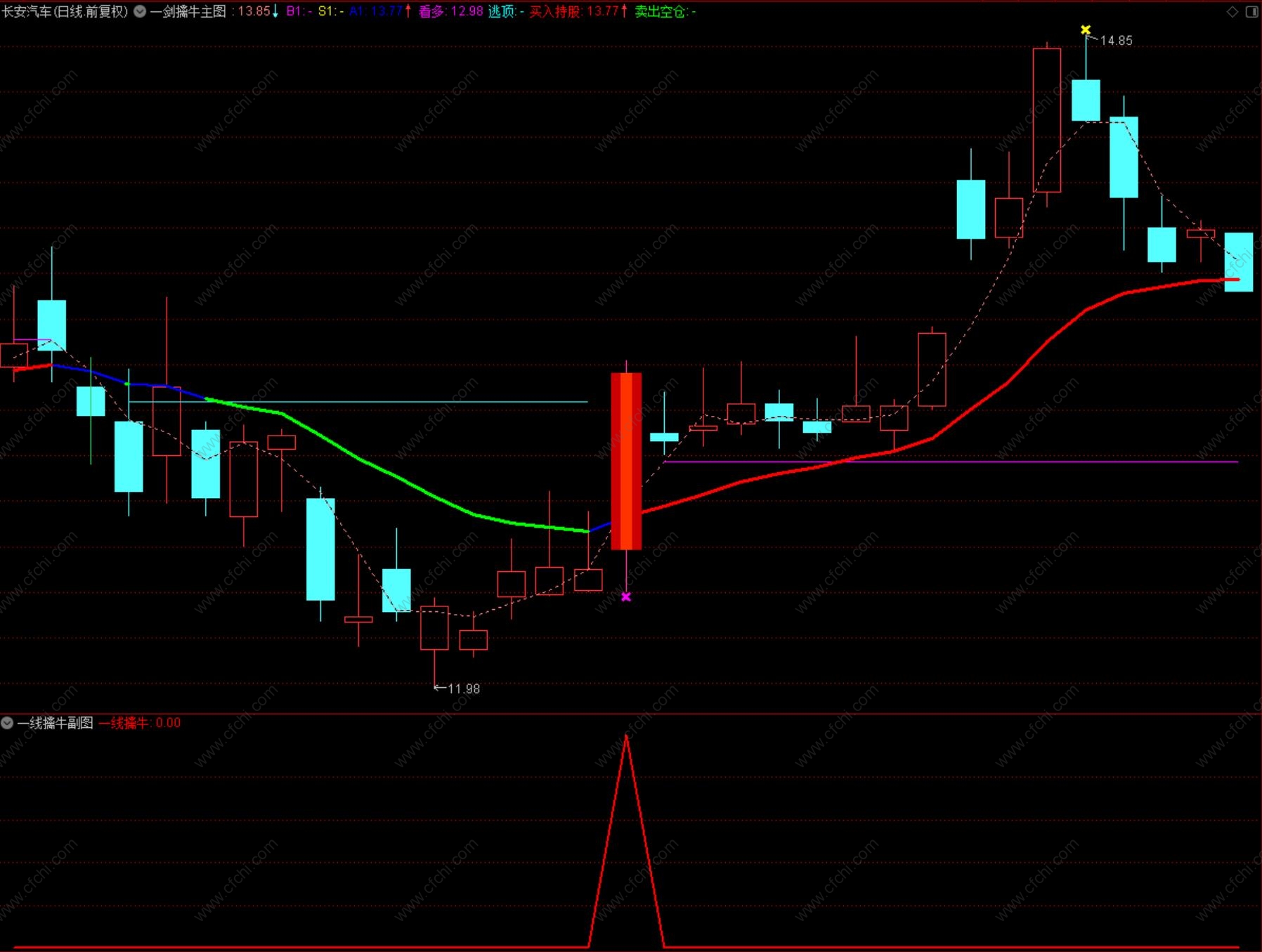 4、选股出信号后,在紫色线附近,逢低介入;趋势提示:该指标在日线、周线、月线均有较好的参考意义。