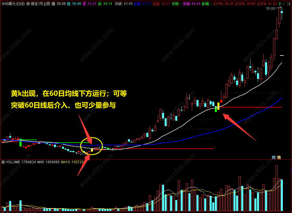 黄k出现,股价在蓝色线上方可考虑介入;如在60日均线下方运行,可等突破60日线后介入、也可少量参与。