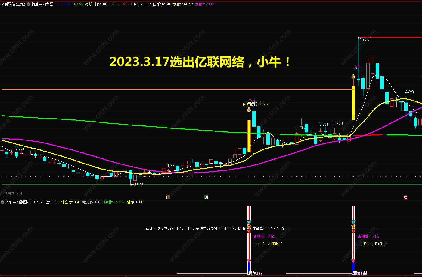 注:2、选股需要设置参数,手机通达信无法使用。不过也没关系,你可以下班后用电脑复盘时选股,不一定要指标当天出了就买的,第二天低吸也可以。