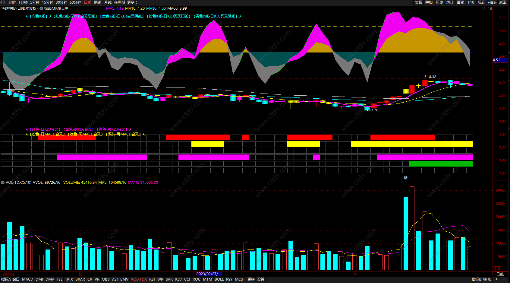 与1不同的是将MACD、KDJ传统指标的日、周、月指标情况用彩条方式表现,建议大家与《实用操盘小工具1》配合使用效果会更好一些。