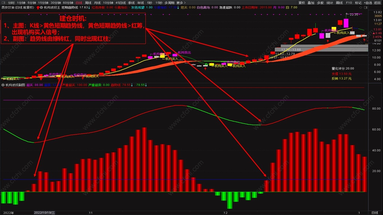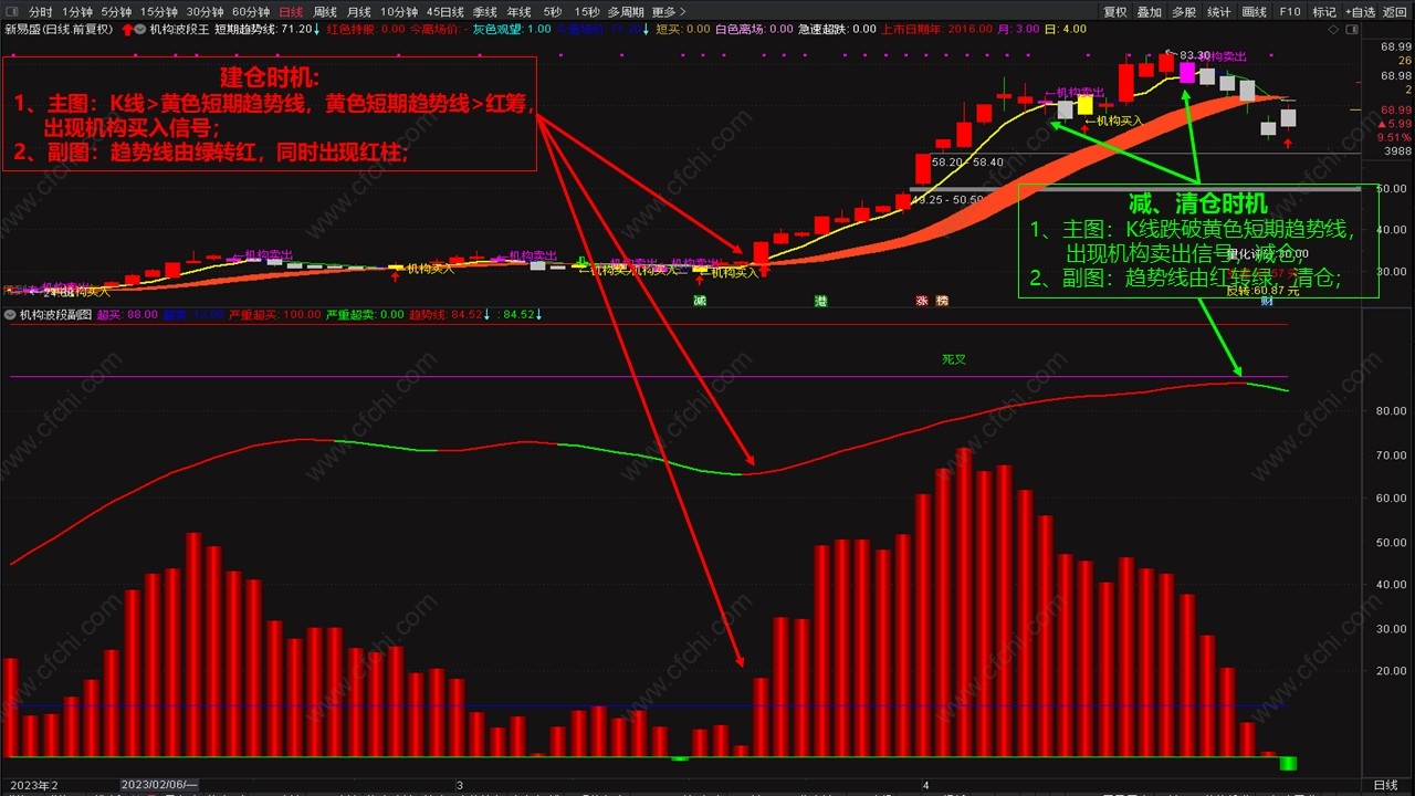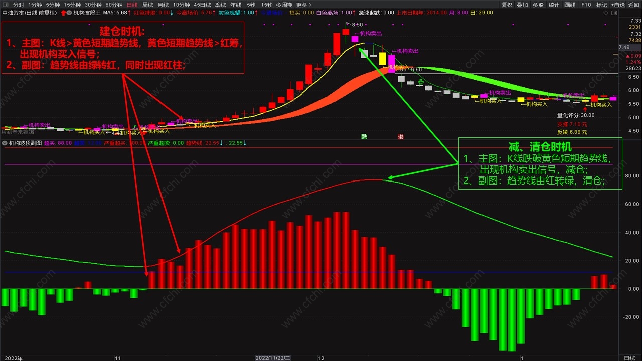 1、主图:K线>黄色短期趋势线,黄色短期趋势线>红筹,出现机构买入信号;