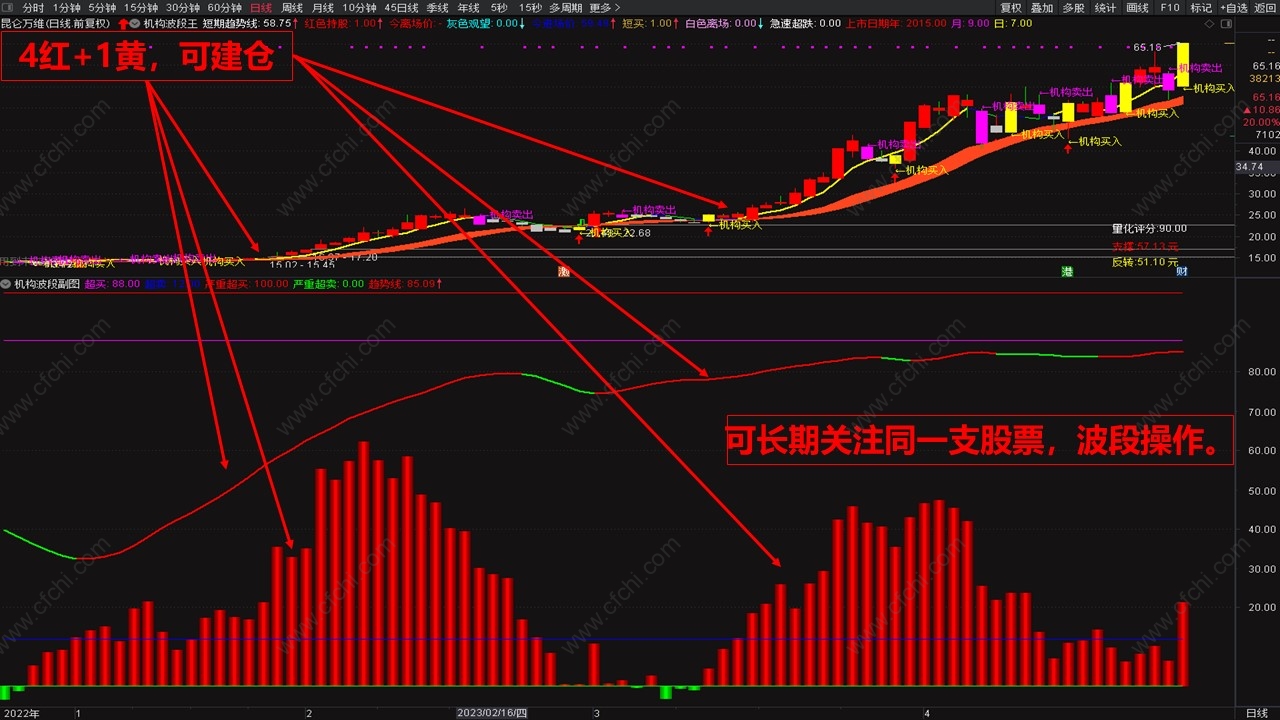 2、股价>黄色短期趋势线,黄色短期趋势线>红筹波段:K线呈红色,股价上涨概率高,可持股待涨,直到K线跌破短期趋势线,可考虑减仓。