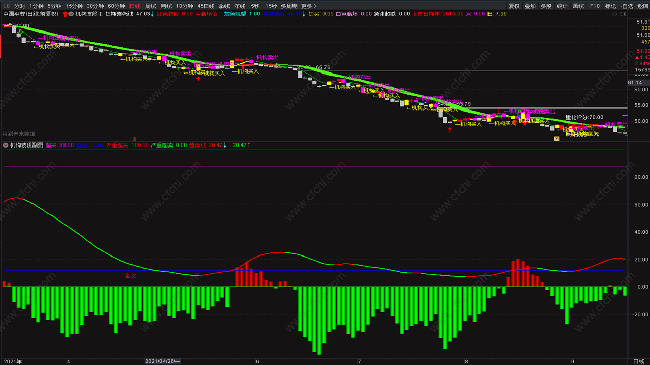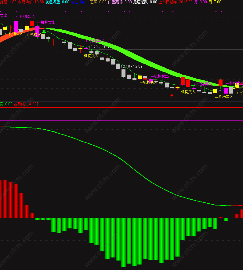 本指标简单明了:有 机构买入、机构卖出、灰色K线观望等提示,大家可参考提示进行操盘。