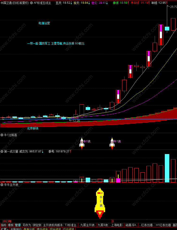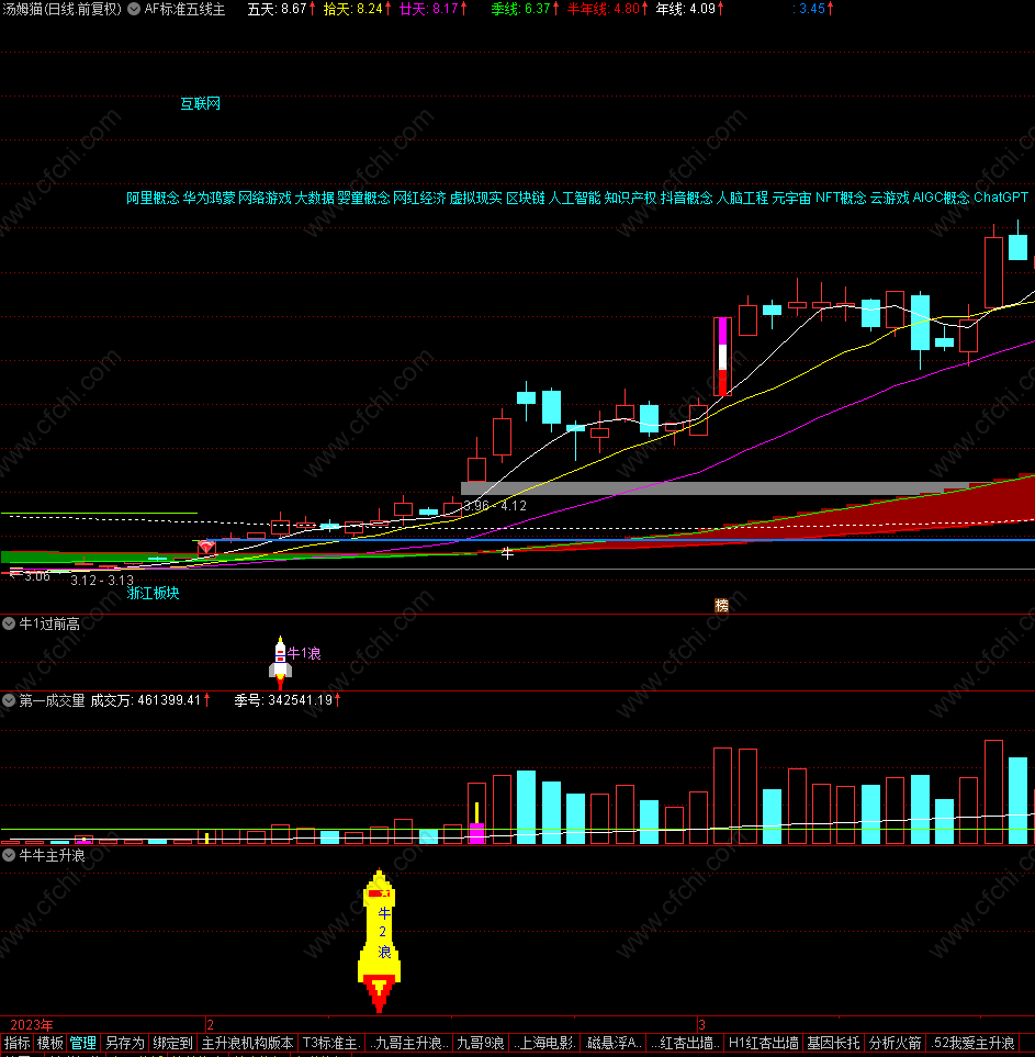 指标之王强势股.我爱量过前高.继牛股基因主图.涨知识的庄K线战法,之2量过前高.盘中提示突破.成交量没办改变缩小..盘中只有增加量.战法更加真实.信号不会改变.选股能知道当前热点股票.主图电脑内容更多.手机只有显示区域.板块.图片主图指标1个.附图3个.条件选股2个.和附图同步.选股主升浪大火箭.为主.小火箭提前