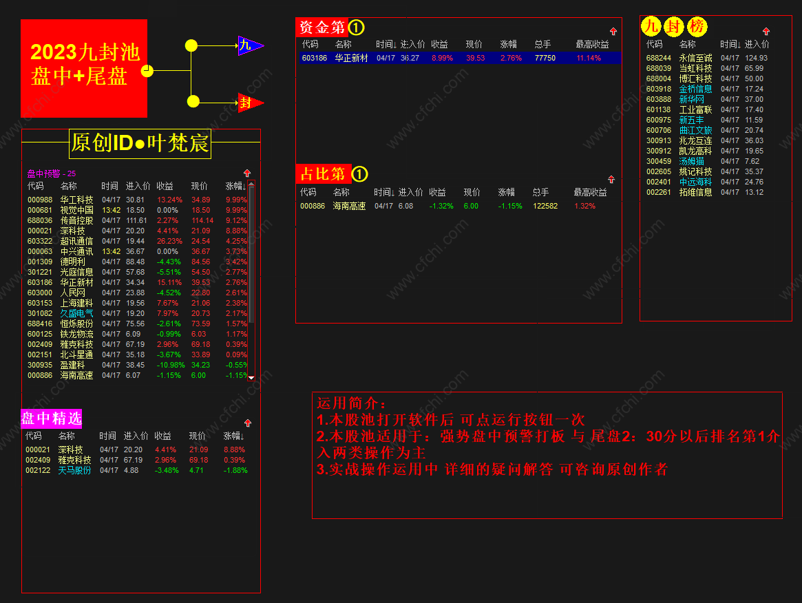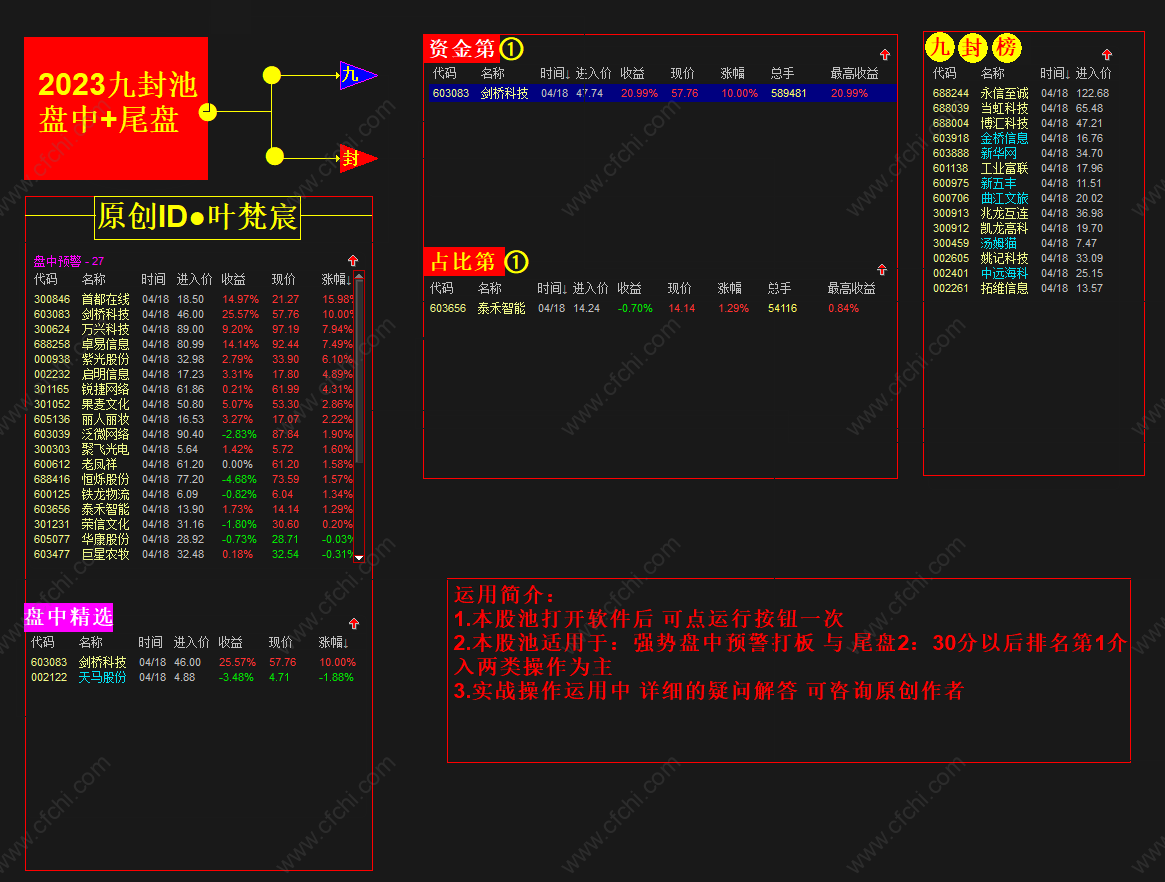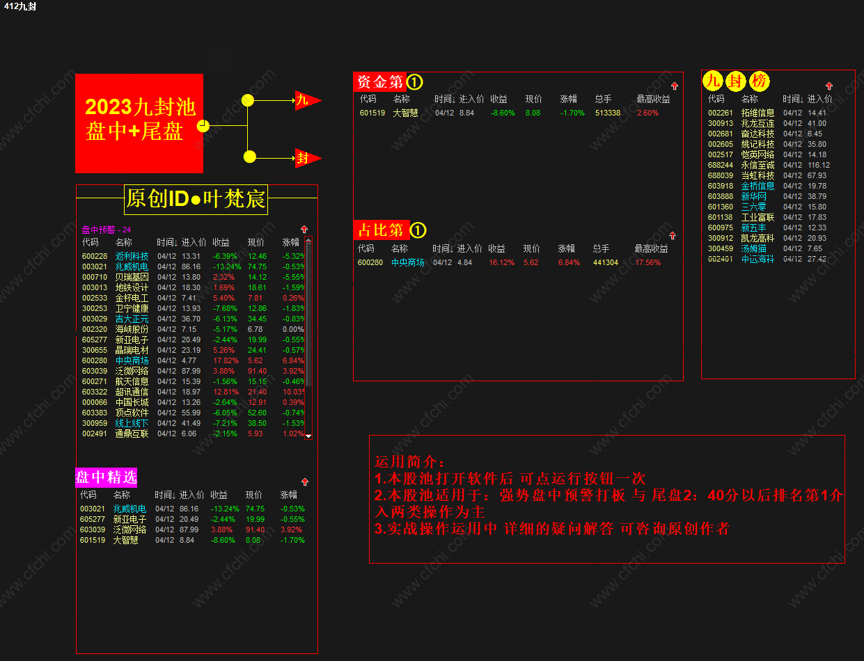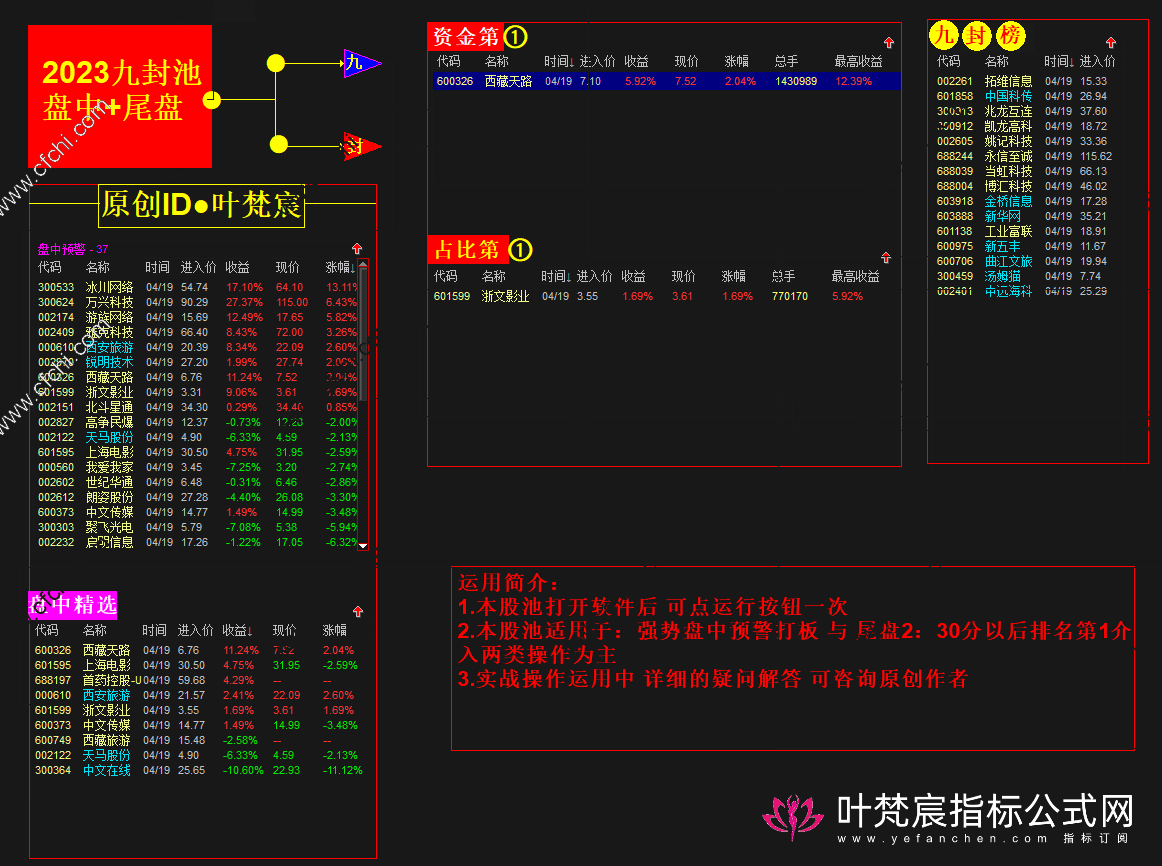 | 2023九封榜池《资金第1+占比第1+九封榜单》原创精品之一 本股池!配套于 九封至尊指标专用为主 已订阅过2022九封至尊指标 可直接领取 九封指标功能介绍:采取盘中资金模式 根据强势信号拉伸设计 相结合的新颖操作风格 捕捉信号最佳入手时机 适用于:盘中预警介入 尾盘选股资金打分排名第1 两种类型操作 本股池功能介绍:自动每天尾盘入选2支第1 包含:资金第1 占比第1 与 九封榜单 资金第1:九封净流入排名第1(入选 资金栏) 占比第1:当天净流入资金占比第1(入选 占比栏) 九封榜单:自动统计近期九封信号翻倍或 大幅度拉伸 (入选榜单栏) 本指标采用网络验证DLL加密 提供两种安装方法二选其一: 可安装到自己看盘软件中 + 己安装好2023九封榜池软件 (对新手或 不会安装朋友 提供便利 无需安装 找楼主 领取:帐户号) 订阅需知: 1. 本指标提供两种安装方式(己安装好指标软件 与 安装到自己软件 )- 2. 本指标 采用DLL加密 订阅后 找楼主开通使用权限 3. 本指标是套组合指标共有1个主图+2个副图+2个选股+1个打分指标 信号层次进行划分 具体使用看下功能说明 或咨询楼主本人 4. 已订阅的朋友前期使用 不太熟悉功能的运用 可帖子留言或驿站交流: 5. 本指标一经订阅,概不退换,请看清楚才订阅,本指标 不带未来函数,信号收盘后不漂移 使用无时间限制,为参考选股之用,股市不确定性较大,一切买卖和盈亏与指标无关~风险自负! 6. 帖子是个共享交流之地 如是同行朋友或恶意者,请绕道,不要捣乱。同样非常欢迎股民指标爱好者 提供良好建议和传授实战经验操作分享,促进共同进步。 4月11号《2023九封榜池》 ![]() 4月12号《2023九封榜池》 ![]() 4月14号《2023九封榜池》 ![]() 4月17号《2023九封榜池》 ![]() 4月18号《2023九封榜池》 ![]() 4月19号《2023九封榜池》 ![]() |