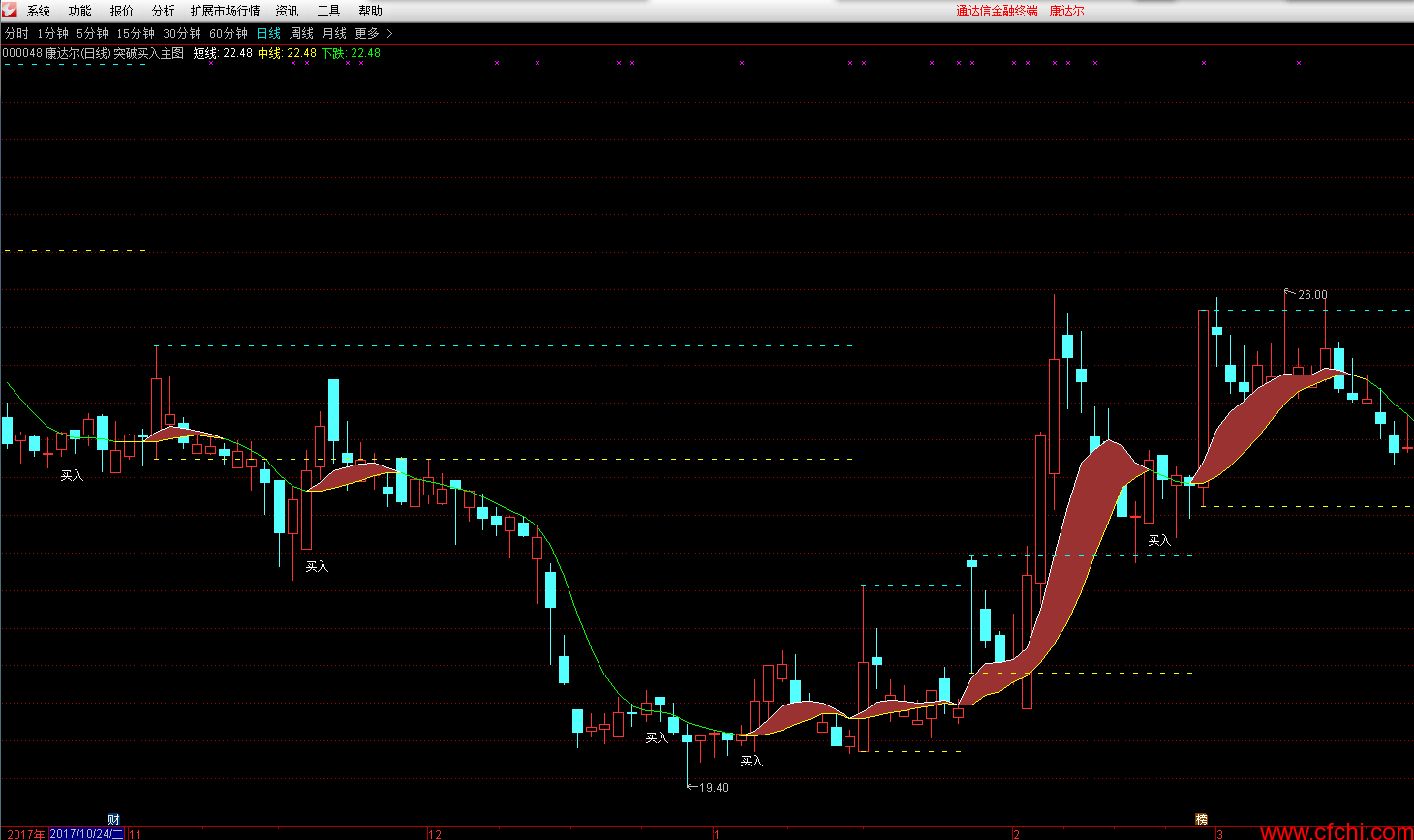 DRAWTEXT(O<中线 AND C>短线 AND REF(C,1)<下跌,L*0.99,'买入');
