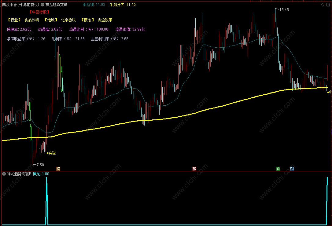 黄线为牛熊分界线,代表长期趋势。细蓝线为中枢生命线,代表短线波段。原则上,只有运行在牛熊黄线上的股票才有操作价值,线上牛股,线下熊股,那些长期运行在黄线下的股票多为弱势股,应尽量回避!