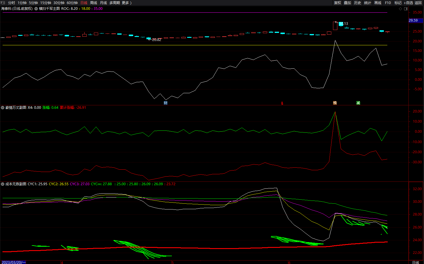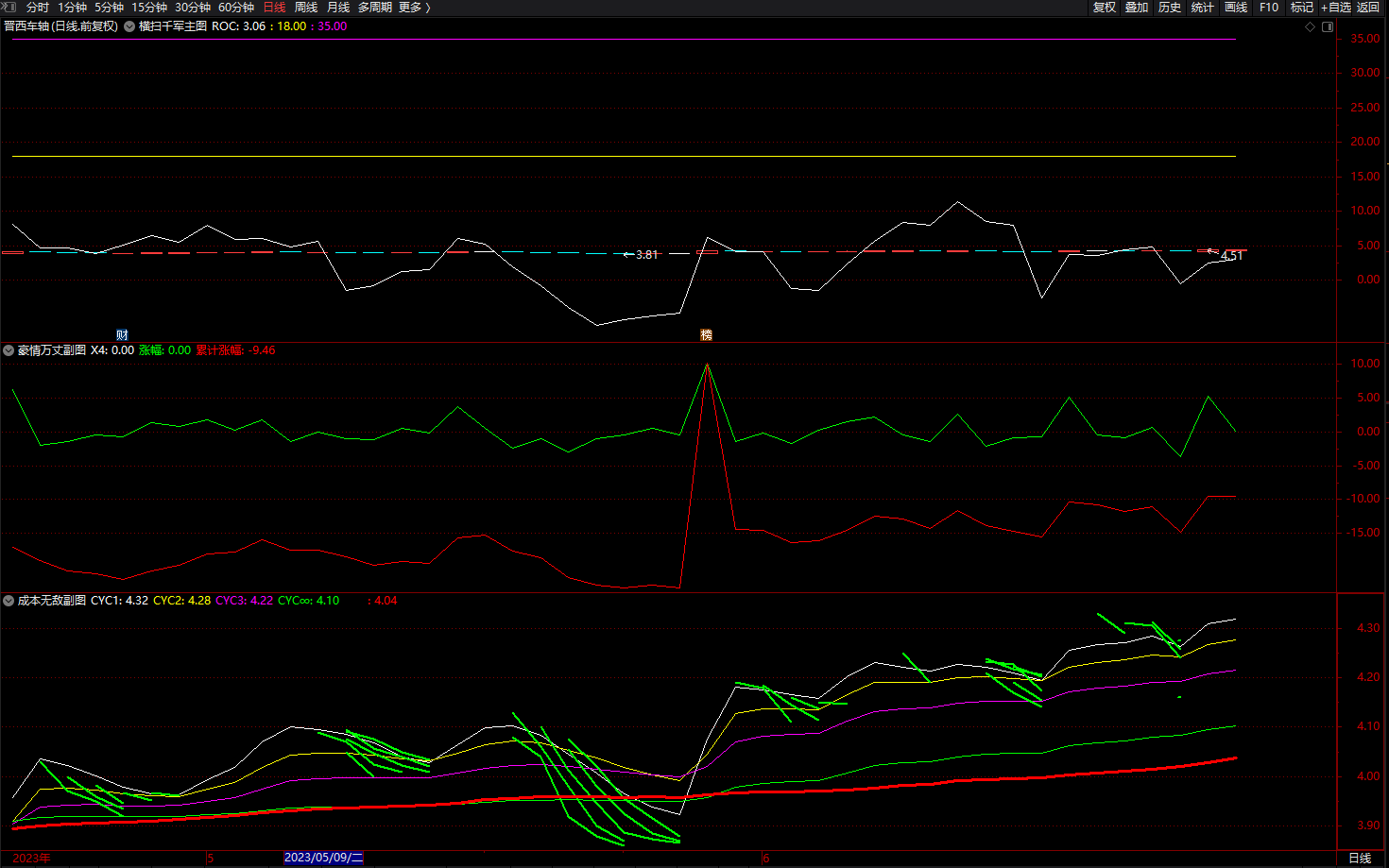 2、主图成本无敌主要是由成本均线演化而来,当主图指标“成本无敌”出现绿色曲线时,此时我们持股,绿色曲线消失时我们持币。同时对于股价站上60日均线即大红粗线,成本无敌向上发散,此时就是我们打板时重点关注的对象。