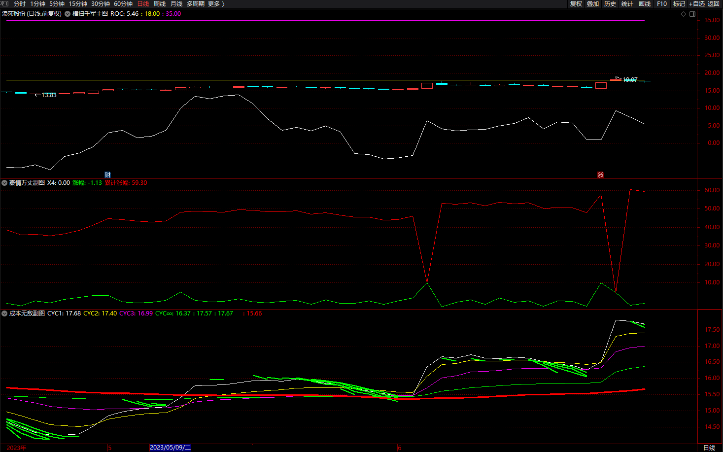 4、横扫千军作为本战法的压轴指标,主要是根据指标中的ROC来判断可以操作的个股,一般ROC位于红线和黄线之间,即ROC指标在18——35之间,此时就是我们打板操作的对象。