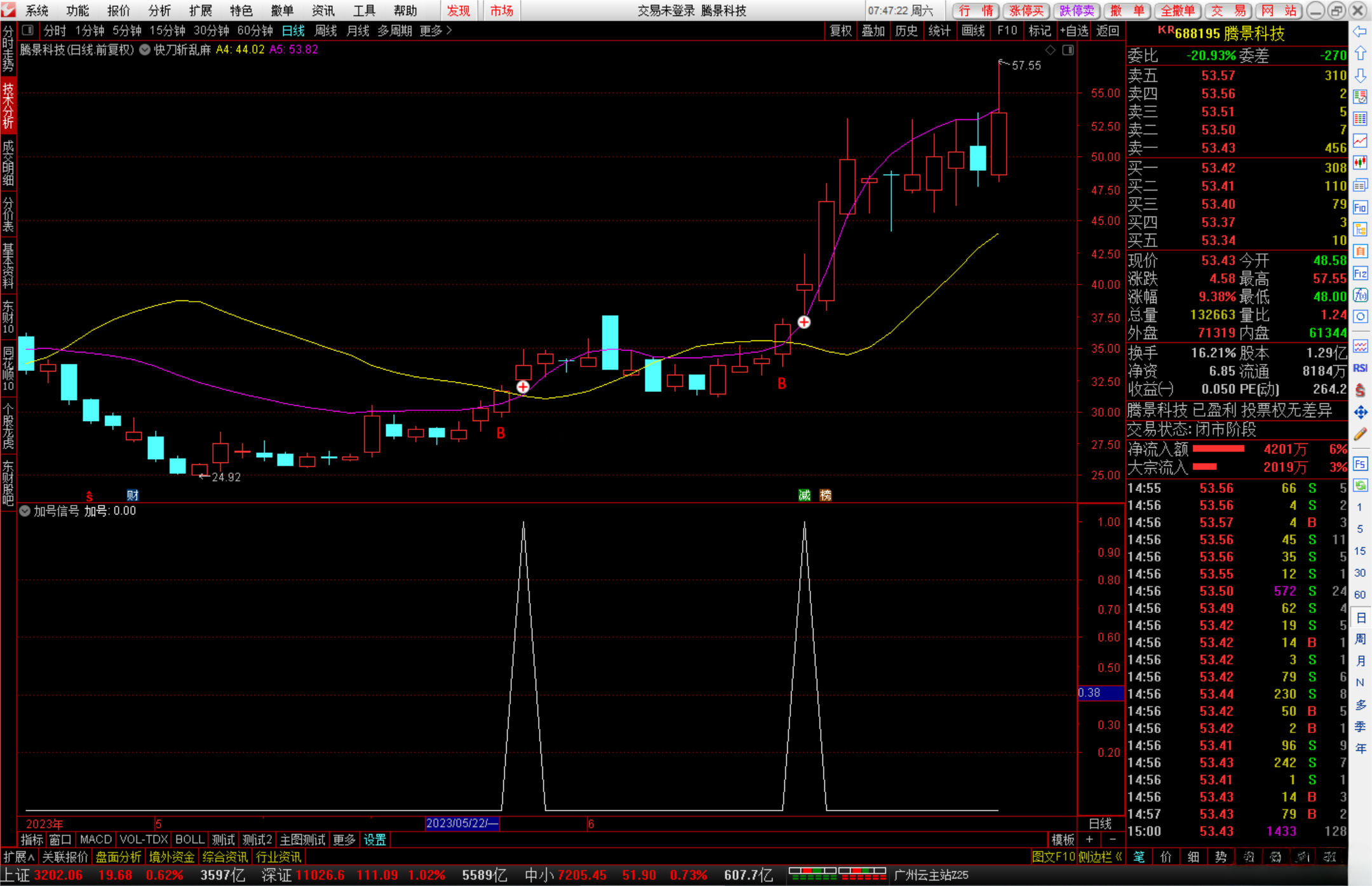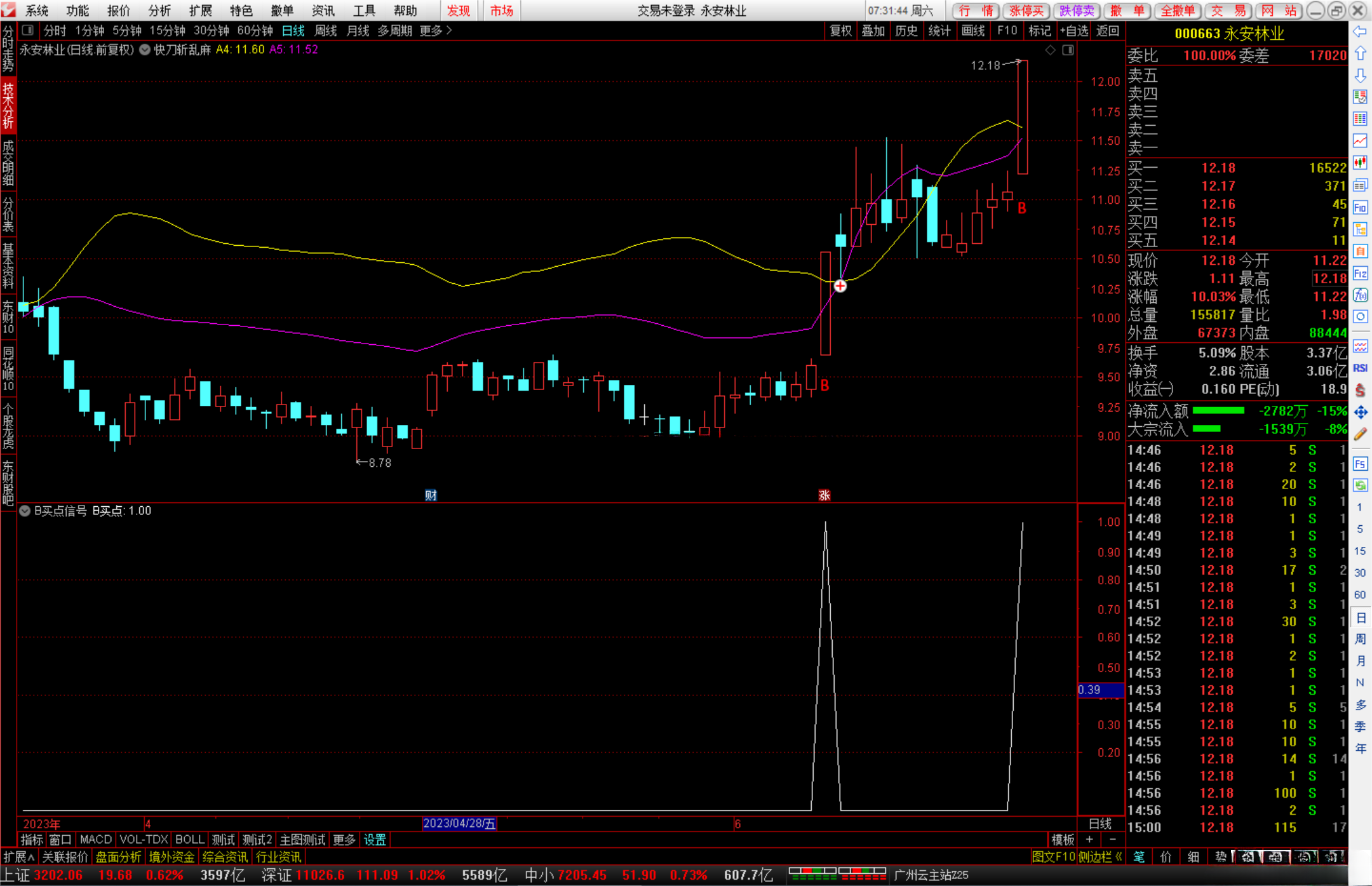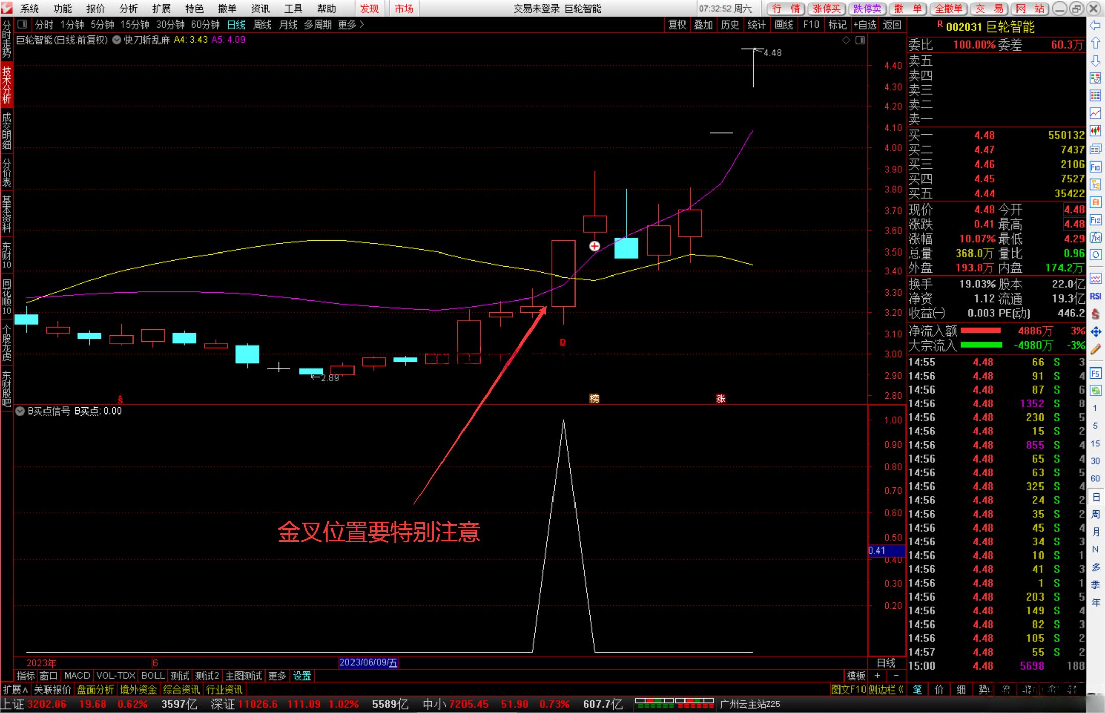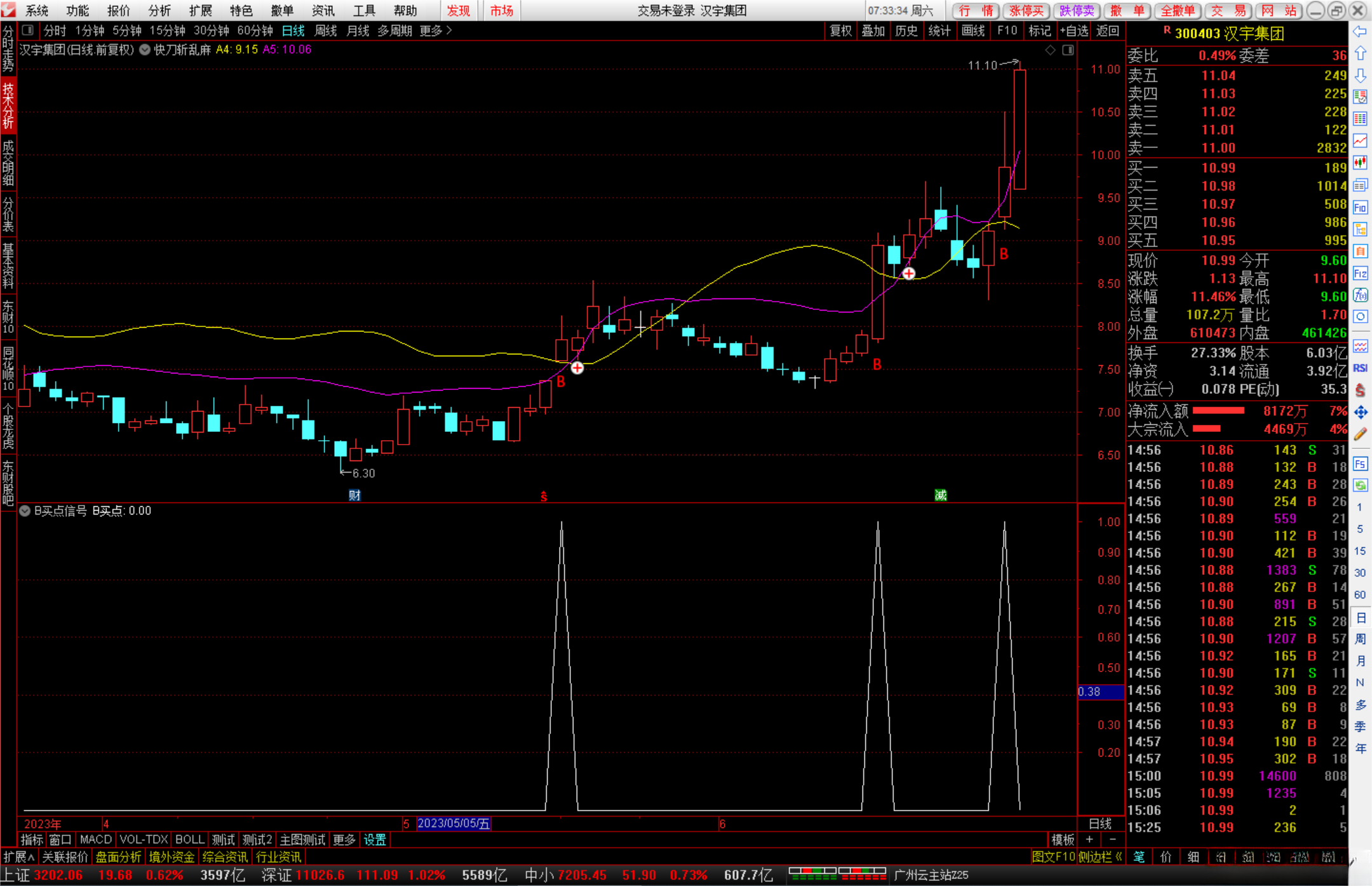 适用于短线抓涨非常好,特称之为快刀斩乱麻,主图B点就是短线买点,一般用于盘尾14:50选股买入,注意观察主图两线金叉的B信号尤为重要,次日一般能拉升!赚了跑都是对的!至于+号信号,稍微有点滞后,行情好的时候,可以用于加仓参考吧!因为有时候可以抓到大牛股哦!B点和+号的共振信号(也就是同时出现)也要特别注意!