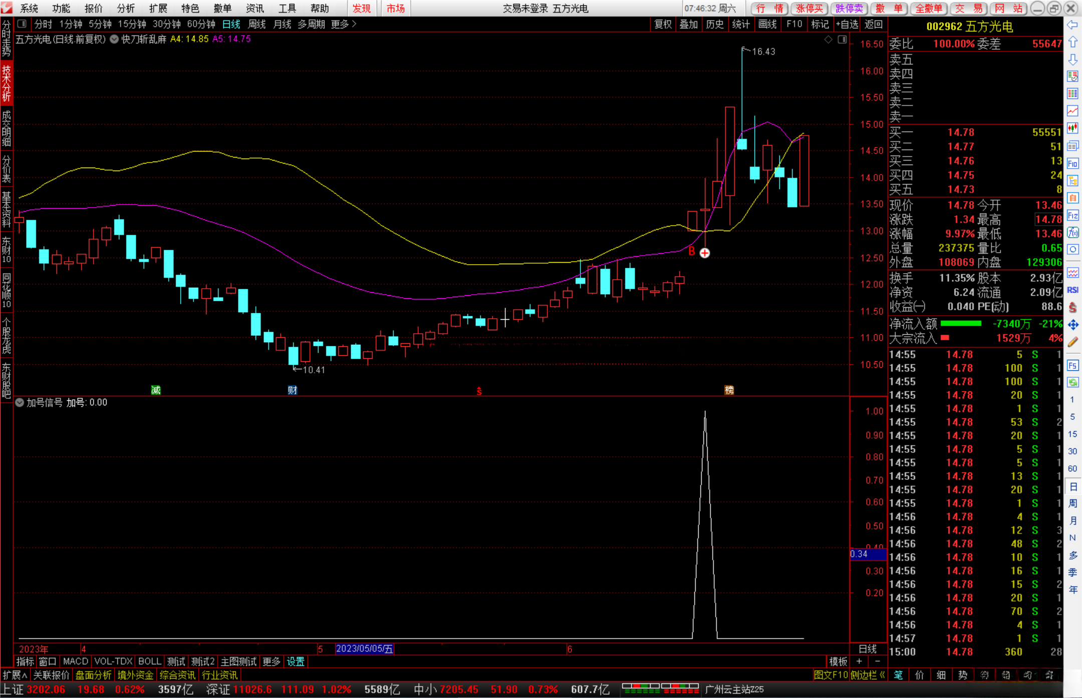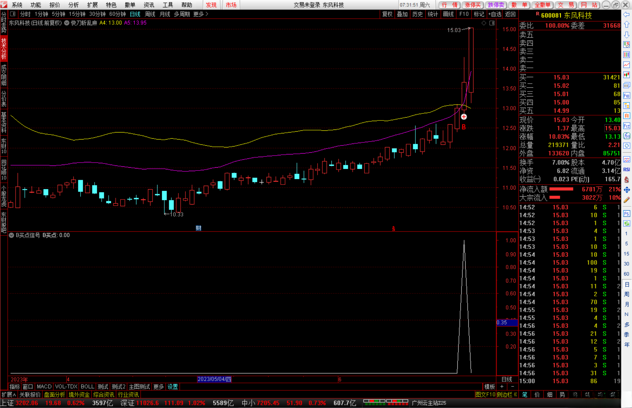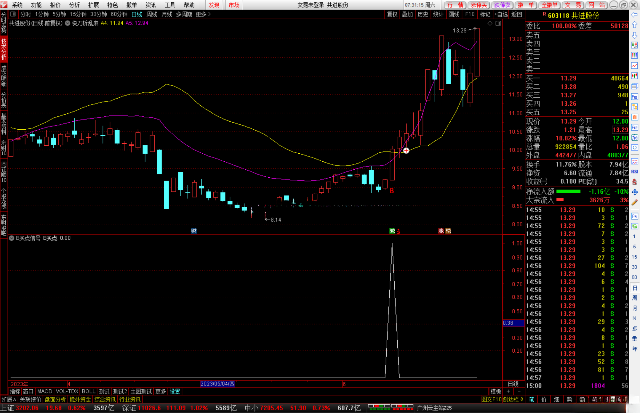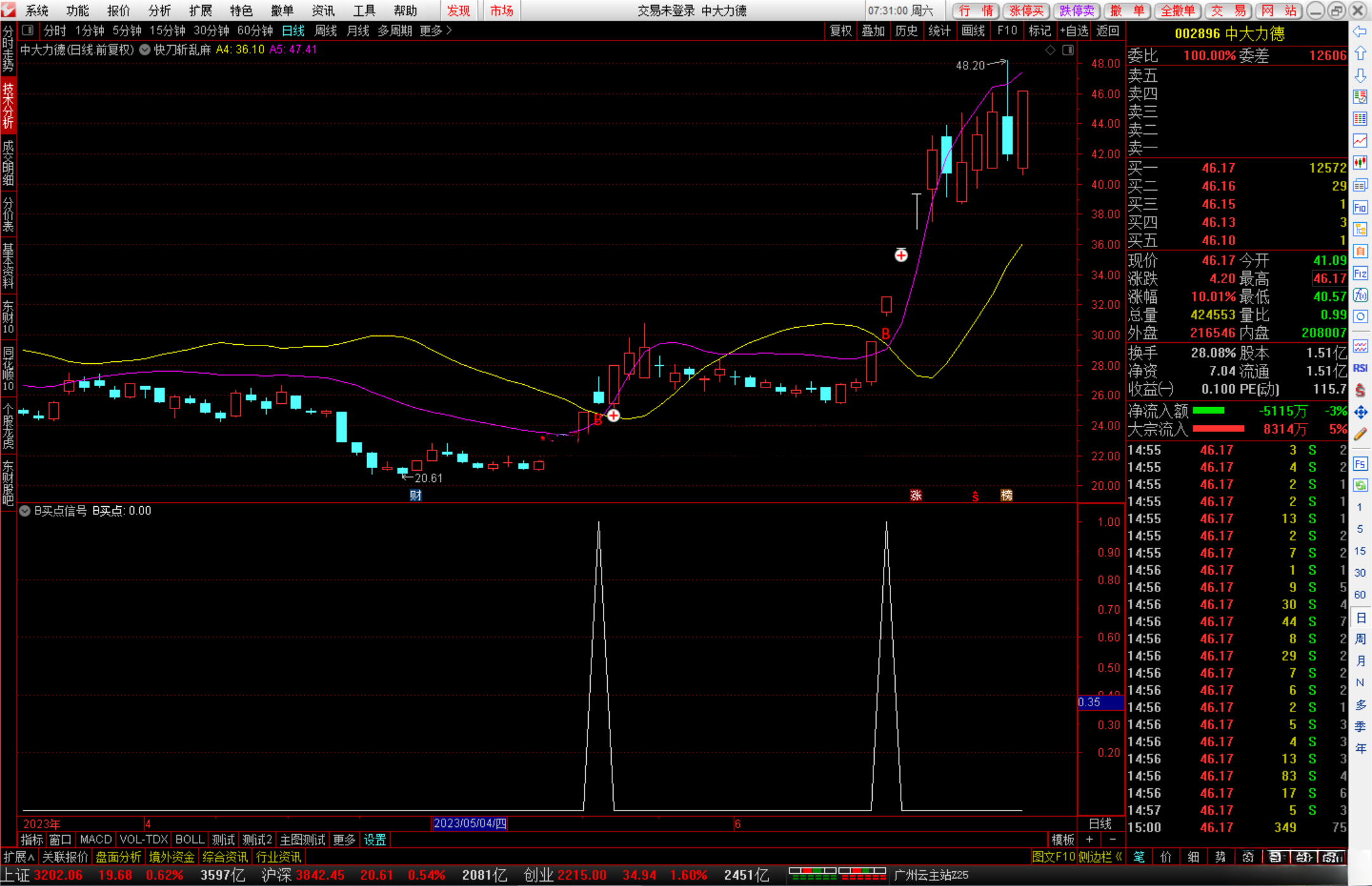适用于短线抓涨非常好,特称之为快刀斩乱麻,主图B点就是短线买点,一般用于盘尾14:50选股买入,注意观察主图两线金叉的B信号尤为重要,次日一般能拉升!赚了跑都是对的!至于+号信号,稍微有点滞后,行情好的时候,可以用于加仓参考吧!因为有时候可以抓到大牛股哦!B点和+号的共振信号(也就是同时出现)也要特别注意!