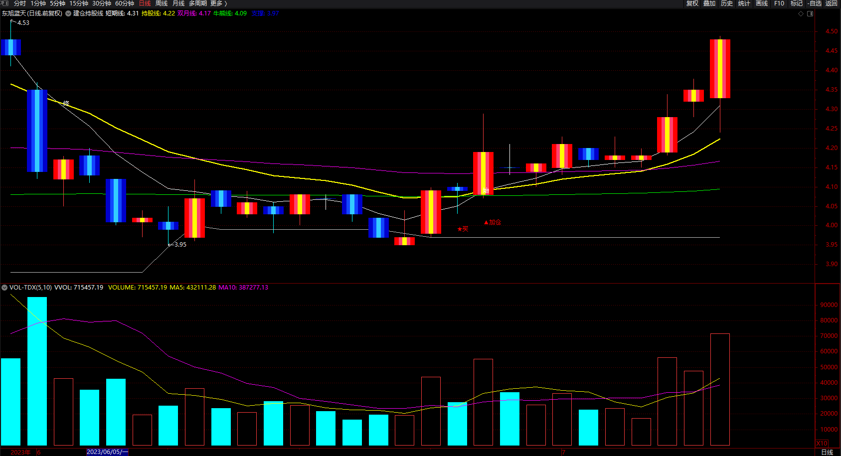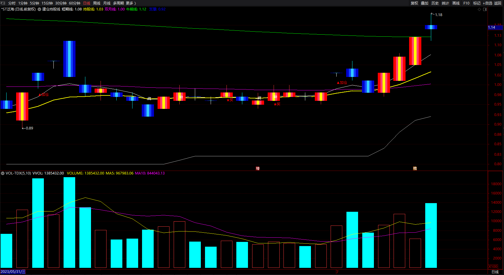 DRAWTEXT(CROSS(Y,X),(LOW * 0.985),'▲加仓'),LINETHICK2,COLORRED;