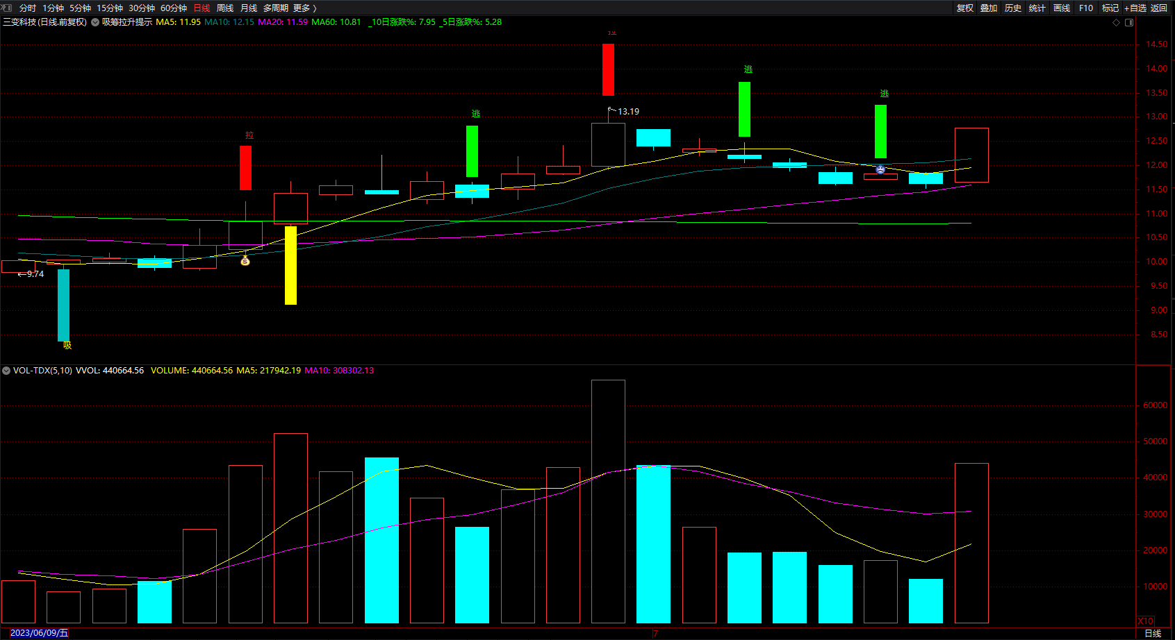 赚钱趋势指标公式 通达信实用的主力吸筹拉升逃顶提示 主图 源码