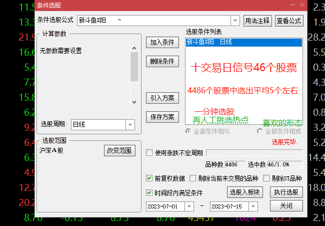 指标之王.强势股的摇篮 源码背离选股.大鱼续优化.新的斗鱼指标战法主图平台.清晰 附图信号显示.成交量平台和主题天线同步..条件预警@选股.4个指标.比较容易把握.全天预警选股.配合形态量能效果更好.一天选股一分钟左右在4000多个股票中选股信号5个股票左右.选择热点板块.选股看行业活跃操作.这样我们选择股票一天1到2个.破解庄拉升前过程.过滤没有热点的.新手挑选强势股失败后面的回踩回马枪.成功率非常高.牛股票的发源地.公式中选股绝无未来函数.信号出现就不会消失.流通盘大小:=CAPITAL<N;未来函数=CAPITAL.这个不算