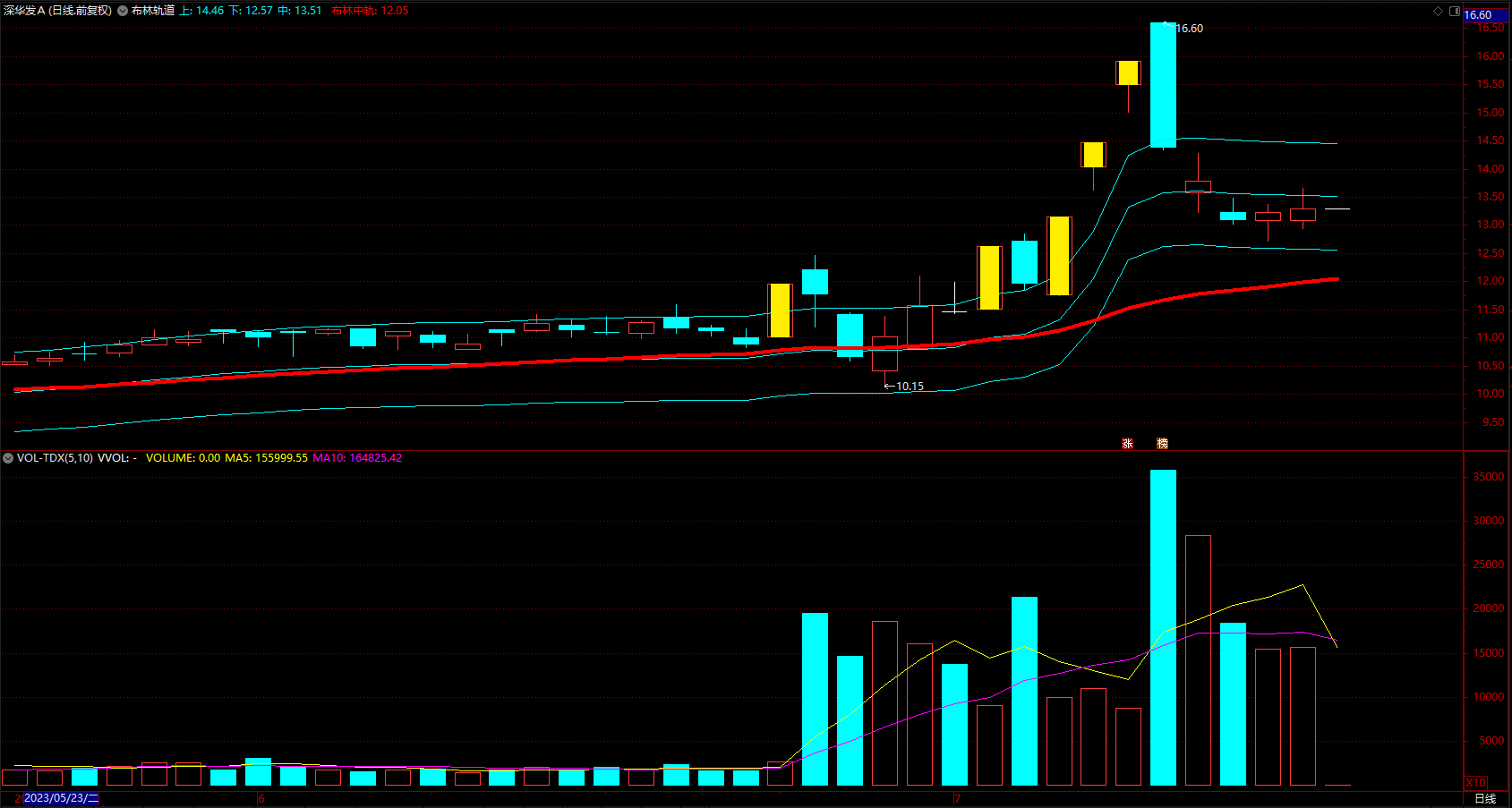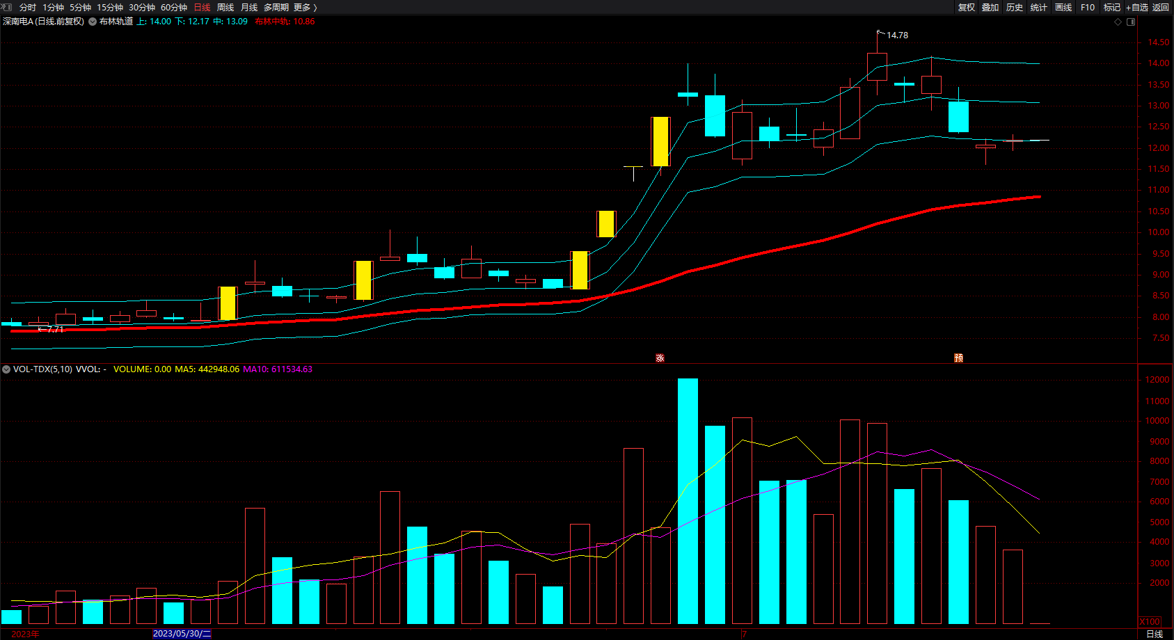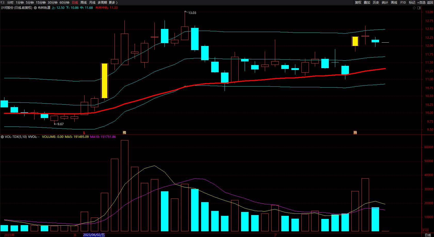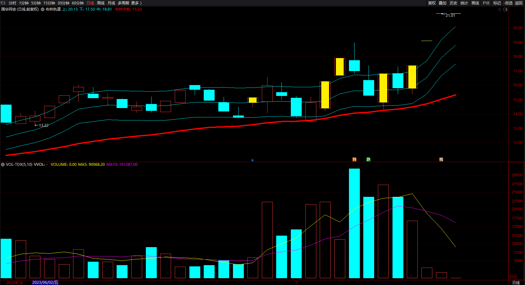 布林中轨:SMA(C,20,1),COLORRED,LINETHICK4;