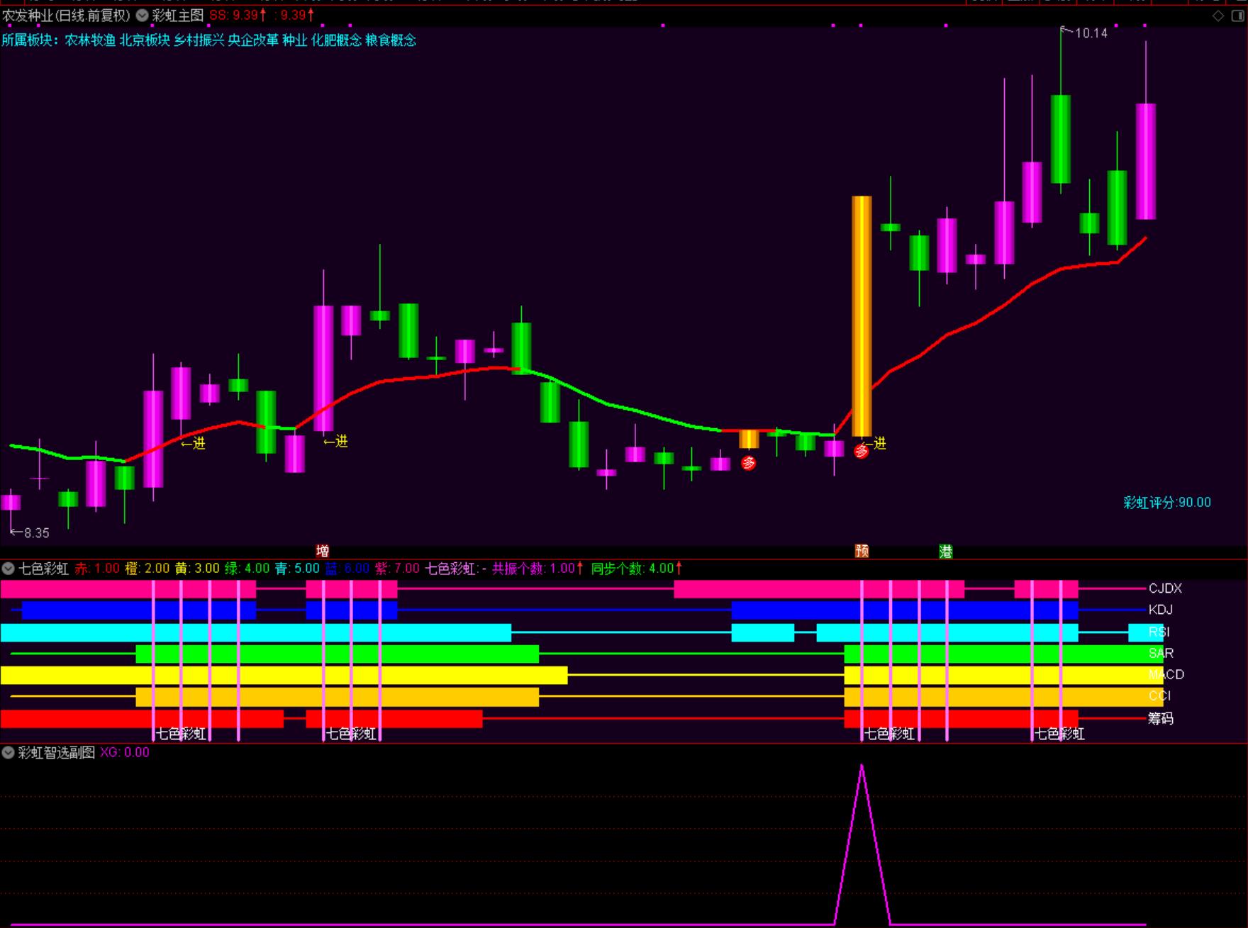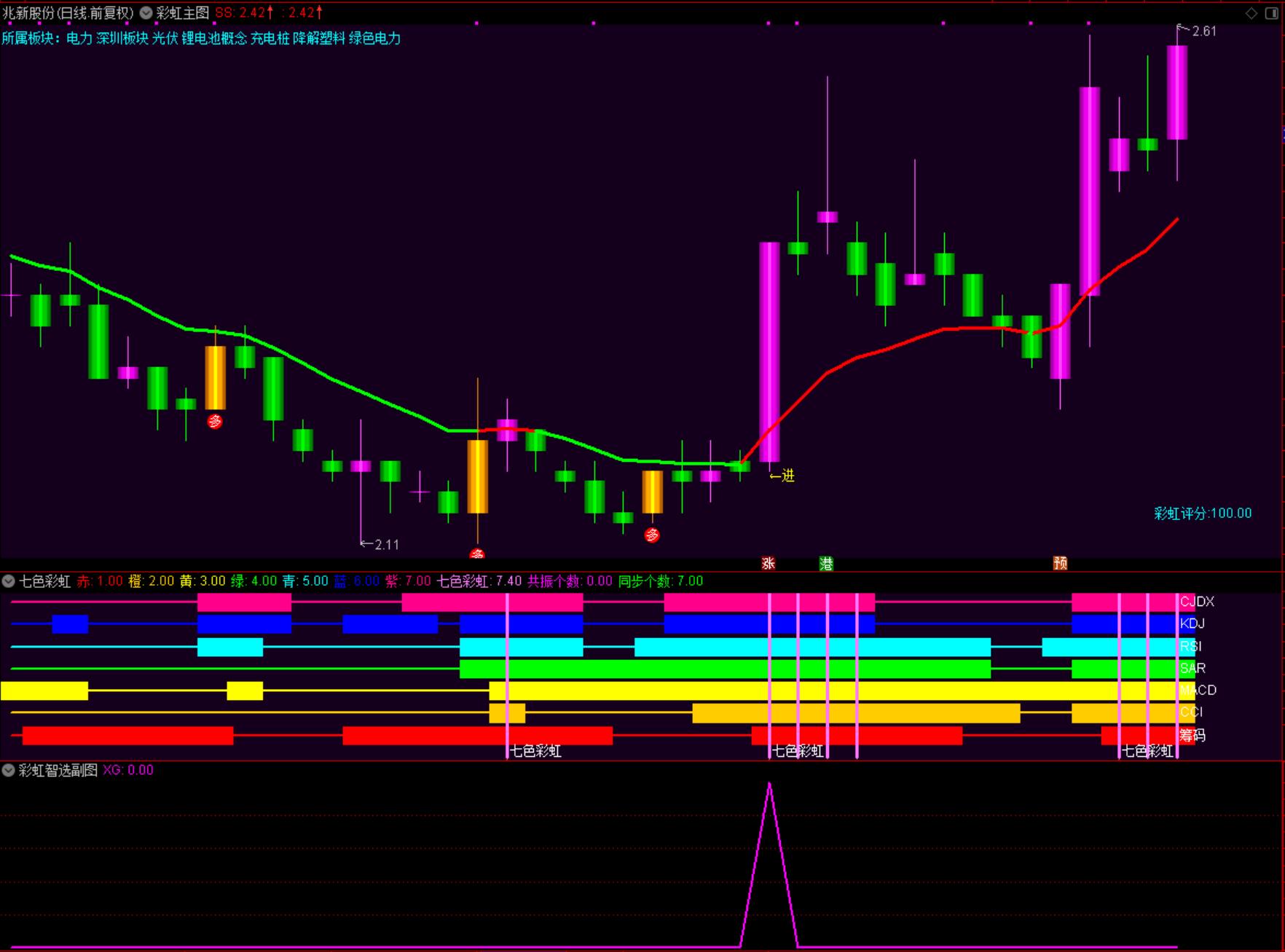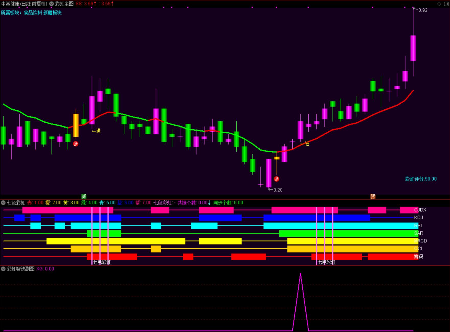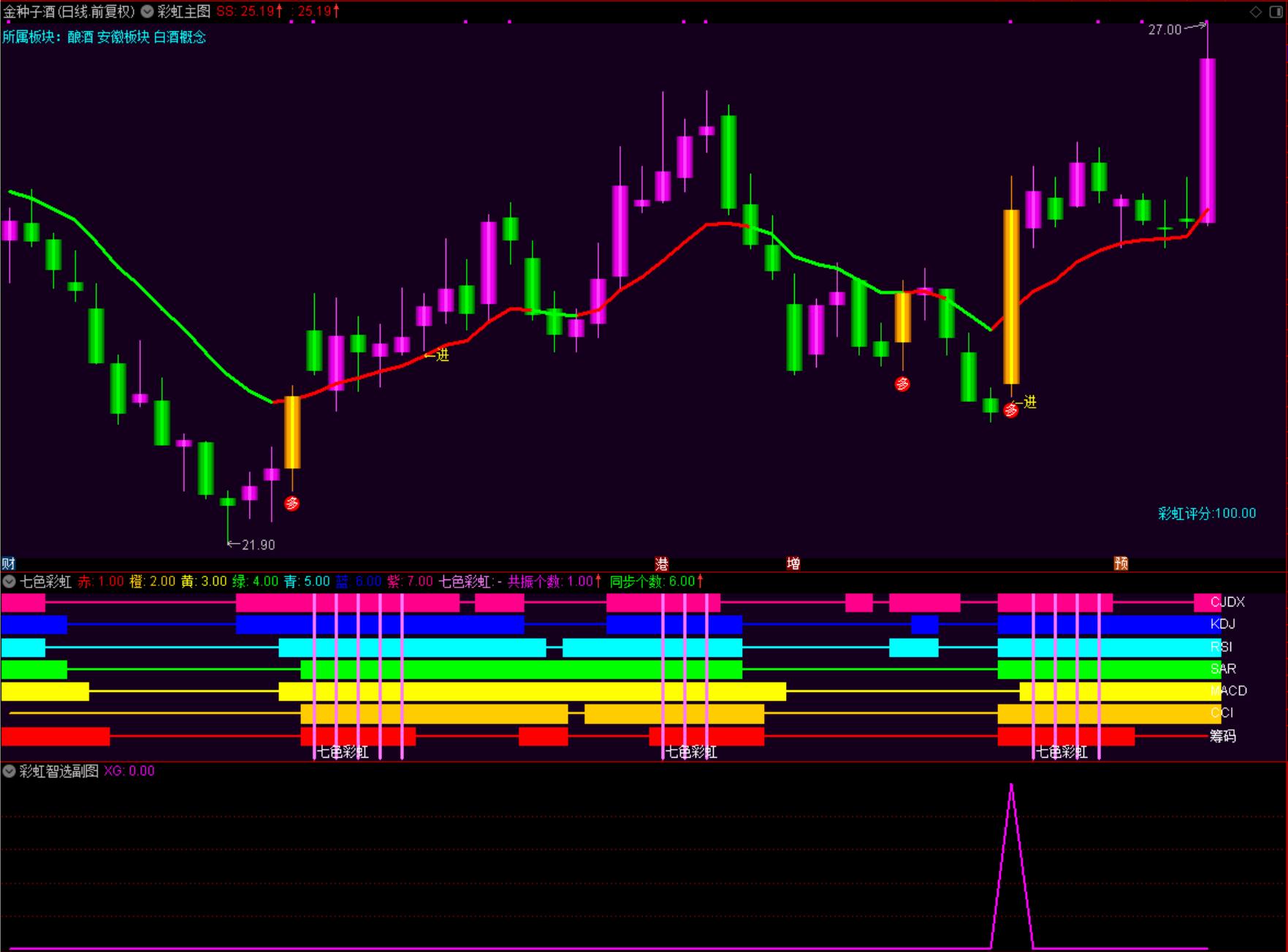 4.七色彩虹出现共振时(共振:粉线划过全部彩虹)+进/多—买卖信号:多看多,见进则进,前多后进 结合粉柱,如无假进,如有真进