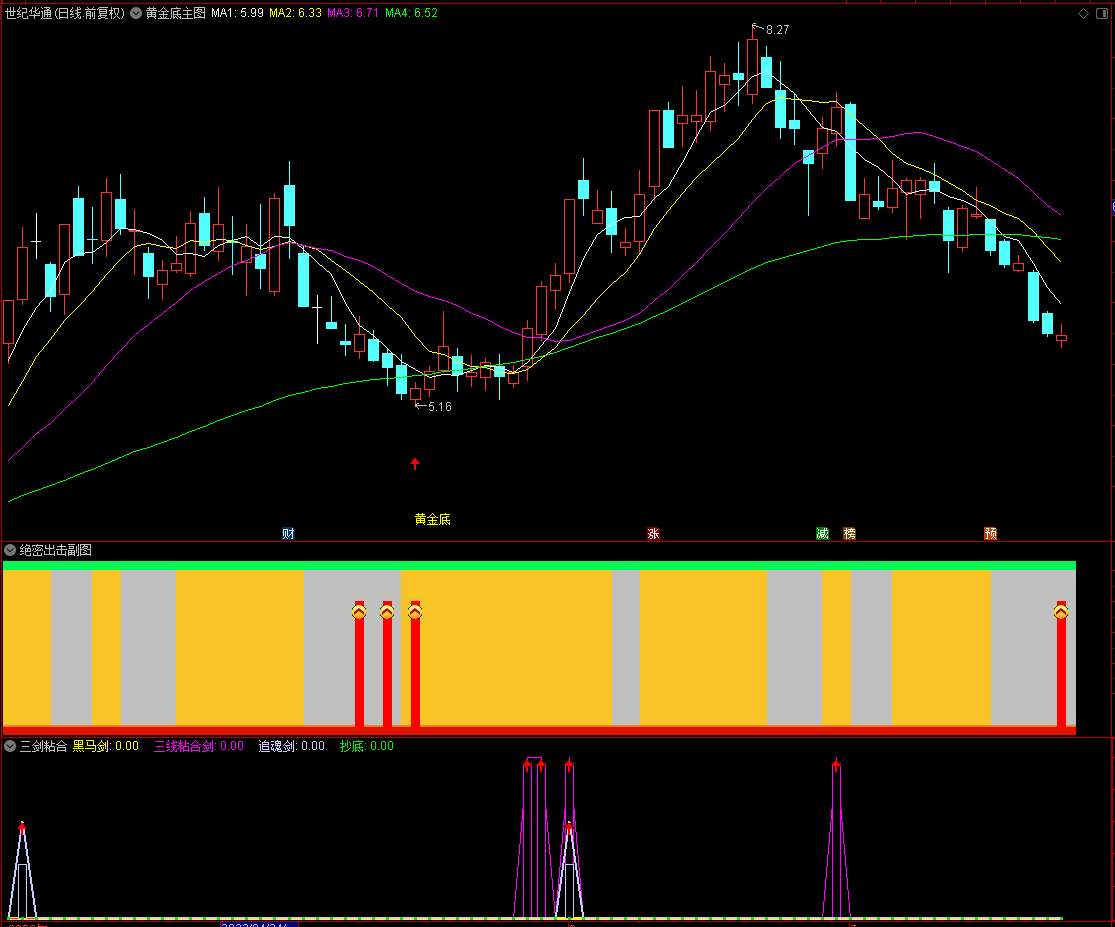 指标包含:黄金底主图+三剑粘合副图+绝密出击副图/选股公式,经过多轮优化,值得收藏的一款抄底类工具;源码无未来!