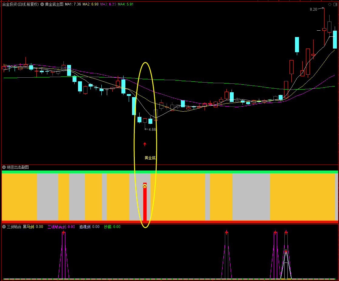 (【通达信】黄金底主图+三剑粘合副图+绝密出击副图选股指标,源码分享)