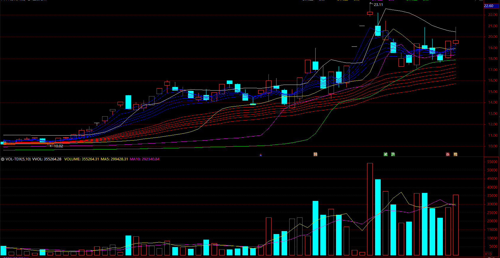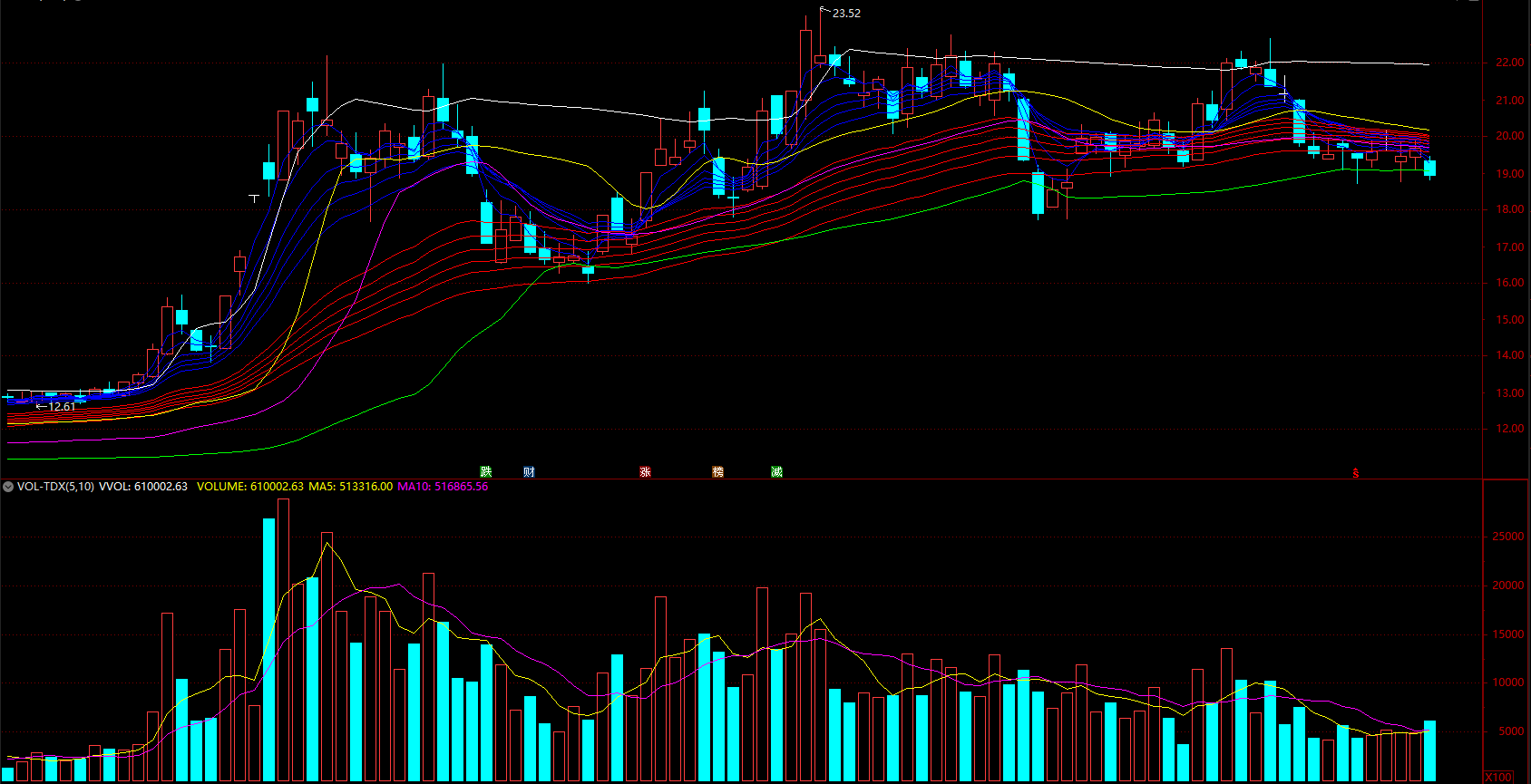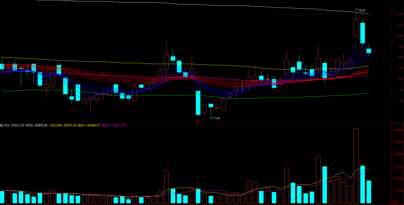 蓝色的为短中期类均线系列,红色的为中长期类均线系列,当均线粘合后多头发散时候可以考虑试探性买入。